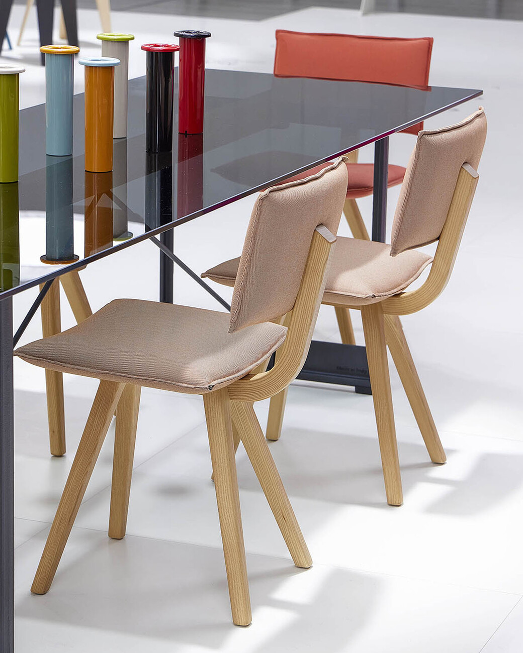Alberto Brogliato: Basically, just about all shapes have already been used for a chair. So we were interested in a chair of solid wood with bentwood elements whose craftsmanship is evident. Then we looked at how this type of chair is produced and considered how we could adapt the design. Subtraction is one method we like to work with – what is left when we concentrate on the core of the structure and say remove the backrest and seat area? So the solid bentwood is the heart of “Trave”", which is joined with all the other elements. When we presented the final result to the Magis team they told us we had developed a new kind of design for a wooden chair. That was a brilliant moment. The challenge was to ensure this new structure was as robust as possible so that it would withstand all the necessary tests. It takes several weeks to prepare the wood for bending and get it into the desired shape. And apart from two screws for affixing the seat and back cushions we wanted to do without metal parts in our structure. This makes the structure like a puzzle and most of it is hidden inside. This is a typical approach for Magis, combining traditional craftsmanship with an extraordinary, advanced process to create a unique product.