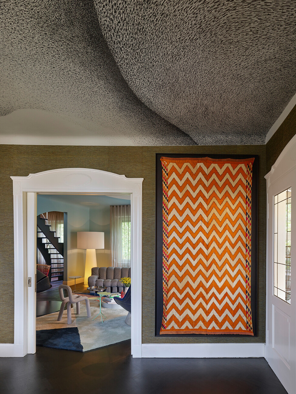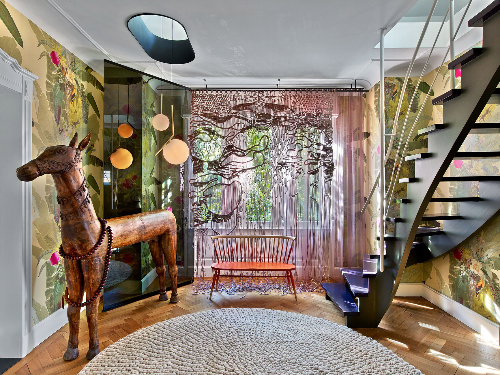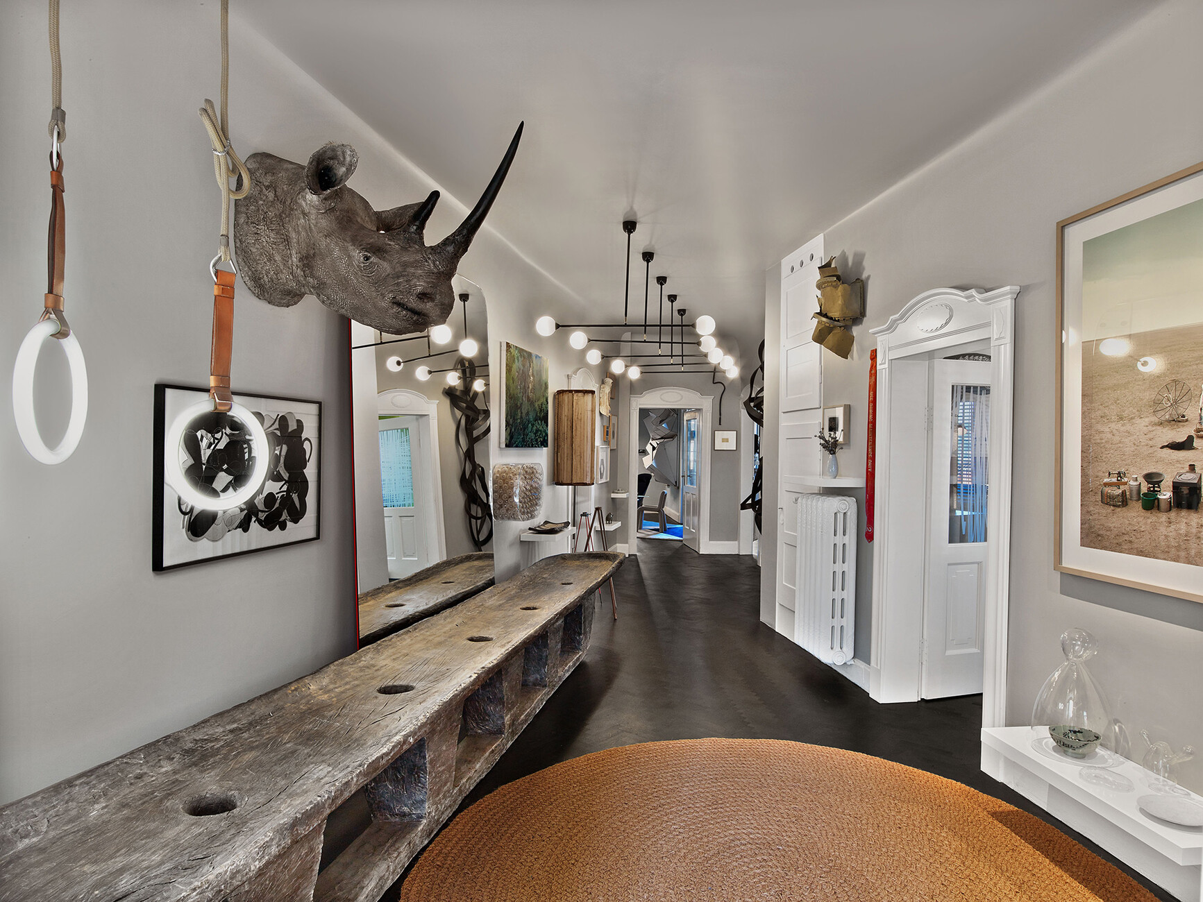 This was accompanied by structural and design challenges, including the floor plan with its pointed shape. In addition, there was the protection of historical monuments, which is why the room layout and the original interior fittings were subjected to careful modernization. Peter Ippolito and Stefan Gabel pursued a strategy that oscillates between subtle appropriation and preservation of the building's identity: the apartment looks like a hodgepodge of personal mementos and furniture from the two residents, some of which was collected on numerous trips. These include, for example, a life-size wooden horse or an antique wooden bench from India. In addition, there are various design classics or specially made furnishing elements. The design signature of Peter Ippolito and Stefan Gabel can be read despite the design diversity of the individual rooms, which can be seen, among other things, in the black herringbone parquet flooring as a connecting element, the asymmetrical wall openings or the consistent play with light and contrasts.