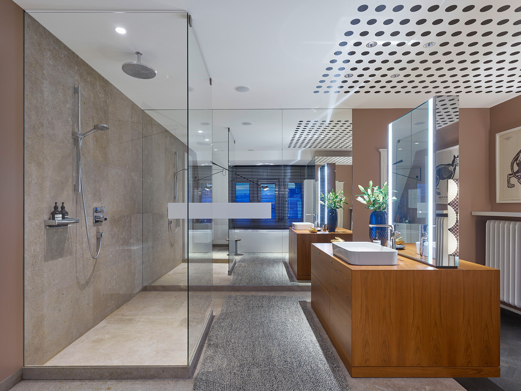 Peter Ippolito and Stefan Gabel paid special attention to the bathroom, which is equipped with faucets from the "AXOR Urquiola" collection. "In a concept where we talk about personality and distinctiveness, we naturally looked for a faucet that would deliver both. An object that fits into the design concept on the one hand, and on the other hand also makes a ‘self-confident’ contribution within this collection of personalities. And that's why we were very happy to choose AXOR Urquiola, which we've always liked and fits in very well here," says Peter Ippolito, who is managing partner of the Ippolito Fleitz Group. To this end, the two designers arranged a vanity unit with a large mirror placed in the center of the room, around which the shower and bathtub are organized. The black wooden floor is also found here, but is replaced in the shower area by tiles in light shell limestone. These extend to below the ceiling and, in combination with the custom-made furniture and the salmon-colored painted walls, give the bathroom a very individual expression. The single-lever basin mixer from the "AXOR Urquiola" collection, with its asymmetrically arranged handle on the side and expressive details, blends into the overall ambience together with the matching bathtub thermostat, becoming part of a journey of discovery that comes to a successful conclusion in the P155 maisonette.