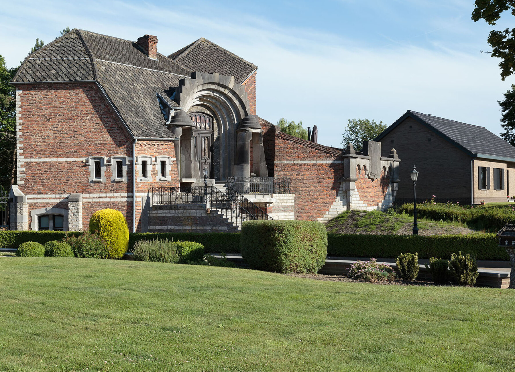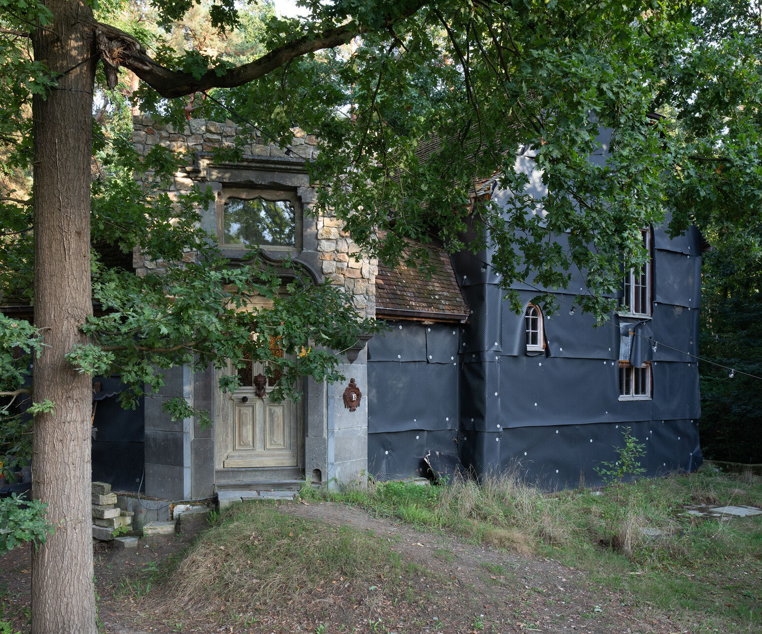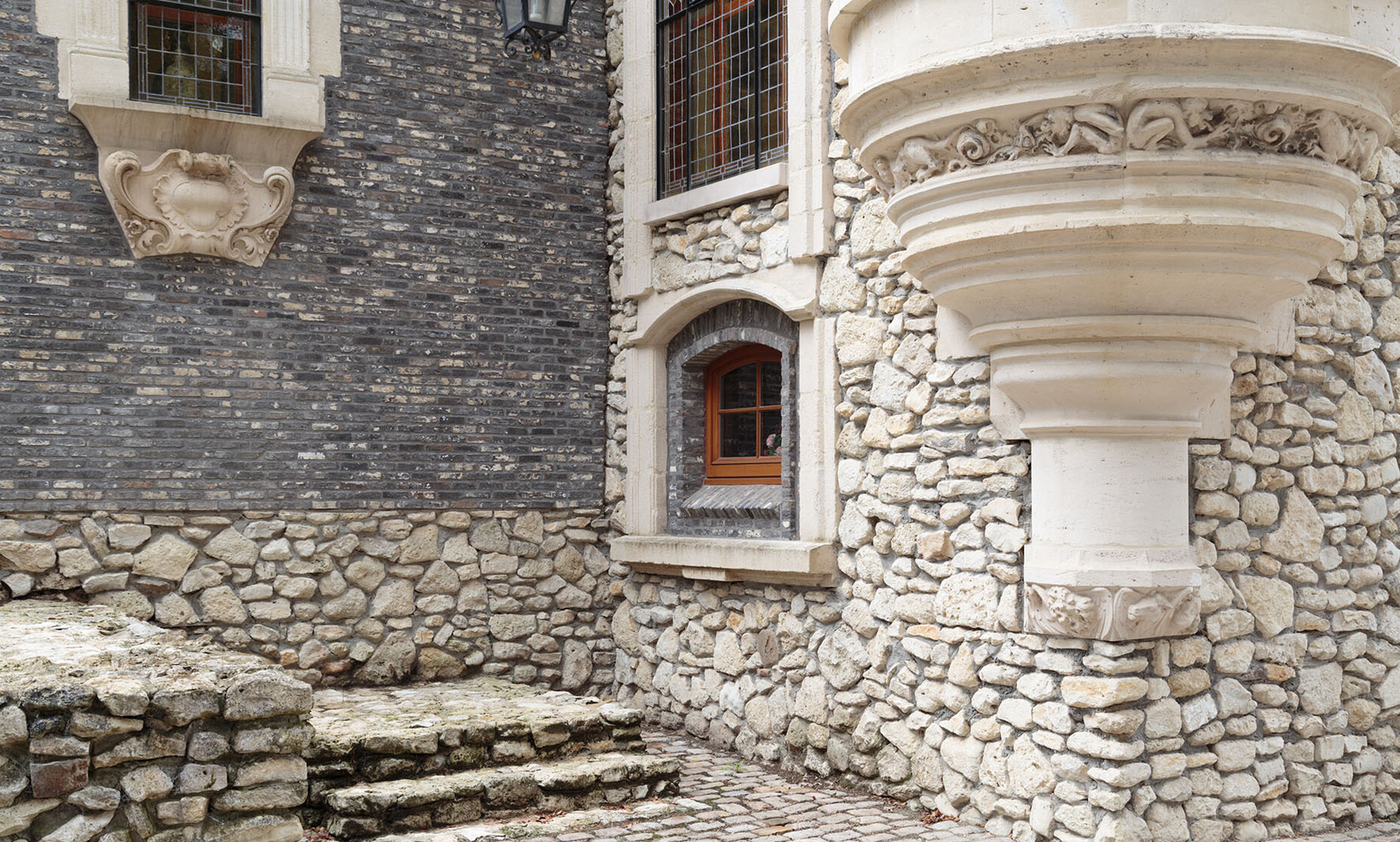 He got his first commissions from relatives and acquaintances. Raymaekers also designed a house for himself and his new wife Rita. These first buildings were still quite inconspicuous, with gabled roofs and brick chimneys, combining a gentle modernism with the elements that homes in that region customarily had. Raymaekers himself later described these houses as "completely insignificant". He was dissatisfied because he found the results of his own designs to be as bland as all the small new houses surrounding him, which was precisely the mediocrity that he wanted nothing to do with. But then something occurred that completely changed his way of doing things: In the late 1950s he came across a demolition company's salvage yard in Brussels, where he bought an attic staircase that he incorporate into one of his own designs. This brought him into contact with the "demolition scene" in Flanders, where business was booming at the time. During Belgium's post-war boom, historic buildings were being demolished everywhere to make way for new construction. The land was being “ploughed up” in the truest sense of the word. Raymaekers began to visit demolition sites to pick up materials and elements. At the same time, he studied art and then become an art teacher, which, he says, gave him a new appreciation of the material he was collecting as well as a more sculptural approach to it.