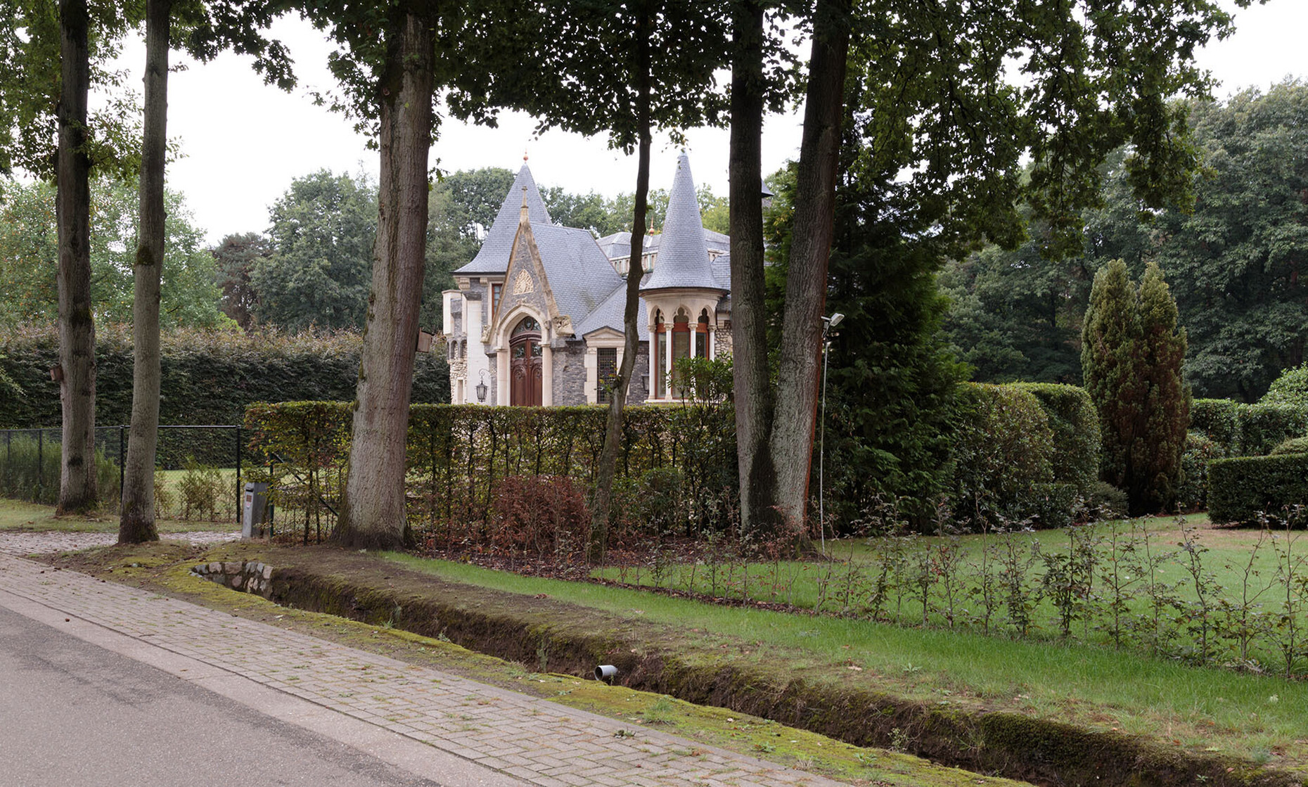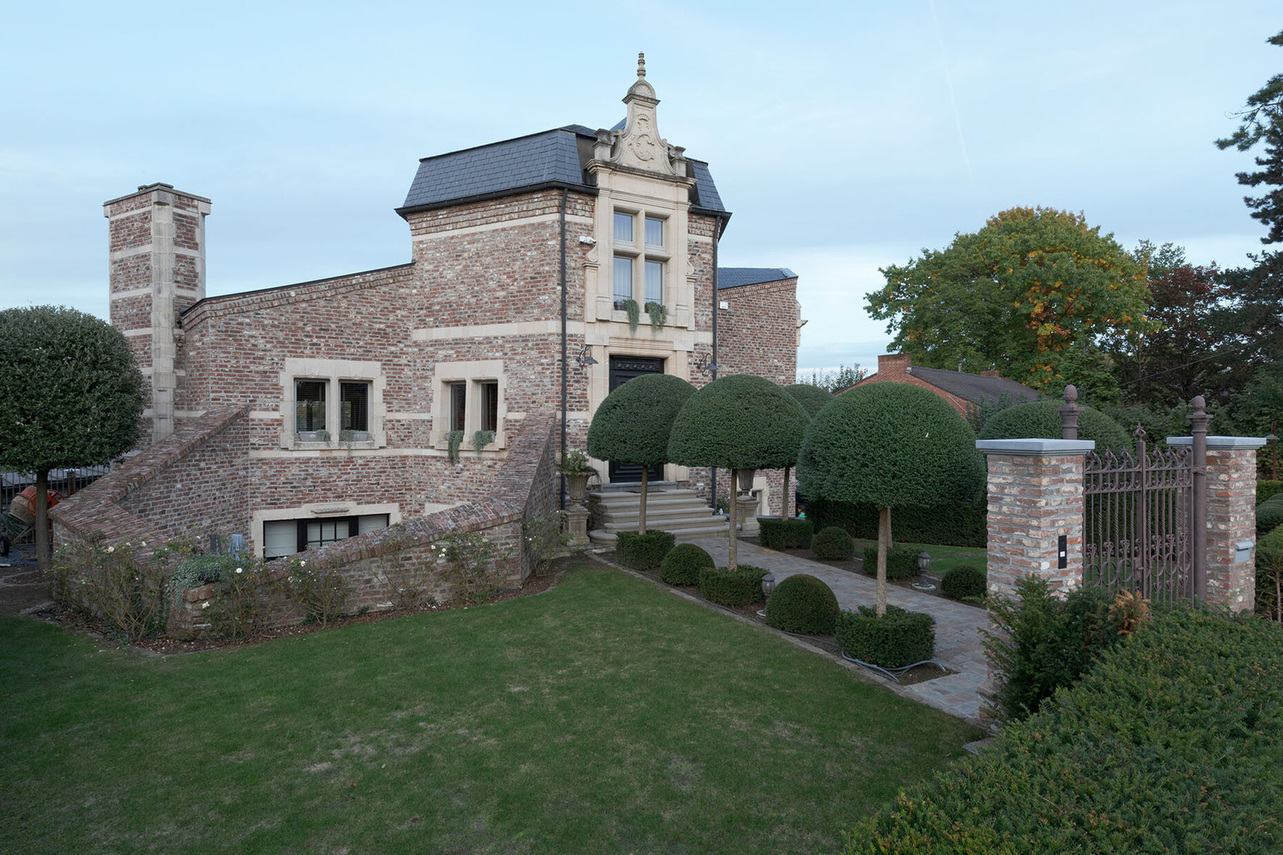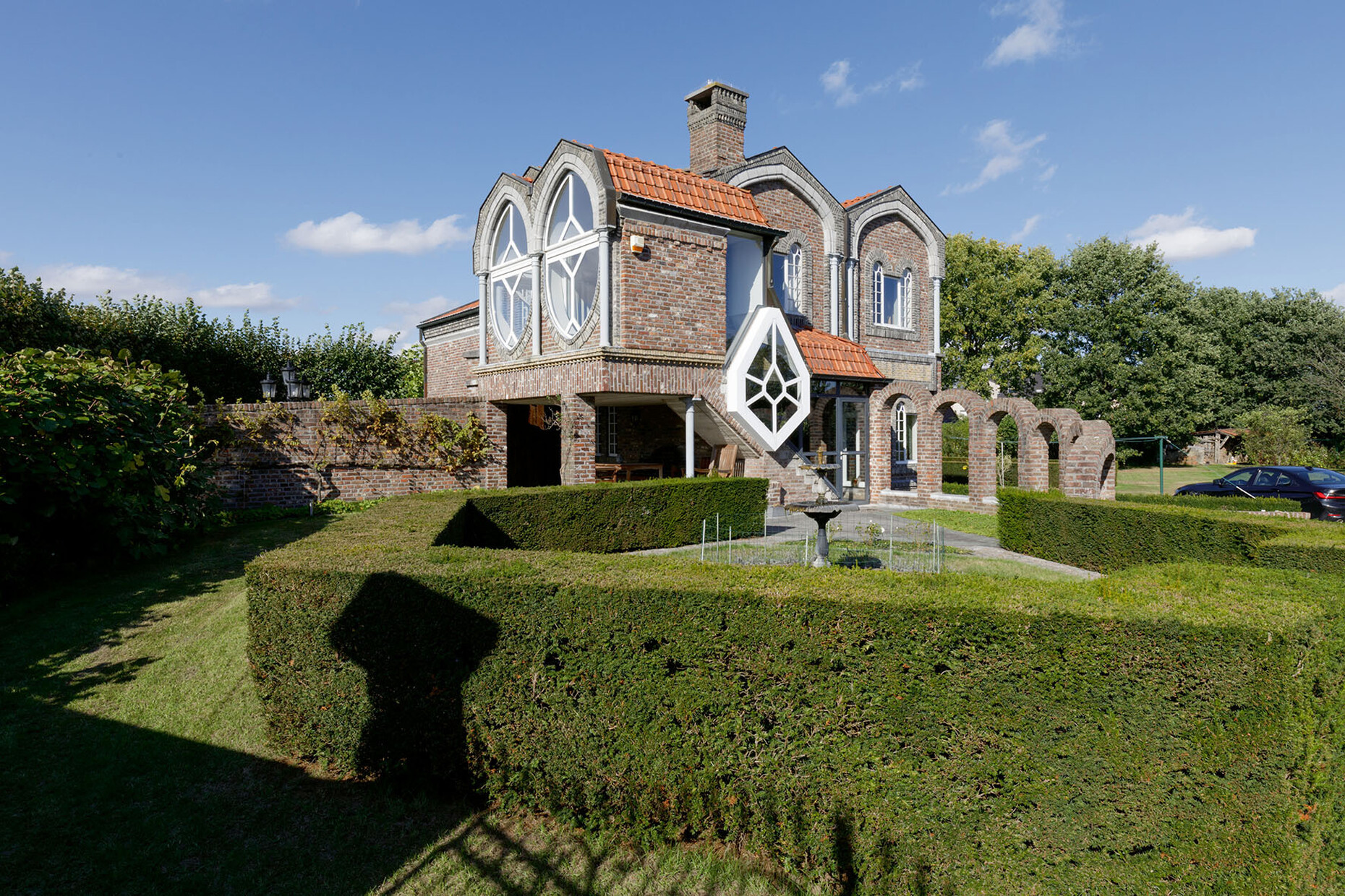 Raymaekers thus had the logistical strength as well as the aesthetic and entrepreneurial self-confidence to embark on his most productive phase. He produced one fantastic house after another. House Olaerts is a sleek modern brick cuboid with large, ornate natural stone window elements on all the façades, giving each side of the house a completely different look. Inside, large wooden beamed ceilings, richly decorated carpets, a sculptural fireplace made from parts of an old ship's hull and two neo-Gothic stone portals leading to the bathrooms are surprising, to say the least. He added parts of Gustave Eiffel's Swiss summer house to the interior of House D in Izegem, but combined them with rather pompous marble, ornate stucco ceilings and placed a free-standing marble bathtub with a golden tap in the bedroom, which would have been more in keeping with Louis XIV than a single-family house in West Flanders.