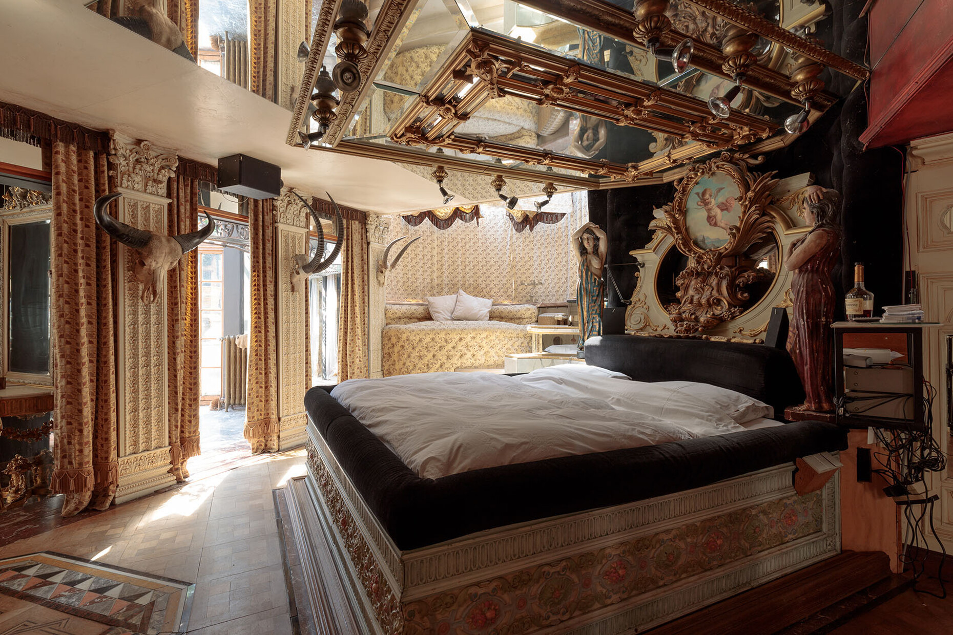House Boncher in Glabbeek is essentially the combination of the remnants of a barracks in Vervier with those of a slaughterhouse in Tienen. For a florist's in the small town of Steenokkerzeel, Raymaekers reused the Art Nouveau façade of a narrow townhouse that had to make way for Antwerp's urban motorway. Raymaekers cut the individual parts of this façade completely apart, however, and reassembled them into a brand new image for the florist's – he was never interested in historically accurate copies. With the Rubensexclusief, a love hotel in the middle of the Brabant countryside, he created a particularly frivolous work in which the pompous lust of his designs with marble floors, stucco ceilings, chandeliers and heavy velvet curtains meets tarred wood and dark metal panels. It's a kitschy, wild mixture of Versailles, Neuschwanstein and Salvador Dalí, an interior design roller coaster ride, and anyone who doesn't have to laugh when a secret passage to the bar opens up behind a reused confessional available for guests caught in flagrante delicto has little sense of humour. It's this mercilessly exuberant wit and inventiveness, always on the edge of being totally over-the-top, that characterises Raymaekers' architecture, much of which was only made it possible in the first place by a disregard of all kinds of building regulations.