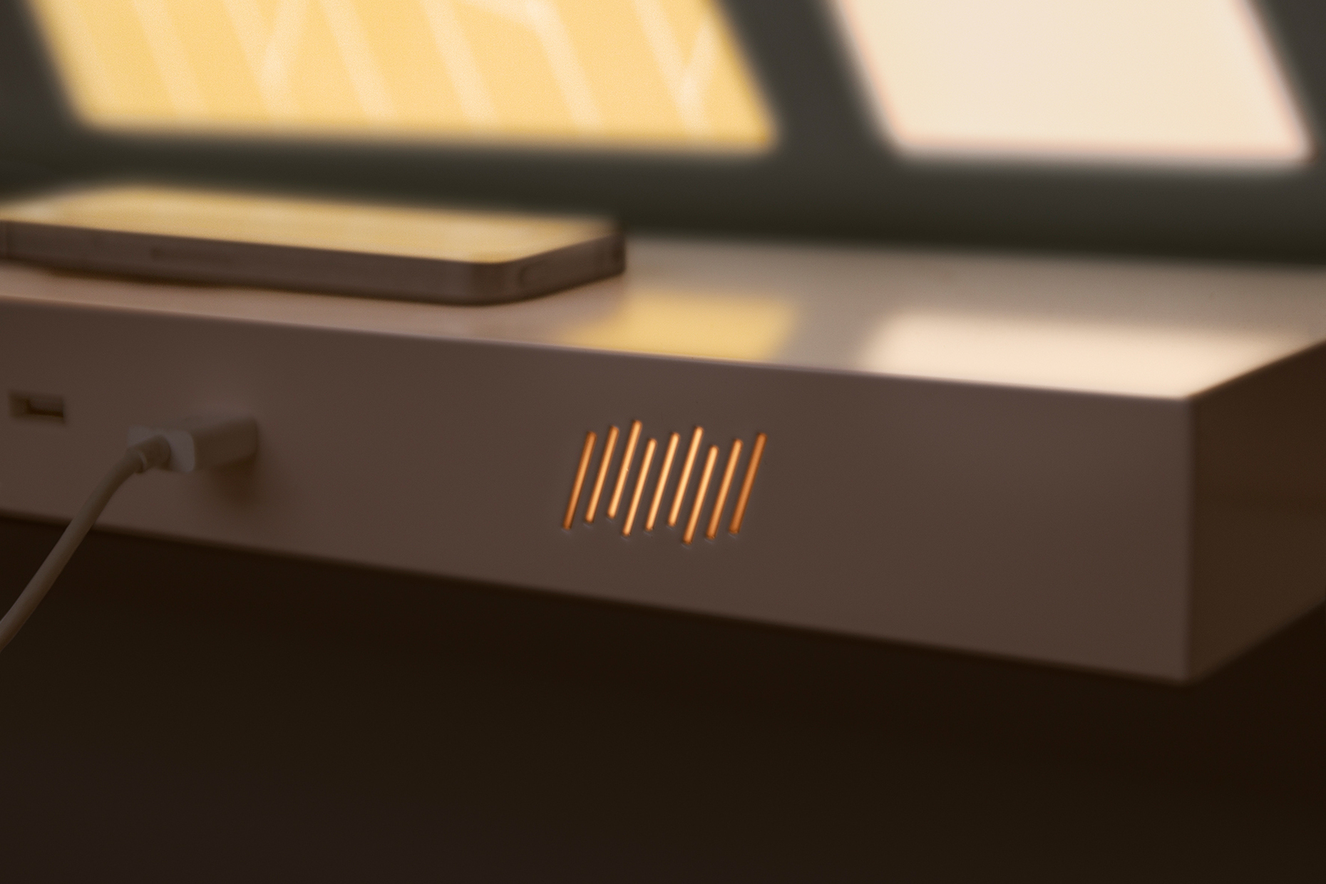 Marjan van Aubel: We made solar energy an experience for the visitors – there were two projects, one was the "Sunne Experience", a room in which many "Sunnes", pendant lights that run on solar energy, were lined up. When you walked through the installation, they changed colour and you could experience the sunrise, sunlight and sunset through the lights. The second project was the Pavilion, a collaboration with V8 Architects and Kameleon Solar. The solar panels in pastel colours were stretched across the ceiling of the Pavilion like a canvas. The panels are printed with a transparent ink so that light can shine through them, and the viewer can experience colour at the same time. You could also climb a staircase to see the solar panels from a different perspective. With this project we also wanted to show younger designers the possibilities of solar technology and the possibilities its design can offer.