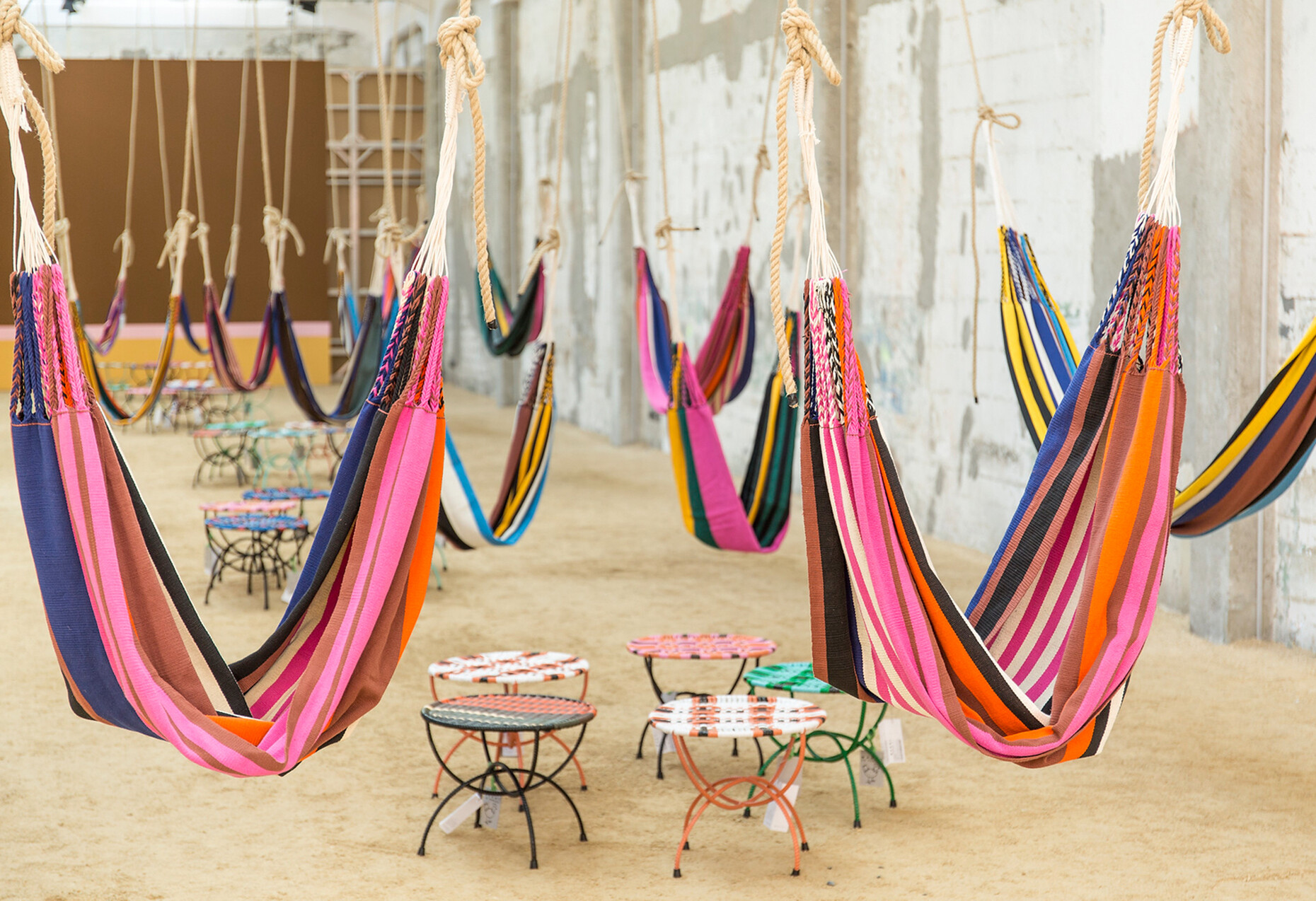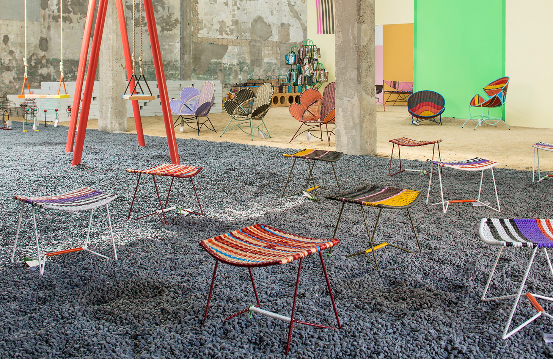 Under the name “La Vereda,” Marni has launched a furniture and lifestyle edition that references both nature and culture and is characterized equally by a poetic and a raw quality. The backdrop for the exhibition was inspired by a Colombian vereda. Veredas are urban meeting points that develop around a couple of streets or a cluster of houses. Local residents meet here daily to swap ideas and pass on information from one generation to another and there is a strong sense of community. In this context the house plays with the community idea in its simplest interpretation as a counterpoint to the fast-moving and transient social media reality. This image of a vibrant and dynamic meeting place forms the highly colorful, folklorist setting for the furniture and home accessories that successfully combine old and new techniques and materials – produced in collaboration with Colombian artisans and workshops.