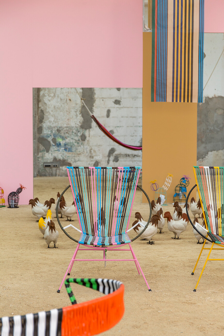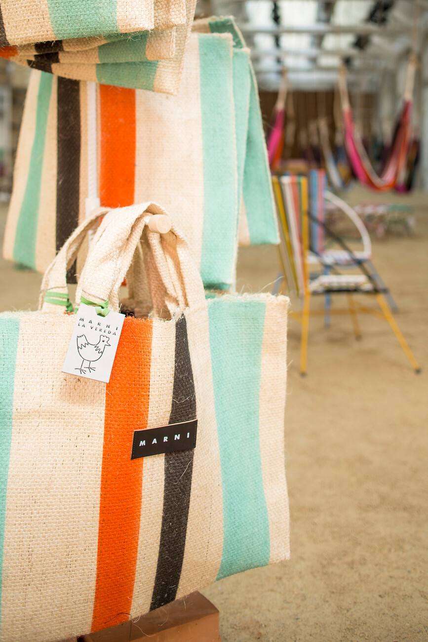 The resulting products not only testify to complexity and inventiveness, but also simplicity – chairs that evoke innocent and dreamy birds as well as peacock tails, geometrically woven, organic PVC for the seats and backrests of stools or armchairs, or chickens fashioned from papier-mâché and decorated with tiny glass beads made by a group of women in Villanueava. In Ibagué, the capital of Tolima, wicker basket weaving has been practiced for centuries. For Marni, the artisans used colored plastic threads in the context of the natural material for the first time. In the Santander region agave forms the basis of a robust, organic textile that Marni uses to make large shopping bags block-printed in bright colors. This mingling of tradition and Pop is a central theme in the installation. As always, Marni donates the money from the sale of the exhibits to a good cause: this time to the Italian project “La casa sull’ albero,” which supports families obliged for existential reasons to give up their children for adoption or to foster families.