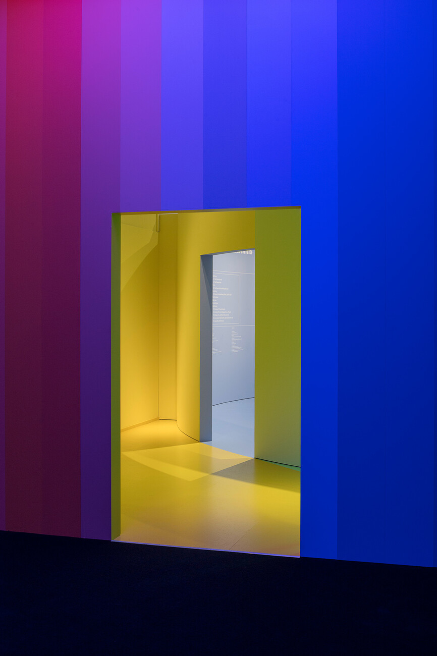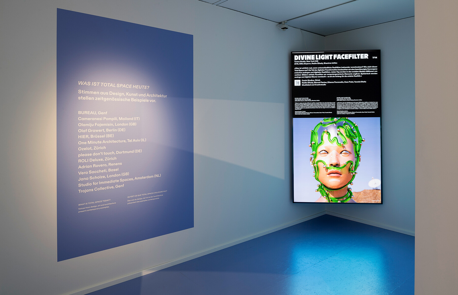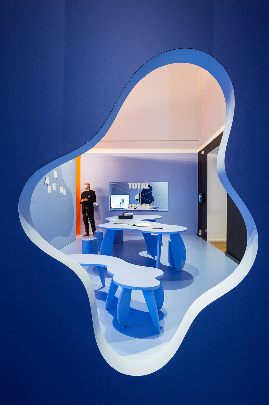 We also used two-meter-high screens for the 26 voices from art, design and architecture who have commented on the possible history and present of Total Space. We worked with a familiar visual element, the time line from Instagram Stories which indicates the period of time for the observation. In addition, the many Zoom talks with the five studios that shaped Total Space provide an insight into current working methods. And finally, Damian Fopp and I are always present through a video entitled “Serenity TV”. In the Pantone code, Serenity is the color that characterizes the entire exhibition and simultaneously an appeal to visitors for calm.