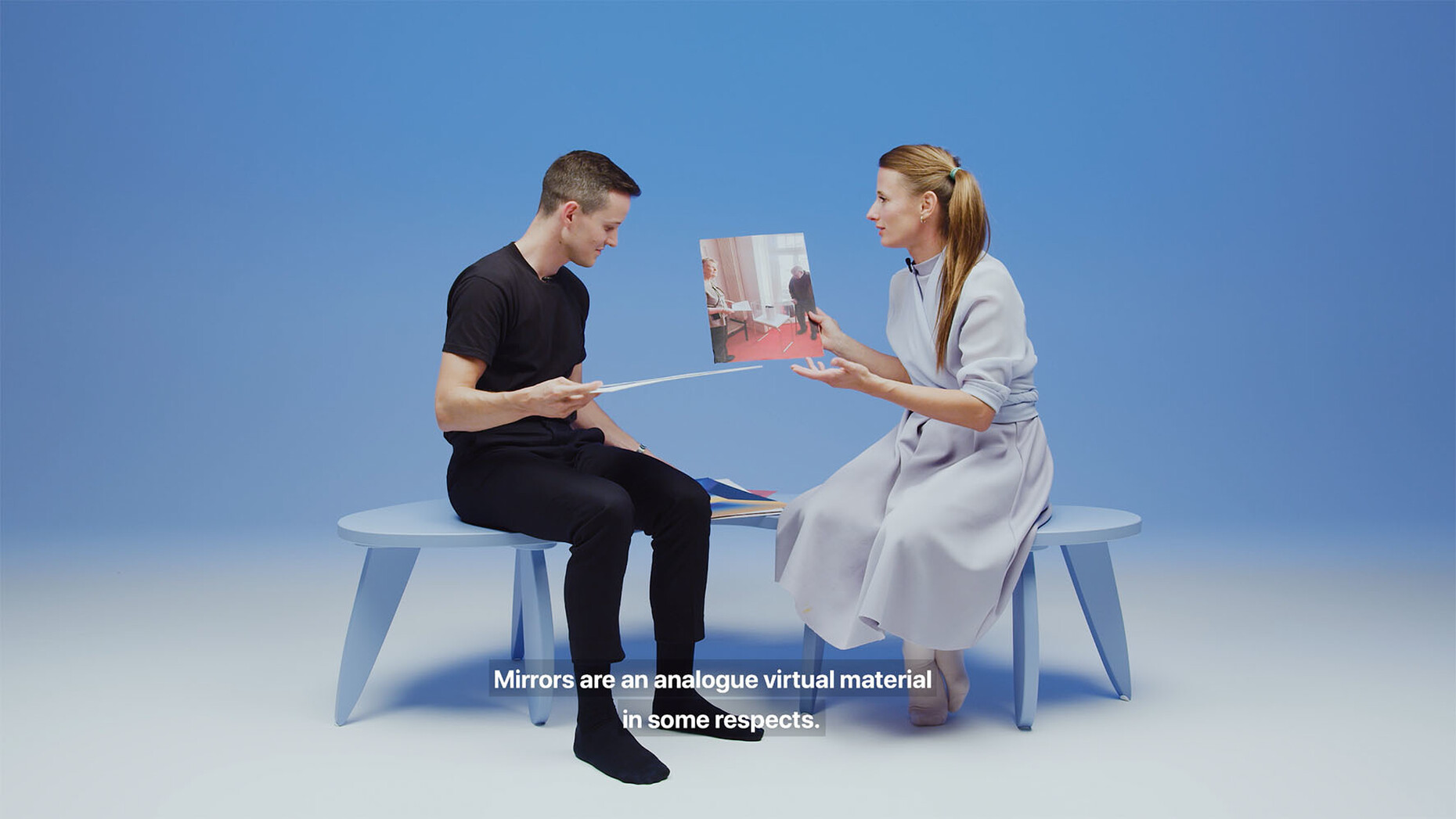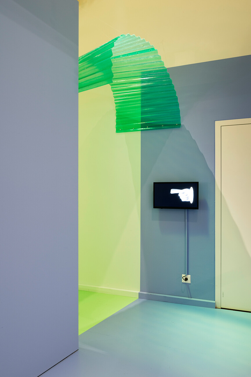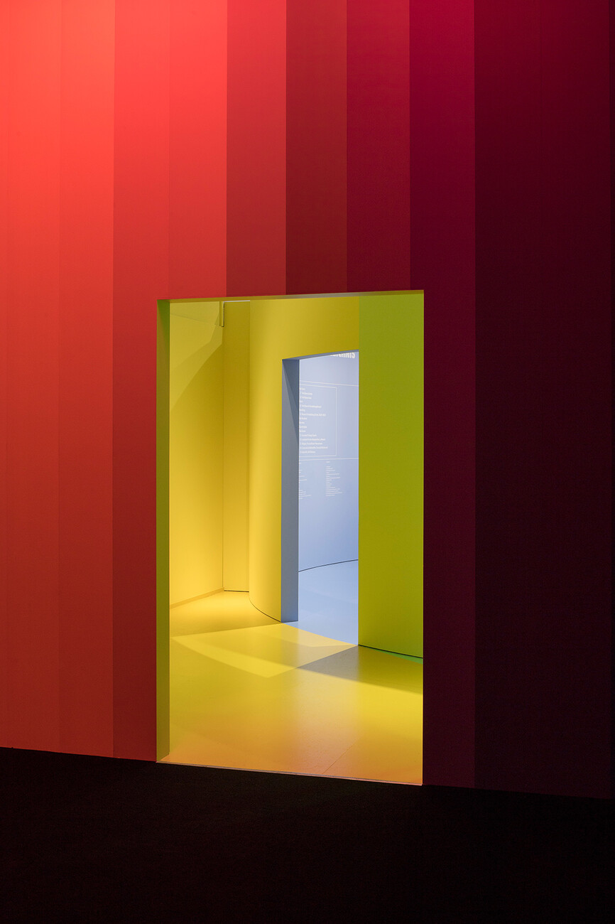 We also used two-meter-high screens for the 26 voices from art, design and architecture who have commented on the possible history and present of Total Space. We worked with a familiar visual element, the time line from Instagram Stories which indicates the period of time for the observation. In addition, the many Zoom talks with the five studios that shaped Total Space provide an insight into current working methods. And finally, Damian Fopp and I are always present through a video entitled “Serenity TV”. In the Pantone code, Serenity is the color that characterizes the entire exhibition and simultaneously an appeal to visitors for calm.