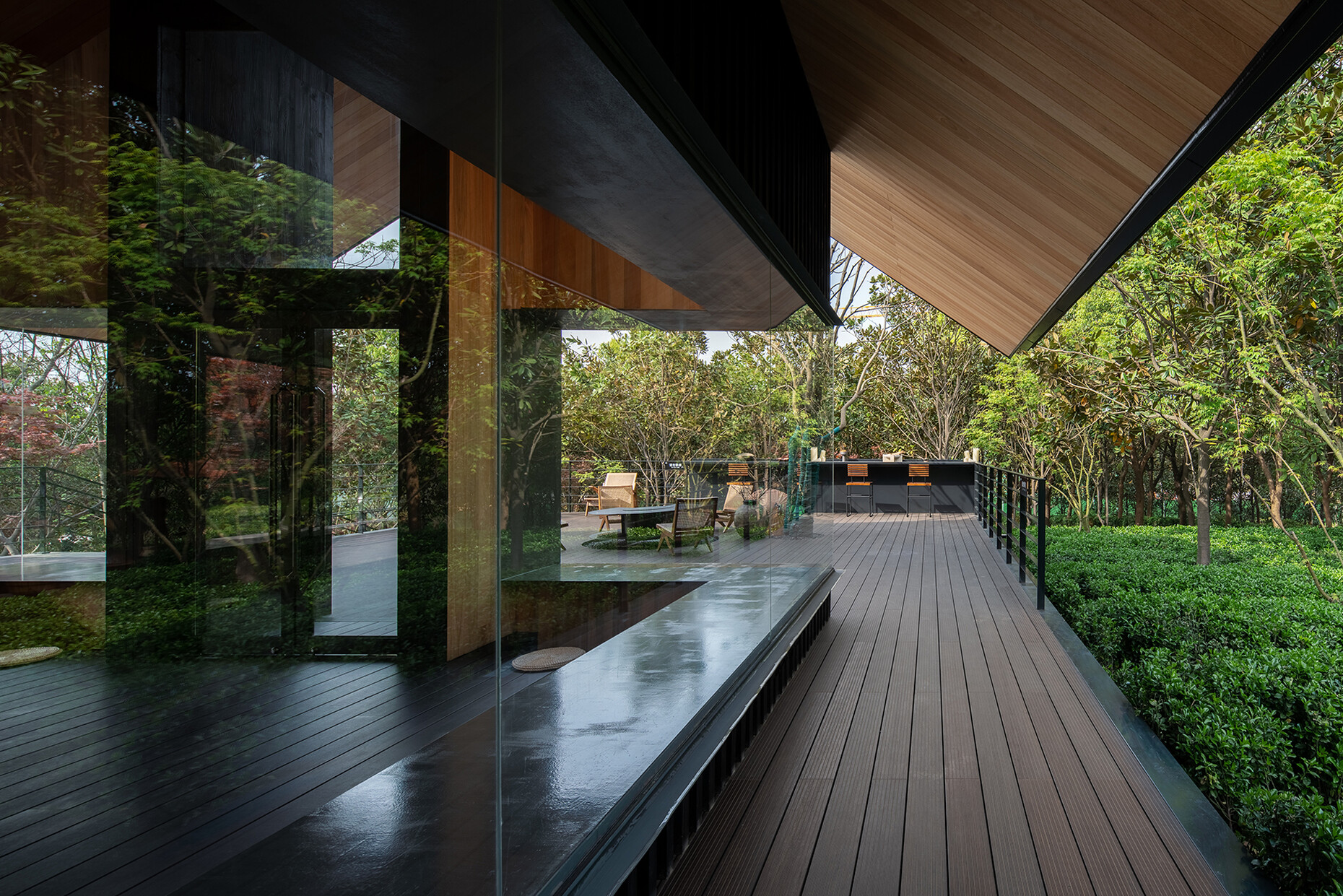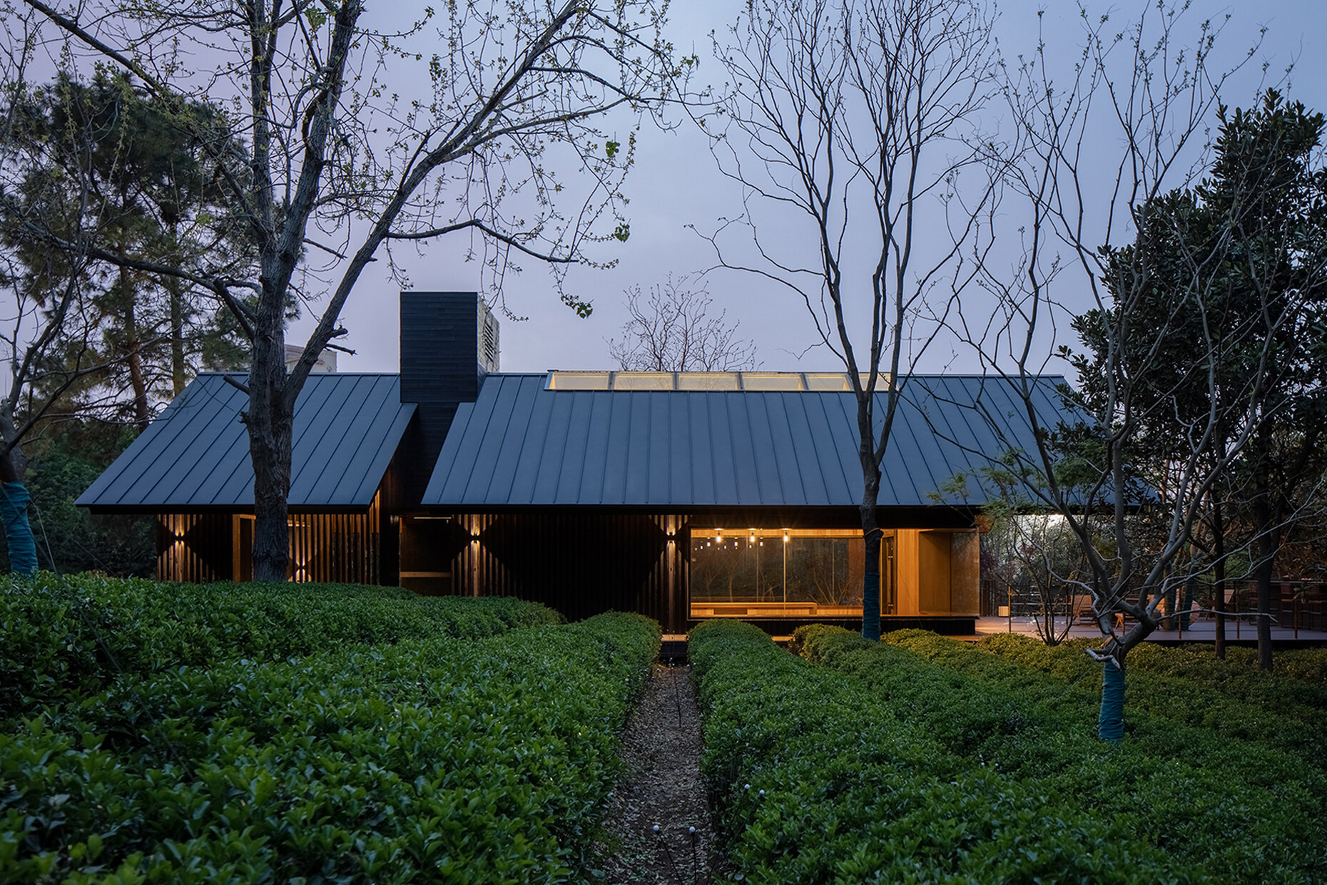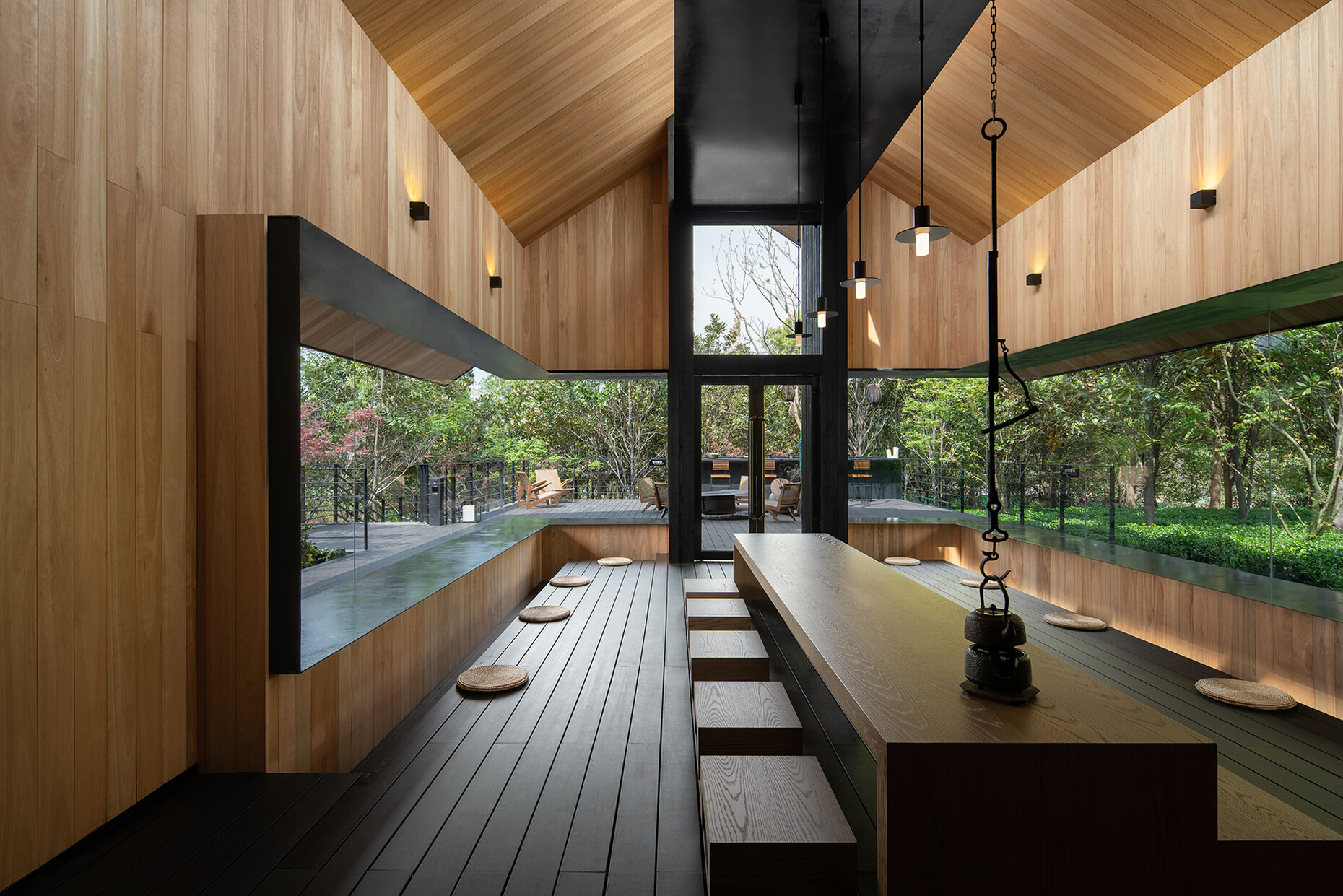The Forest Tea House, a teahouse in Wuhan, also draws on the design language of traditional architecture. It is tucked away among trees on Yanxi Lake and accessed via a winding path. The reference to traditional house typologies is particularly evident in the elongated gable roof. It spans an open space, almost as if floating. At the same time, it dissolves into individual elements due to a skylight running along the ridge, giving it a filigree character. Spatially, the tea house consists of an entrance area and the large main room. A service core, like a house within a house, divides the two areas. It protrudes from the roof like a pseudo-chimney and houses the building services. The building sits on a wooden terrace, which is spanned by the projecting roof surfaces. Its burnt wood façade and dark titanium zinc sheet roof give it a homogeneous appearance. The interior, on the other hand, is largely clad in light wood veneer, creating a cosy contrast to the black shell. Circumferential ribbon windows offer a framed view of the surrounding landscape. Here, too, the boundaries between inside and outside are fluid.