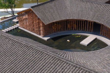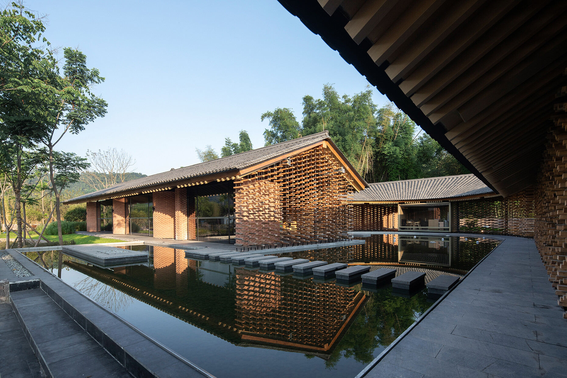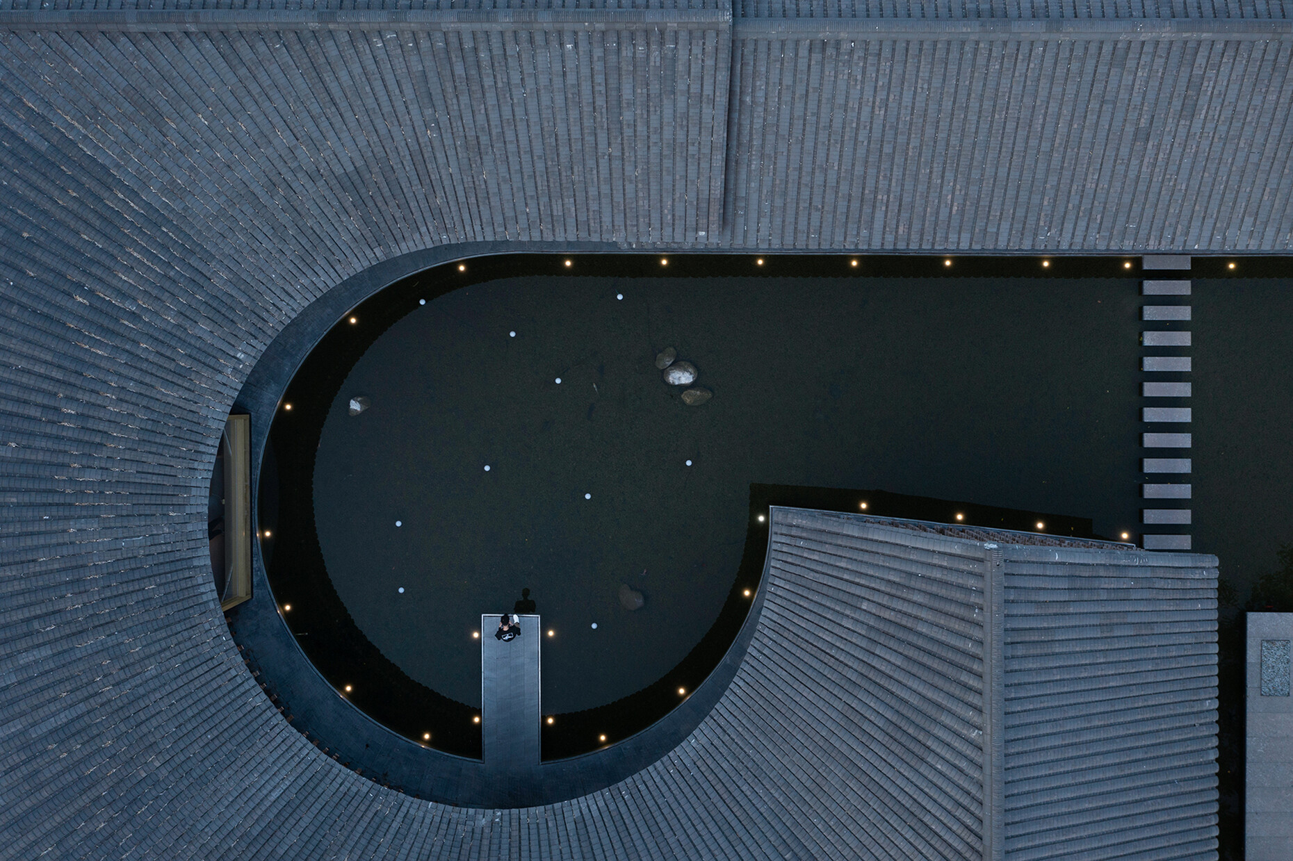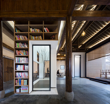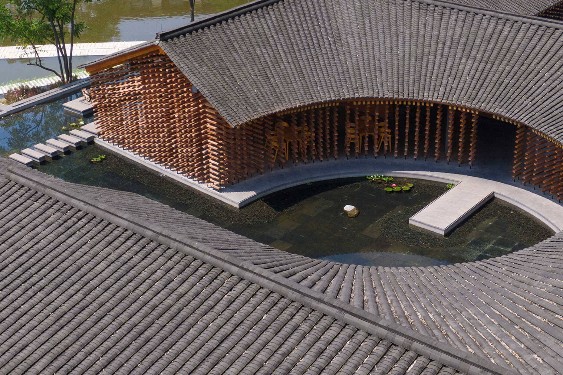 A similar project is the Shanshui Firewood Garden hostel with a tea house, restaurant and library, built by Mix Architecture in the village of Anshi. An expressive building has been created on the outskirts of the village, surrounded by a cultural landscape of rice terraces, ponds and small settlements. Despite its striking architecture, the building reflects the cultural tradition of the place. One example is the building envelope, which references the stacked firewood in front of traditional houses. In Mix Architecture's reinterpretation, the logs are suspended from ropes. They create a threshold area between the interior and exterior, which is played out in a poetic interplay of light and shadow. The shape of the building is derived from the typically elongated structure of the village houses, which are arranged here in the form of four building sections resembling a windmill. This creates a round inner courtyard as a contemplative place with a pond in the centre. Other features include the use of red sandstone from the region's mountains, sandstone brick walls and slate-grey roof tiles, which blend into the cultural landscape with their texture and colour.
