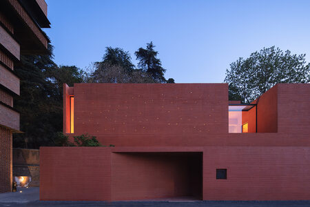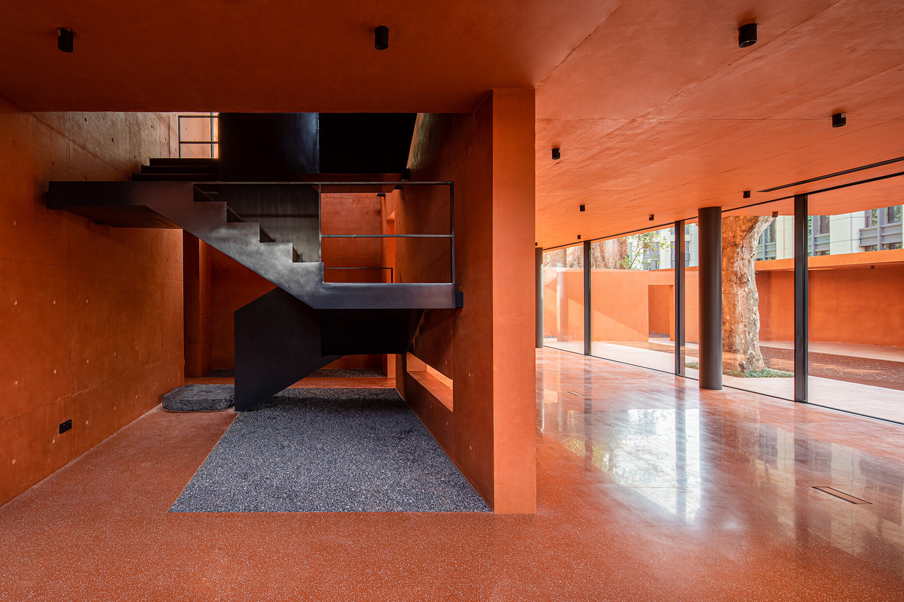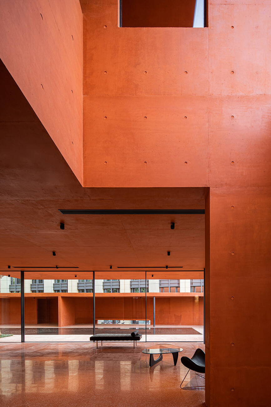 Part of Hongchuang Park is the Red Box Exhibition Centre. This is an exhibition building directly adjacent to the central square. Its monolithic appearance in red concrete is broken up by sculpturally placed openings. These create large windows and inner courtyards and define the entrance area. Red is the dominant colour scheme, appearing both on the façade and inside the 700-square-metre building. Black steel is used for the supports, window frames and main staircase. The ground floor houses the reception, a lobby, the exhibition area and various service rooms. Several atriums create a pleasant atmosphere, while the exhibition area opens up to an inner courtyard with a water basin via a generous glass façade. Additional exhibition areas and an outdoor terrace are located on the upper floor. The façade here features perforated bricks. This allows filtered sunlight to fall into the rooms during the day, while at night the building becomes an ornamental glowing lantern.