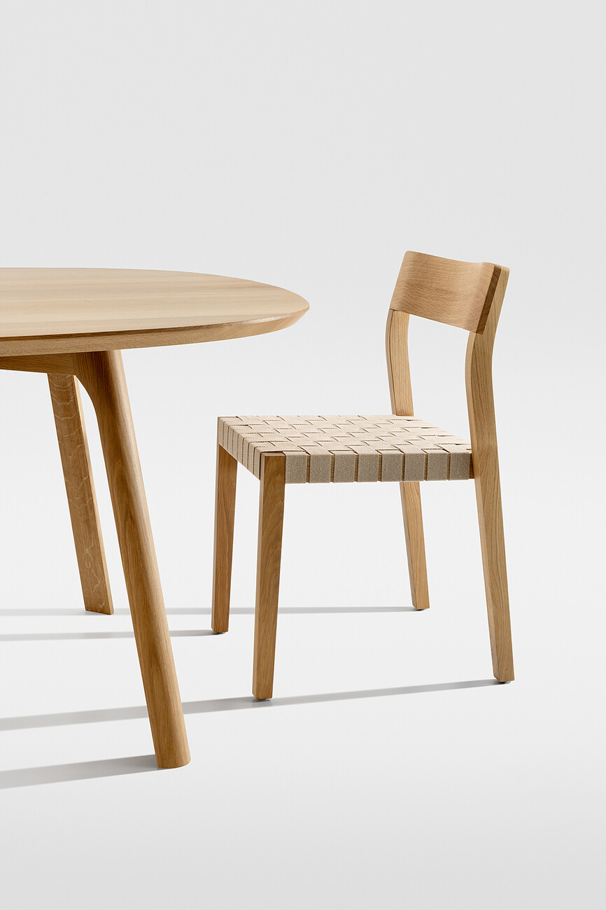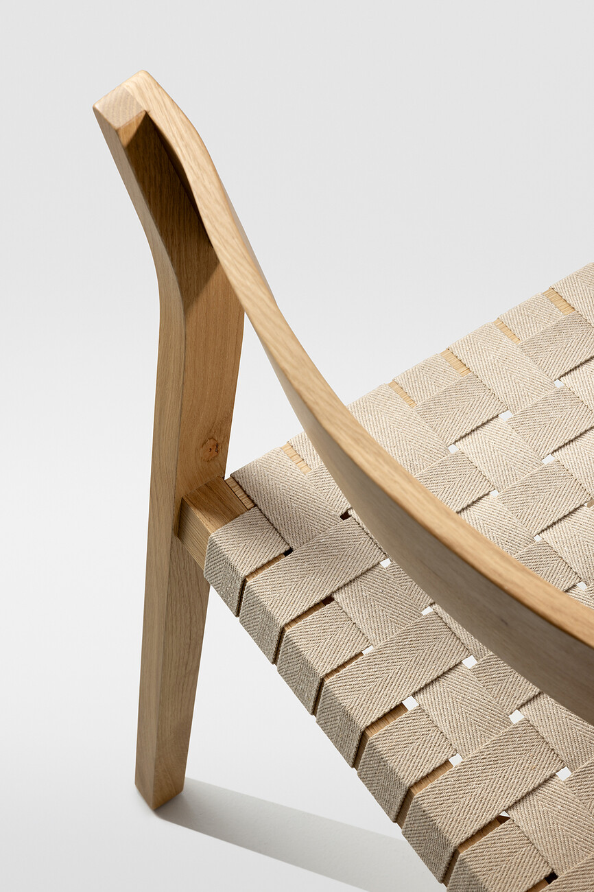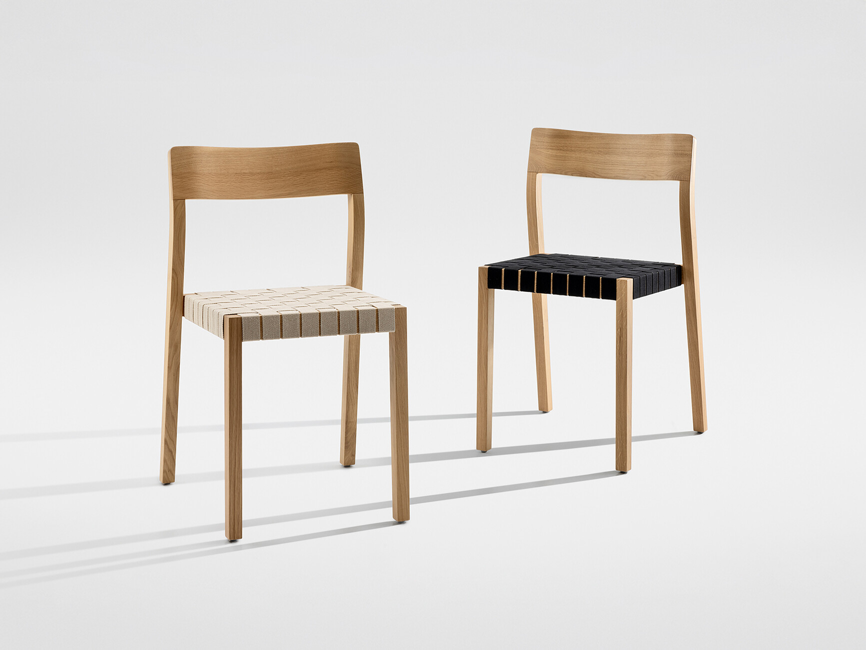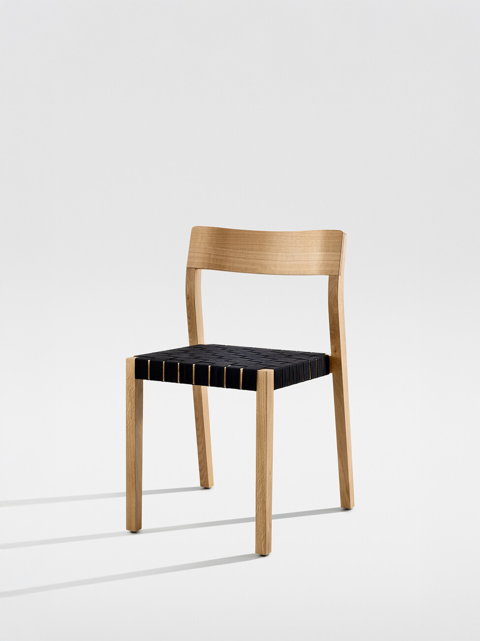 Visually, the aesthetics of the woven textile pattern lend the chair a pleasant warmth that is particularly suited to the ‘warm minimalism’ style, which combines clarity and cosiness in a gentle balance. The natural and black colours of the cotton belt harmonise perfectly with the frame, which is available in oak, oak stain, American cherry or American walnut from renewable forestry. With its simple elegance and exciting material combinations, ‘SIT’ can be integrated into any interior.