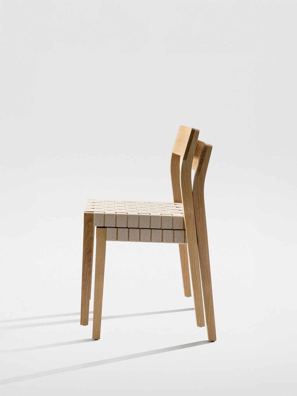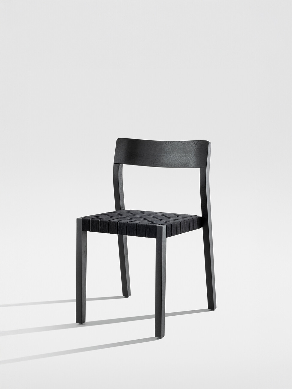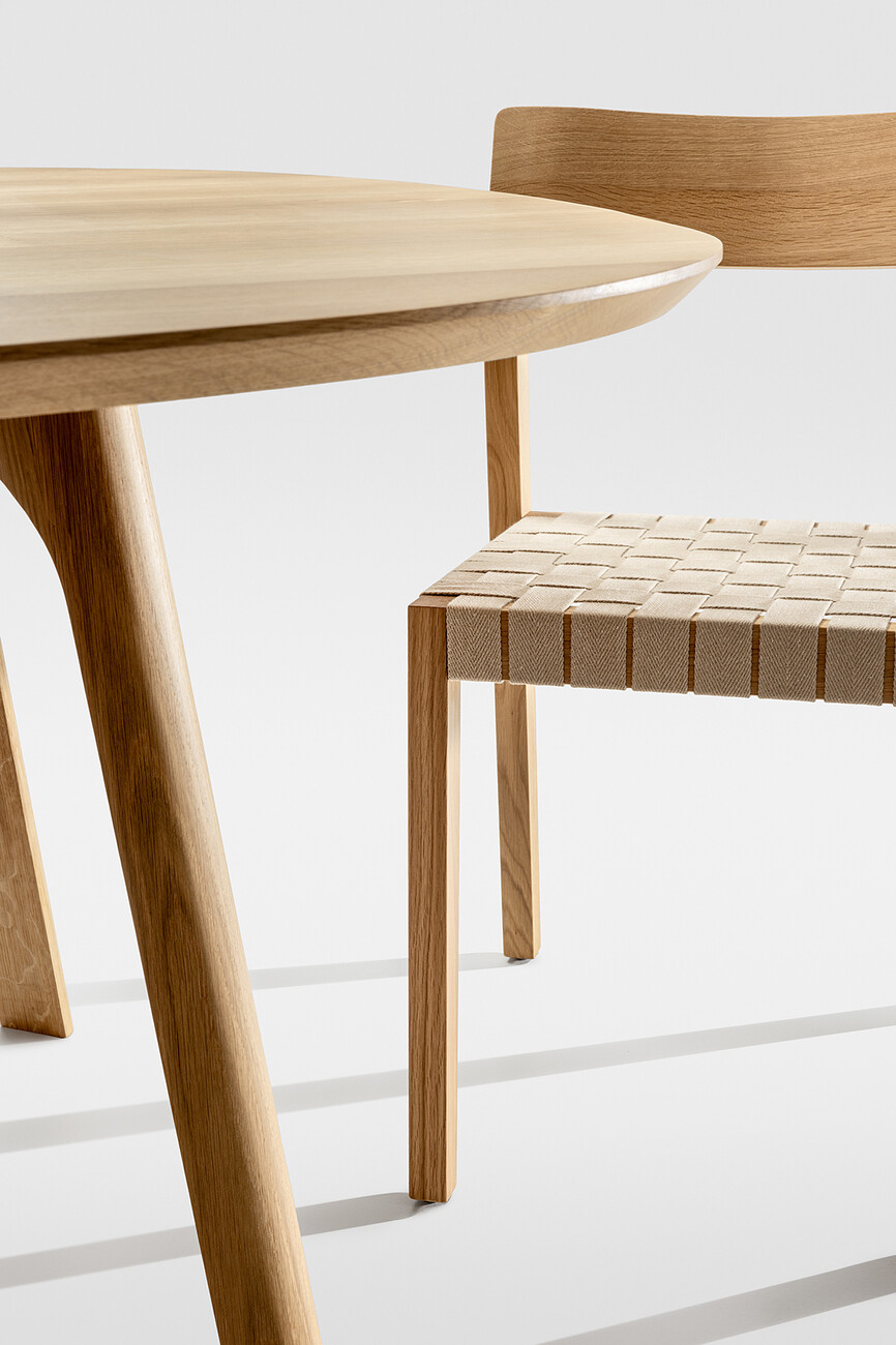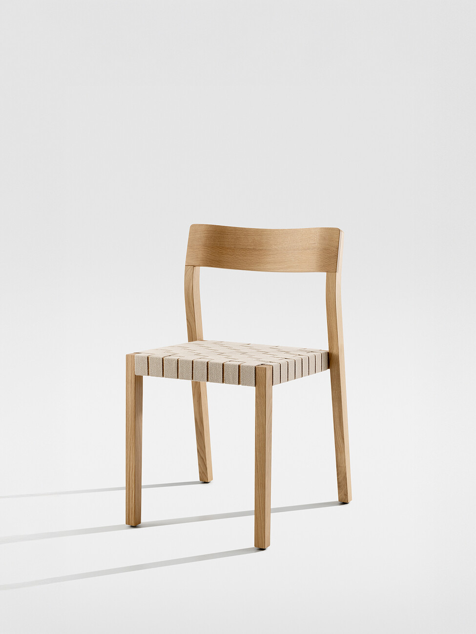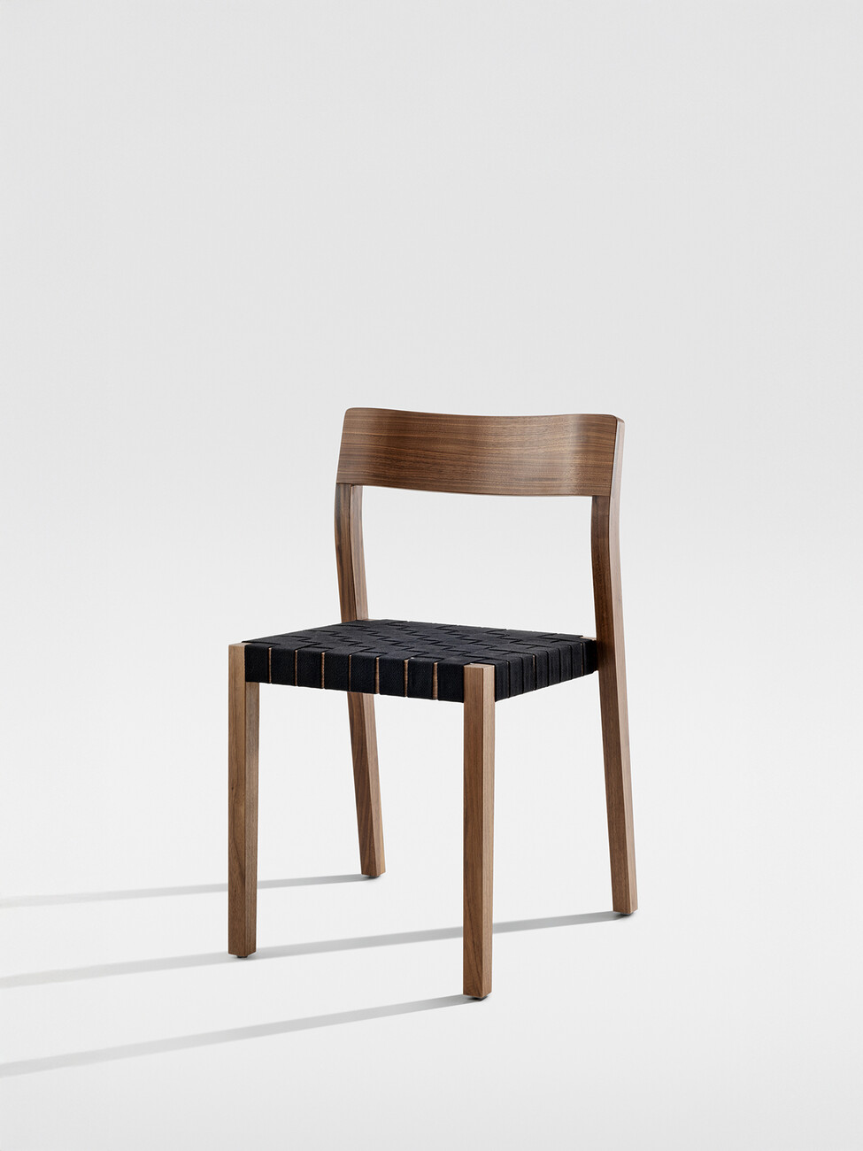 Visually, the aesthetics of the woven textile pattern lend the chair a pleasant warmth that is particularly suited to the ‘warm minimalism’ style, which combines clarity and cosiness in a gentle balance. The natural and black colours of the cotton belt harmonise perfectly with the frame, which is available in oak, oak stain, American cherry or American walnut from renewable forestry. With its simple elegance and exciting material combinations, ‘SIT’ can be integrated into any interior.
