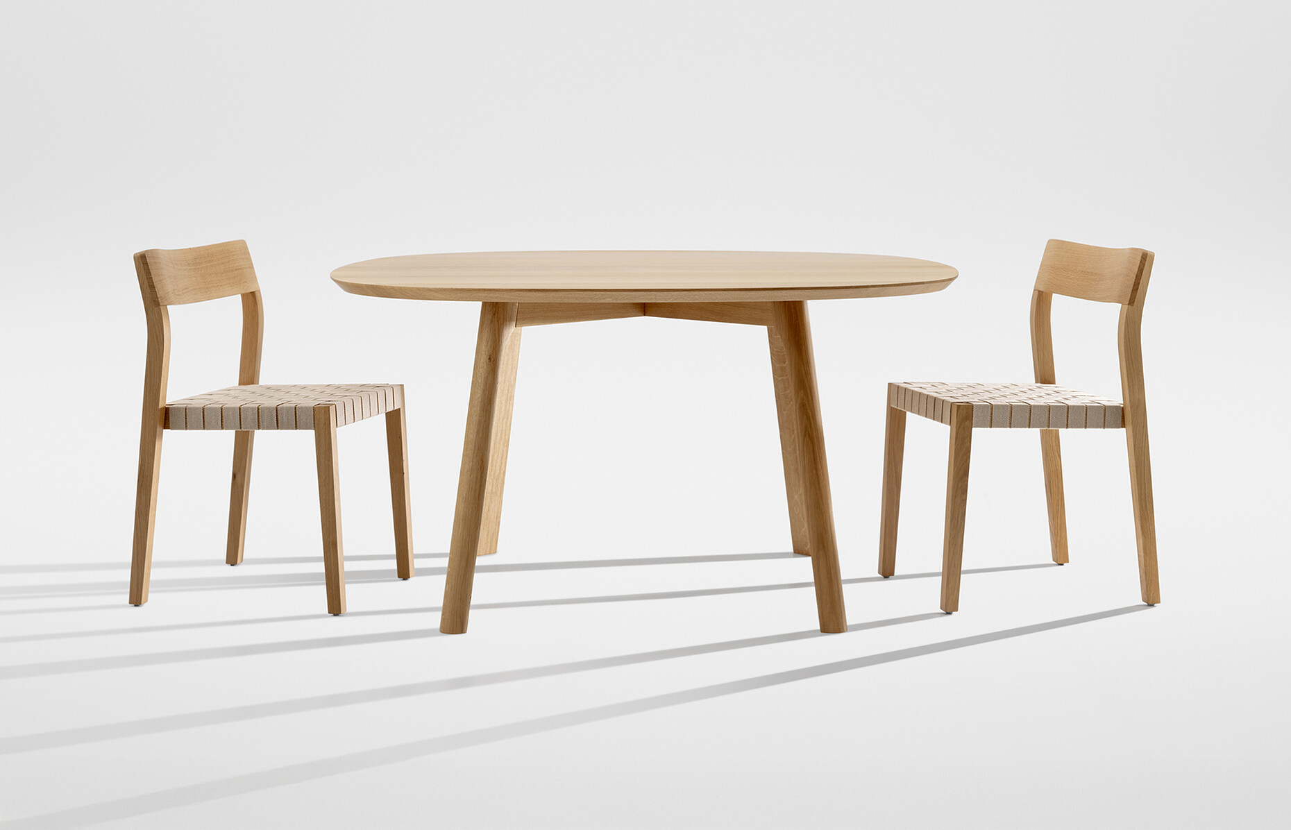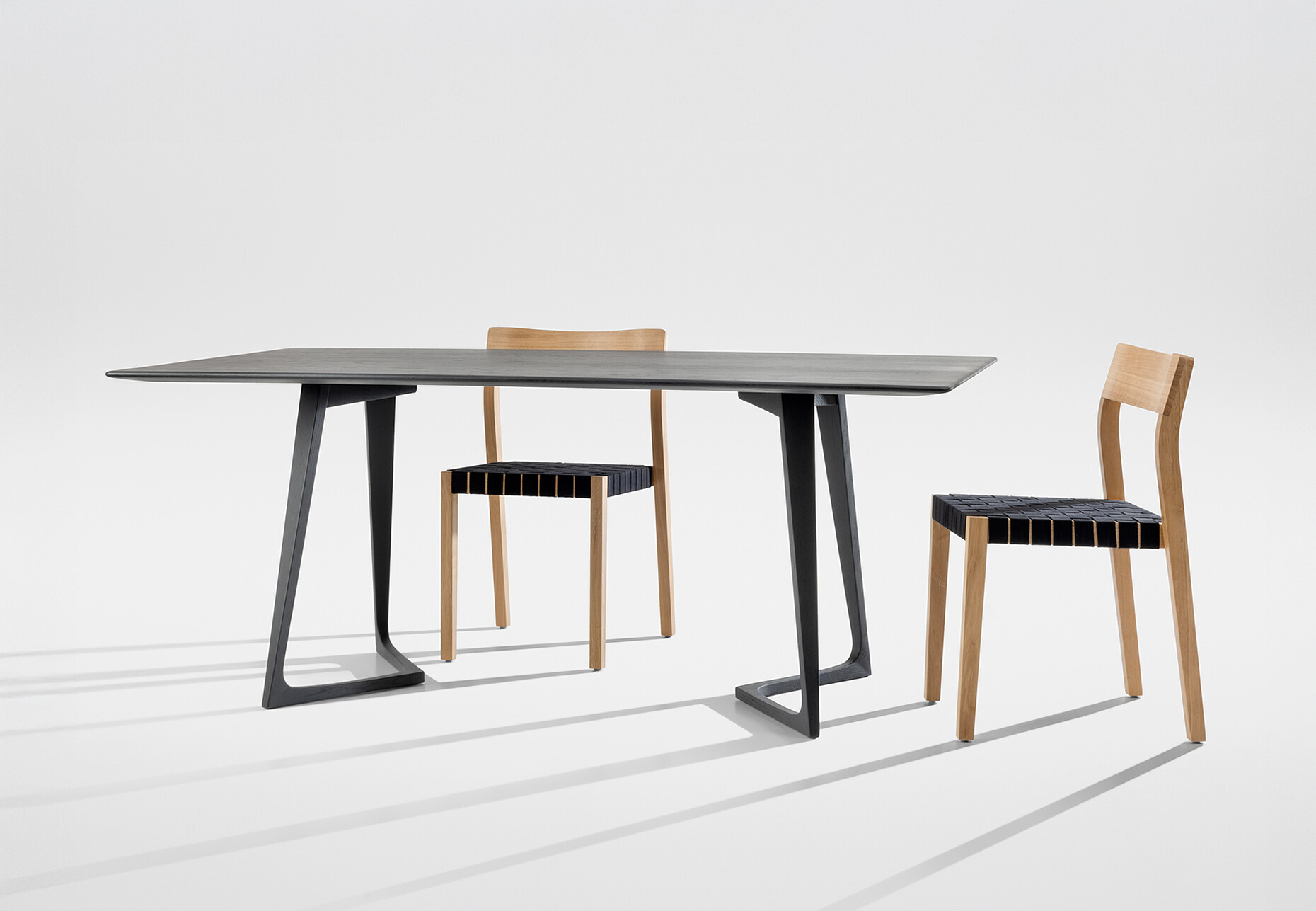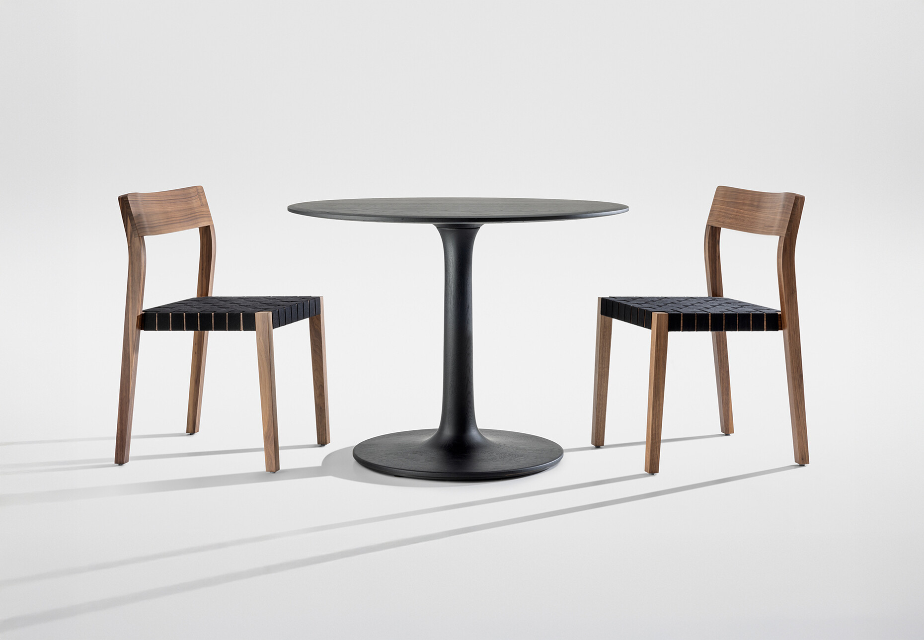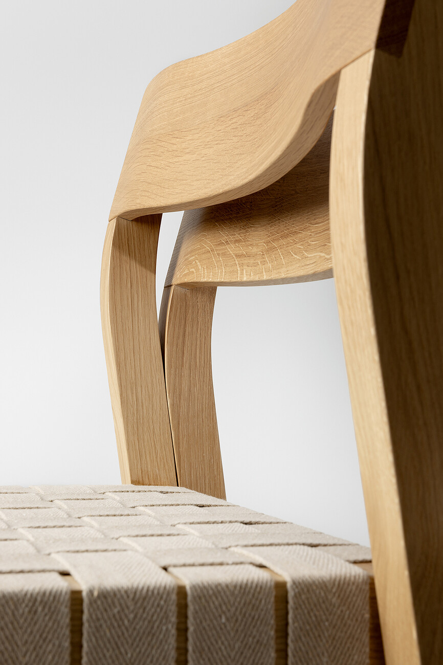 Visually, the aesthetics of the woven textile pattern lend the chair a pleasant warmth that is particularly suited to the ‘warm minimalism’ style, which combines clarity and cosiness in a gentle balance. The natural and black colours of the cotton belt harmonise perfectly with the frame, which is available in oak, oak stain, American cherry or American walnut from renewable forestry. With its simple elegance and exciting material combinations, ‘SIT’ can be integrated into any interior.