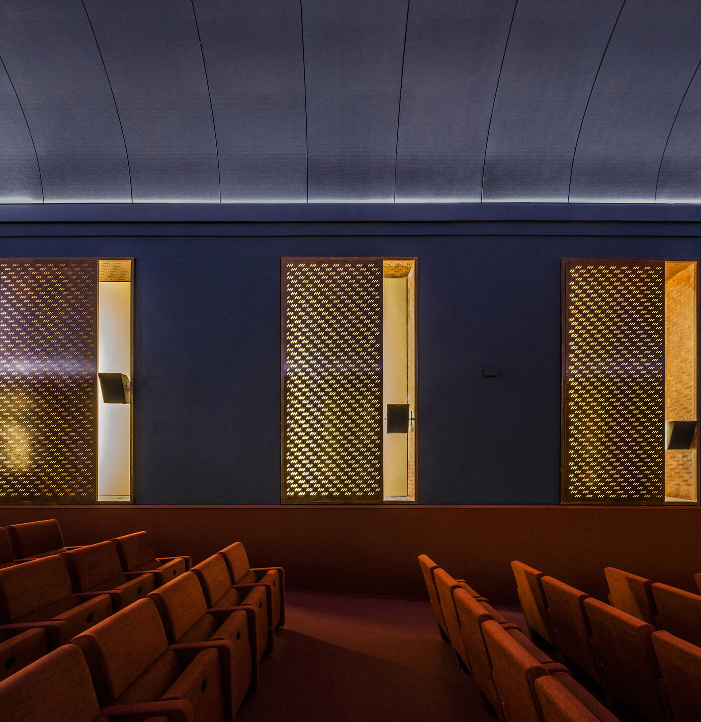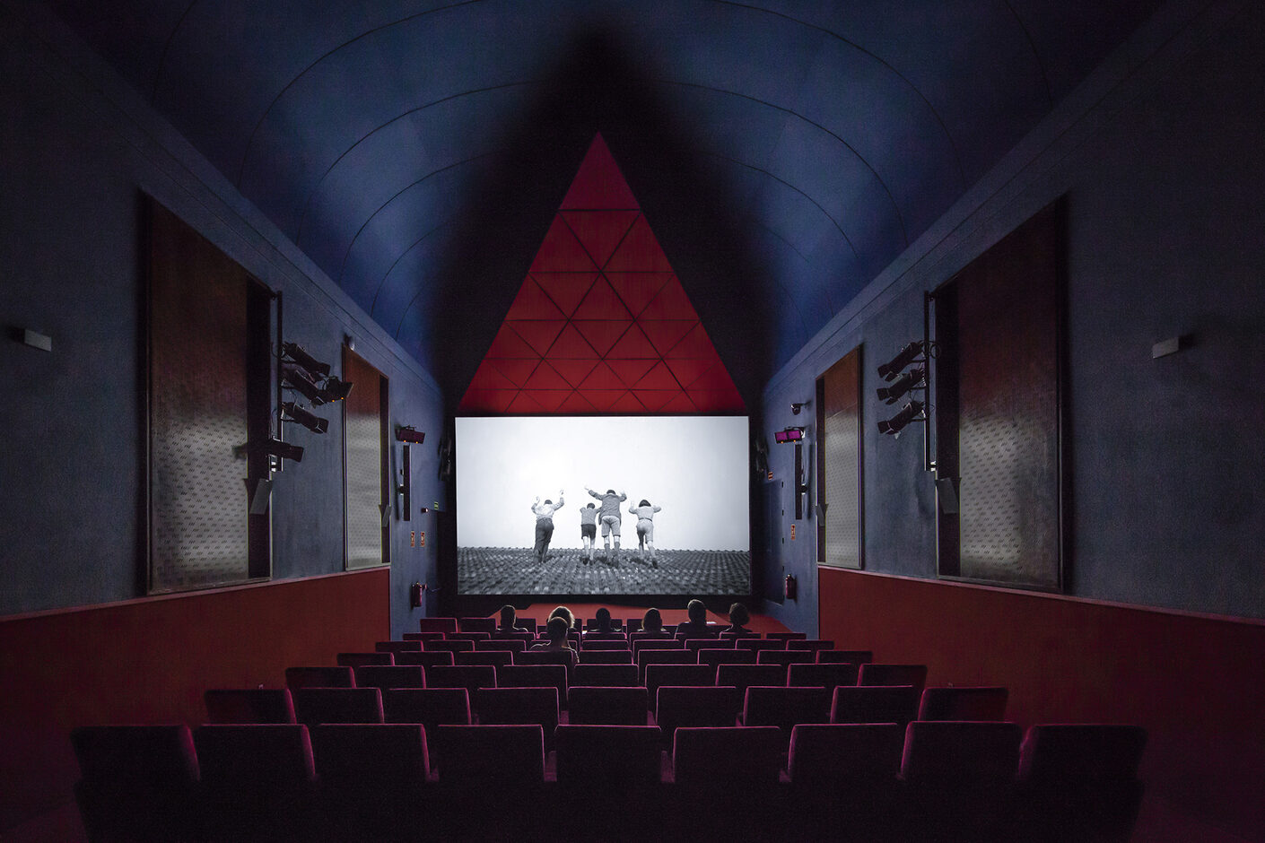 The new component in the entrance area, a triangular storage space, guides guests to the rear of the hall, whilst maintaining a dialogue with its shape. The striking chimney red that floods the foyer extends along the heavy velvet curtains of the passageway into the screening room, where it reaches the rows of chairs and floors, soaking them deeply in colour and climbing up the wall until the midnight blue of the sky takes over. To avoid reflections, the old windows were closed with wooden panels in which small recesses were carved for indirect lighting, reminiscent of raindrops. Like a stage set, the design creates the impression of being above the earth.