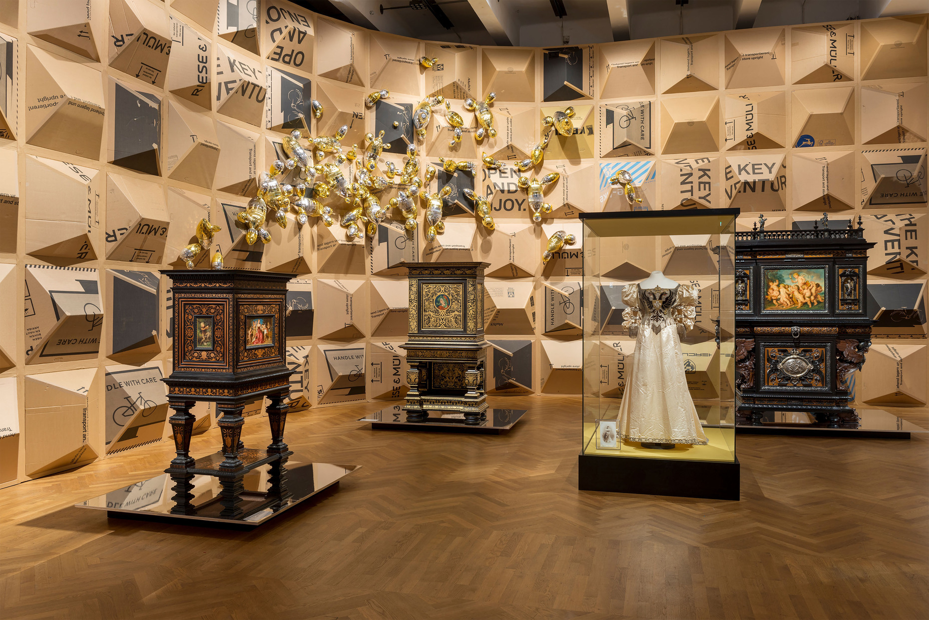 Arriving at the exhibition is already an experience. In a movable mirror wall, Nicole Six and Paul Petritsch "reflect" festive moods, which in turn are shown in historical mirrors. With Morse code, a room-sized Venetian Murano chandelier by Cerith Wyn Evans transmits a lecture on early star photography by Siegfried Marx. This "furniture of the air", as glass artist Peter Rath once called chandeliers, immediately creates a special atmosphere in the room. Guest curator Brigitte Felderer and her curatorial assistant Olga Wukounig also took an artistic approach to the exhibition design. Peter Sandbichler structures the 1,480 square metre exhibition hall with large bicycle boxes as walls and benches. The lightness of the environmentally conscious material allows for low-hanging ceiling sculptures as well as towering cubatures. They spatially enclose individual objects – from festive gowns to jewellery to photographs – and in this way create different moods.