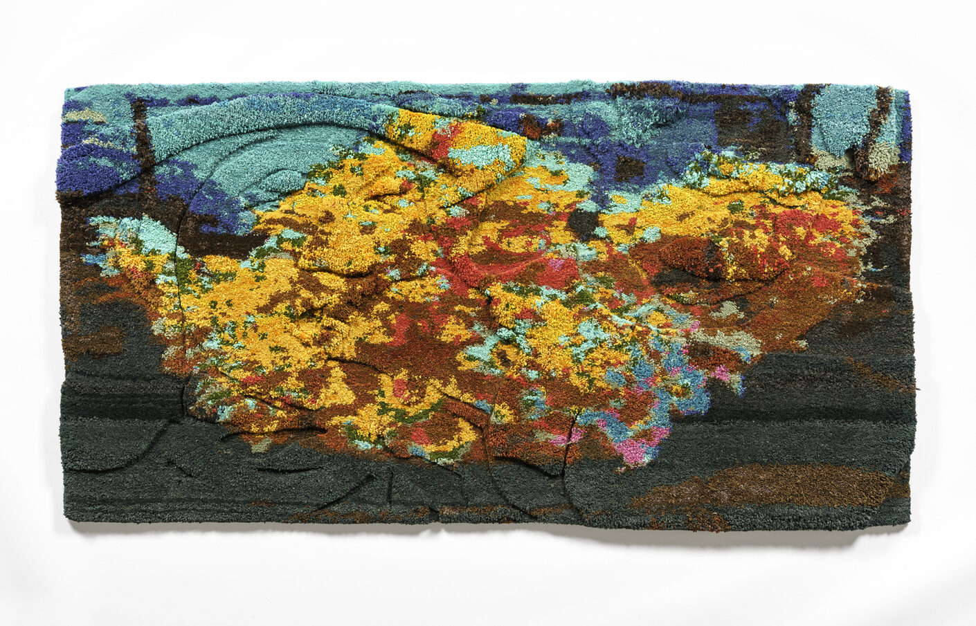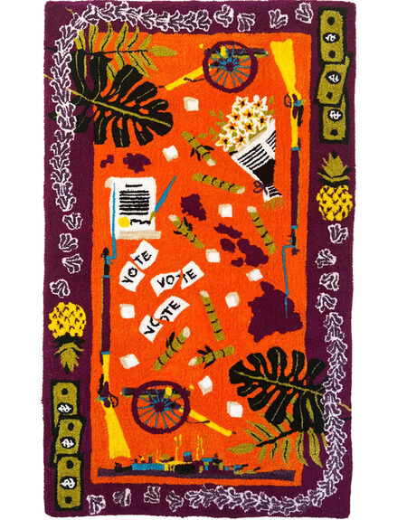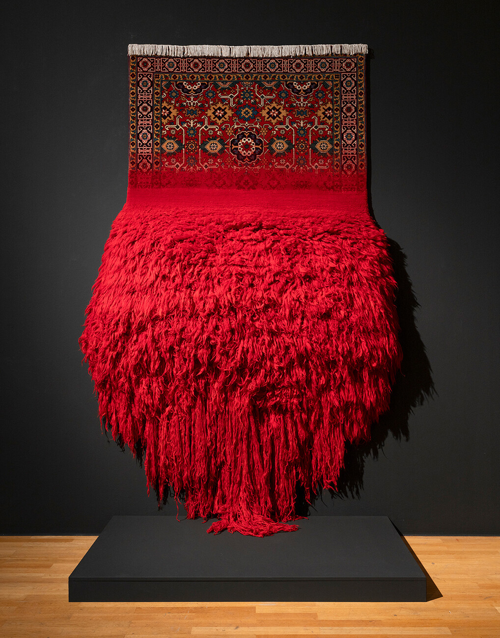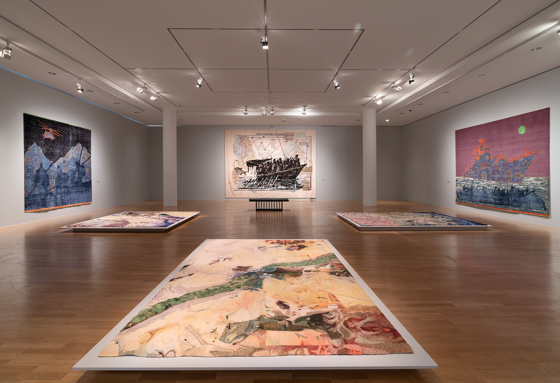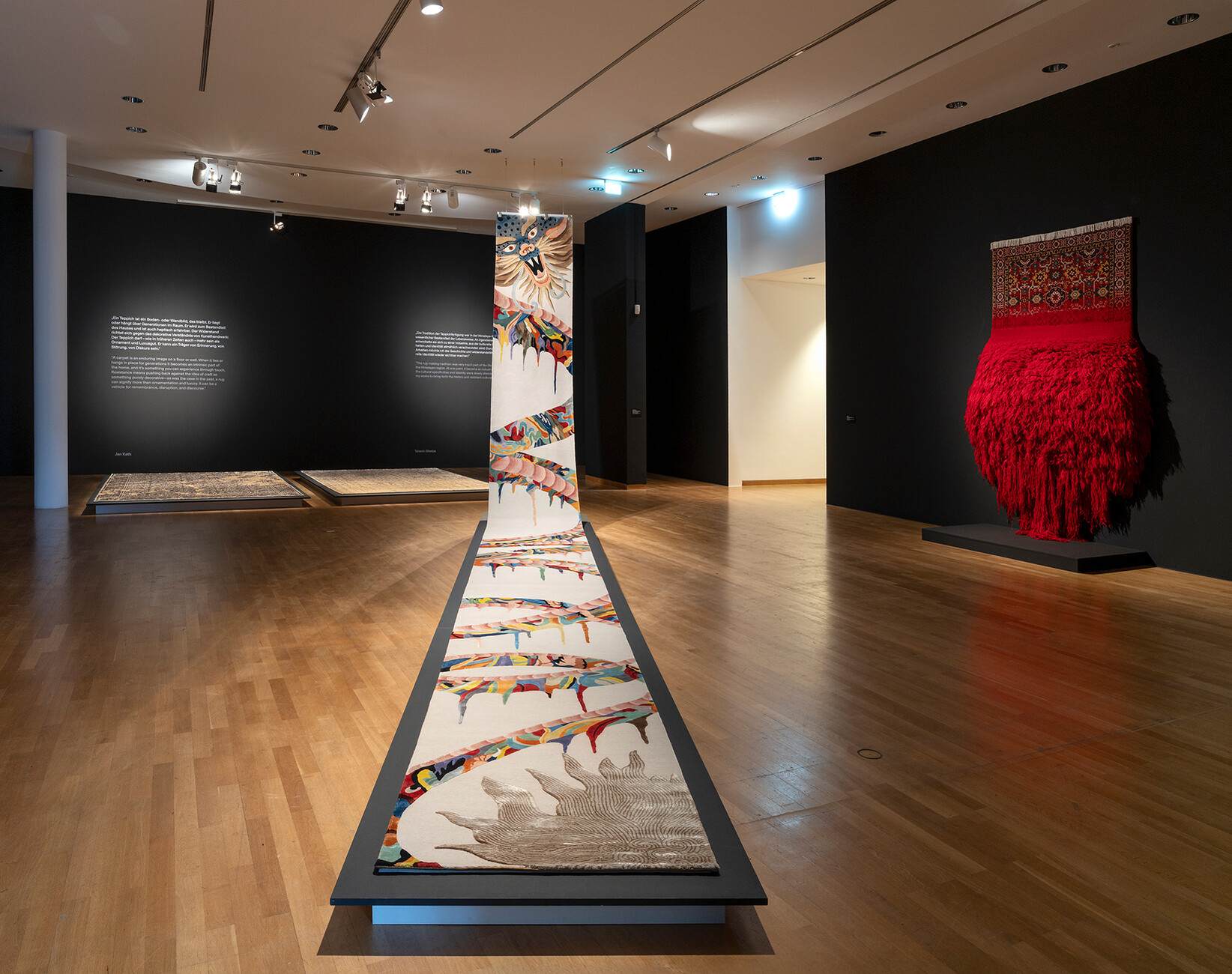 Curator Dr. Katharina Weiler has compiled works for Wool. Silk. Resistance. that offer numerous perspectives, both in terms of craftsmanship and theme. Traditional techniques such as knotting, weaving, and tufting are combined with modern technology to create rugs whose motifs are directed against traditionalism, discrimination and racism, environmental destruction, sexual abuse, and political power structures. The creators question the hierarchies of our societies and arts, strive for self-empowerment, and create powerful images that stand in stark contrast to the soft material of the textiles from which they are made. The dissolution of boundaries extends to formal expression: the familiar flatness of the rug sometimes grows into a three-dimensional sculpture, literally spilling into the room or traversing it in a long track. Exhibits also serve as a canvas for video projection and, equipped with a ceiling mirror, as a walk-in, multisensory experience.