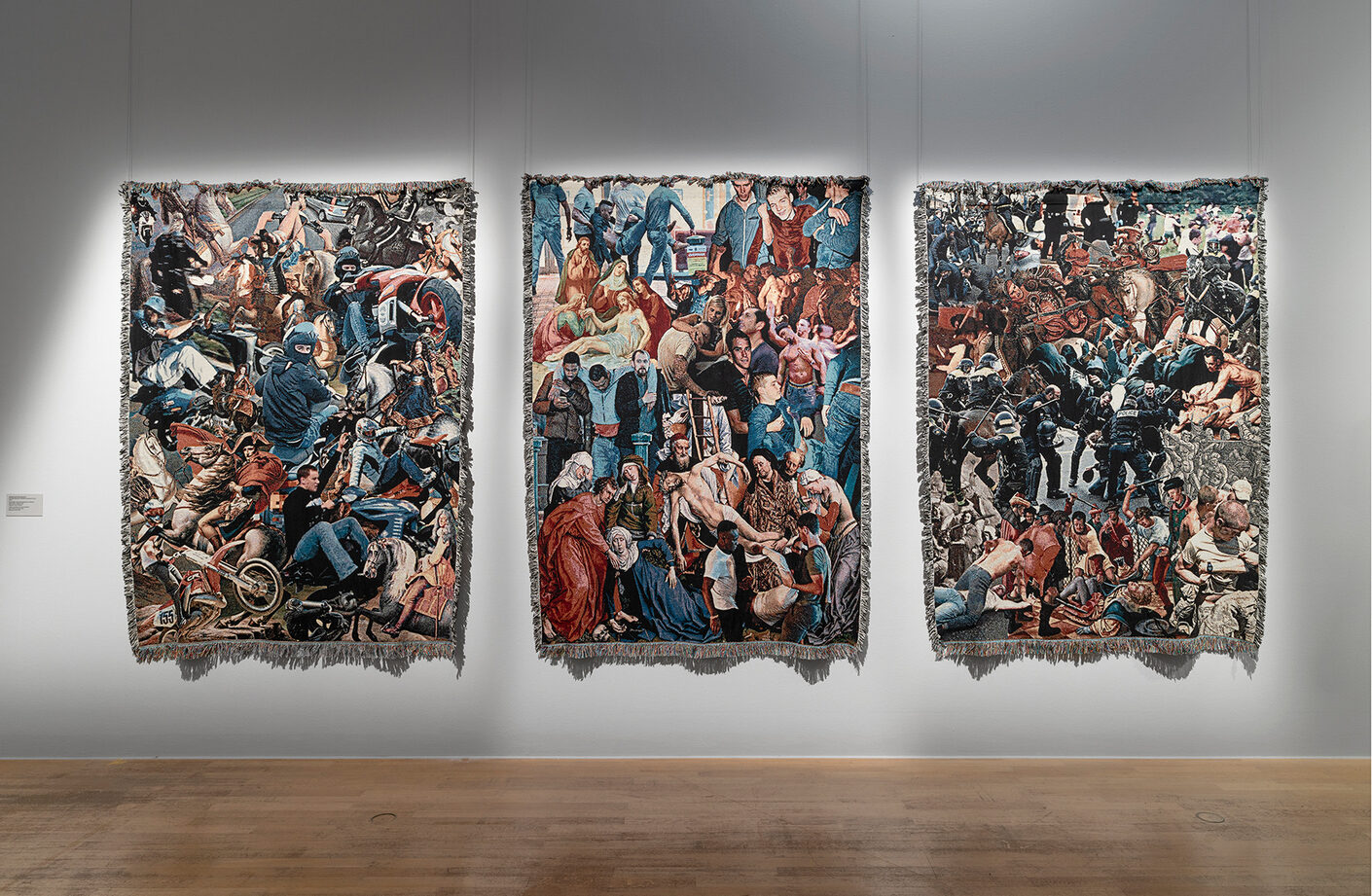 In “A Foolish Pleasure in Wicked Schemes,” Jeroen van den Bogaert uses a triptych made of machine-woven cotton to explore the stereotypical phenomenon of masculinity, from heroism and tragedy to aggression. Staged as collages, the absurdity of the gestures becomes apparent, their meaning lost in the hustle and bustle, the often threatening claim to grandeur appearing refreshingly ridiculous. Faig Ahmed, meanwhile, takes up the tradition of 15th-century Anatolian carpets with “Virgin,” made of hand-knotted wool. In the course of the work, the flat rug becomes a blood-red mass composed of many fine threads. With this textile sculpture, he questions the rites, customs, and gender roles of traditional Azerbaijani society, the iconized role of virgins, and the myth of the hymen. “Virgin” is thus also a warning image that visualizes the social pressure, human rights violations, and social control to which women in traditional communities are subjected.