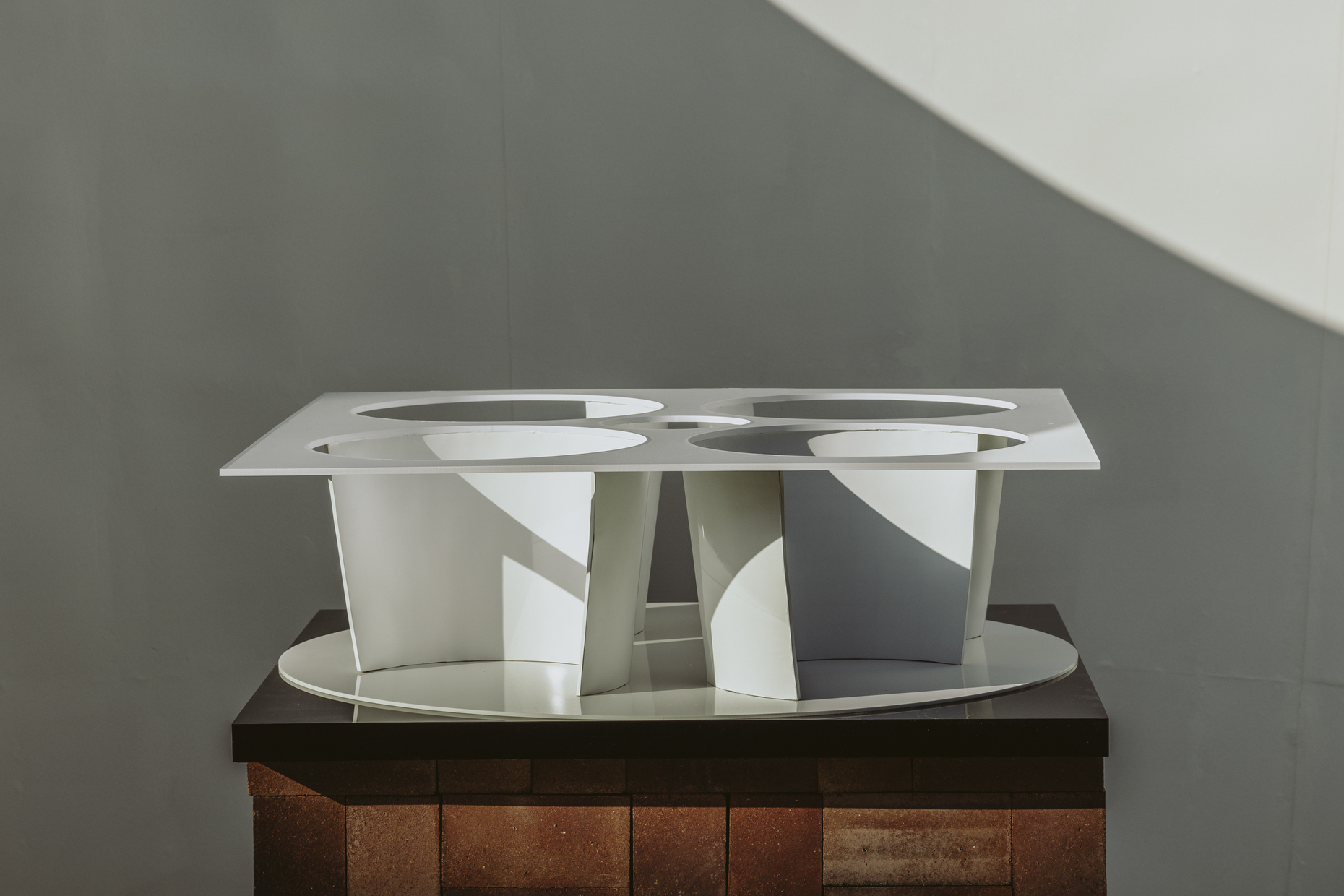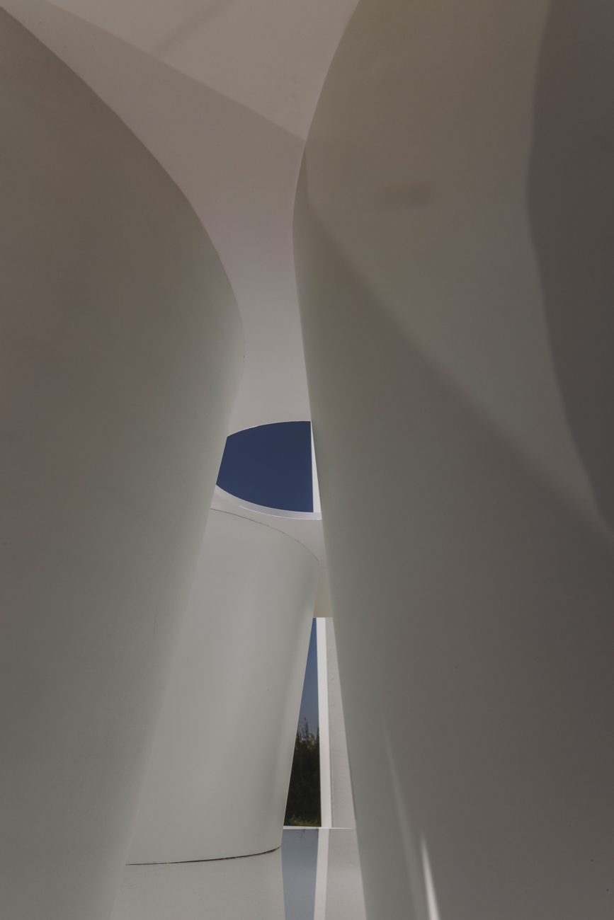 The designers consistently developed their “House” from room units in which there are flowing transitions between indoors and outdoors. Four semi-circular screens that taper conically downwards form the structure’s basic elements. Set up back to back in a circle each of the screens defines a room. The round, conical forms are unmistakably elaborated from the formal language typical for MUT Design products. Their version of “Das Haus” is an ingenious translation of this language into an architecture that explores the topic of “indoors and outdoors”. After all, with their screens they create spaces that are neither clearly in the interior of the house nor clearly in the outdoor area. At the center of the structure behind the four screens the designers have installed a small patio. “In Spanish houses the patio is the main public space. Here instead it becomes the most private place,” says Alberto Sanchez in explaining the designers’ concept.