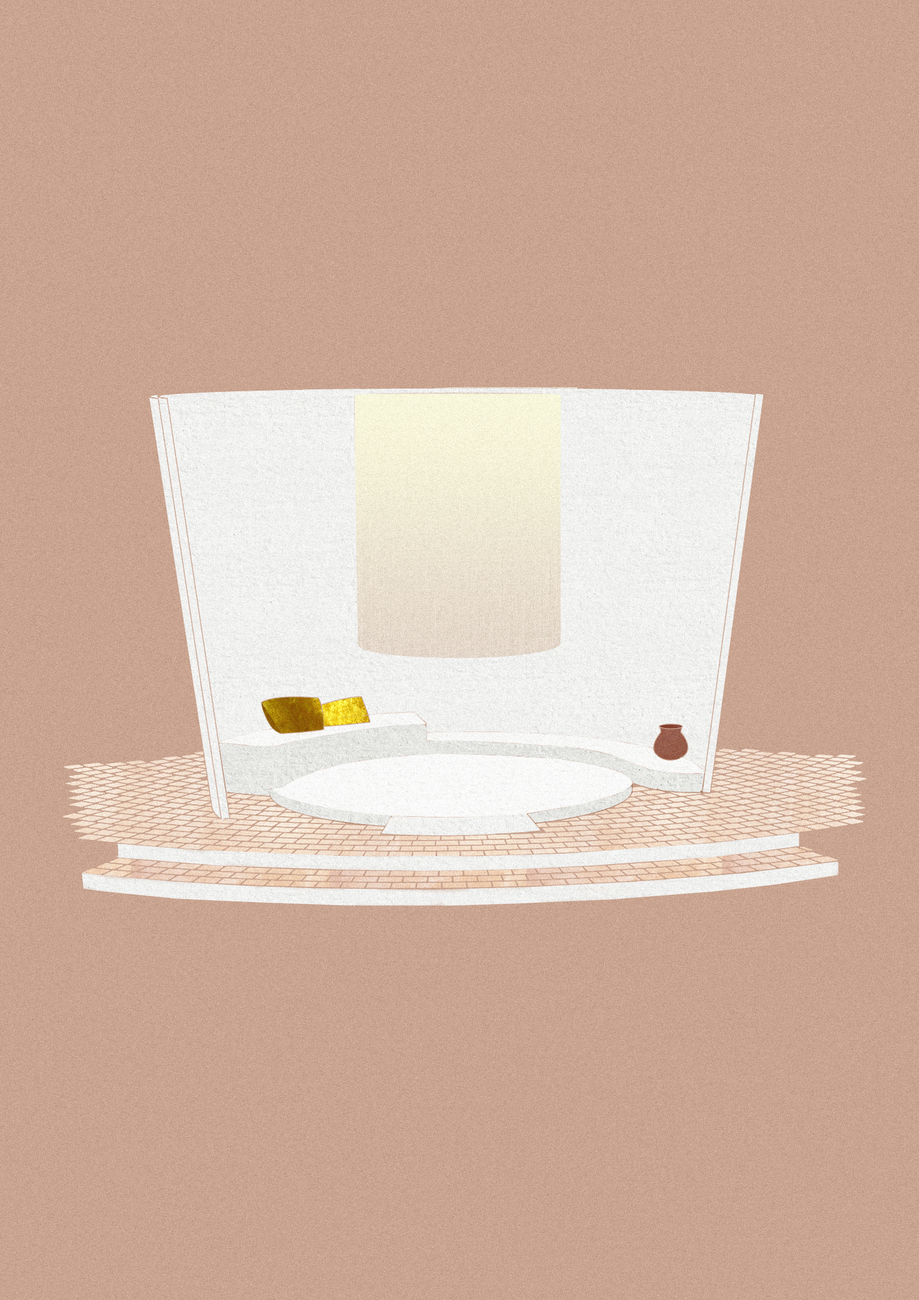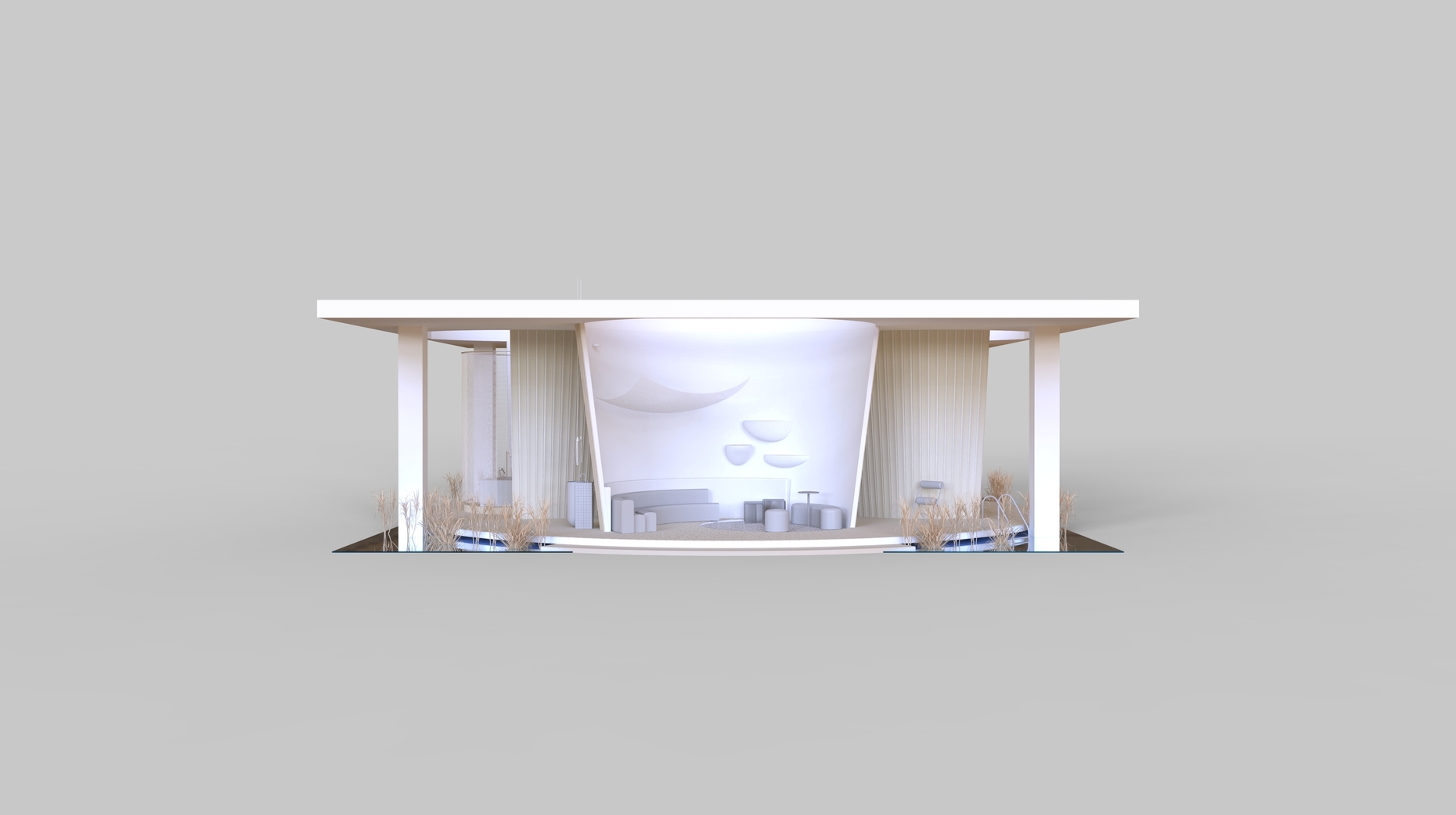 A rectangular roof on four pillars tops the installation “Das Haus”. The designers used large, circular cut-outs to open it above the four rooms. So how to present the connection between their generously open “House” and nature within the confines of the trade-fair halls? They decided to install an artificial stretch of water around the building and christened it “Albufera” after the lagoon by the same name just outside Valencia. Indeed, the city and its architectural culture play an important role for the design. For example, the screens are clad with the tiles so typical for local architecture. Especially for their take on “Das Haus” the designers came up with a wall tile whose design was inspired by Valencian roof tiles. It was produced by ceramic manufacturer Harmony, for whom MUT Design has already developed several tile series. A further reference to the designers’ origins is the white lime plaster known as encalado, which is widespread in Spain. But as it is not possible to use traditional limewash in the fair architecture MUT Design resorted instead to a special plaster rendering courtesy of Detale CPH, which the designer used to produce the impression of encalado in the kitchen of their “House”. The heart of the kitchen is an enormous wood-fired stove like those often used outdoors in Valencia to prepare paella. In the bedroom MUT Design opted in favor of a hammock rather than a traditional bed. It was made to the designers’ specifications and style by Spanish carpet producer GAN, who also supplies a suitable rug for the room. In interpreting the bathroom as a hammam the designers cite the Moorish influence on Spanish culture. In all MUT Design came up with twelve new products for this year’s “Das Haus” at imm cologne collaborating with firms such as Expormim, Diabla and Preciosa Lighting. The furnishings were conceived as a mixture of outdoor- and indoor furniture. Only the patio in the innermost part of the house remains unfurnished. As the only completely private space it destined to be a place of retreat where the visitor can experience intimacy and relaxation. Here it is not a matter of the house opening up to the visitor, but rather the visitor being able to open their own minds.