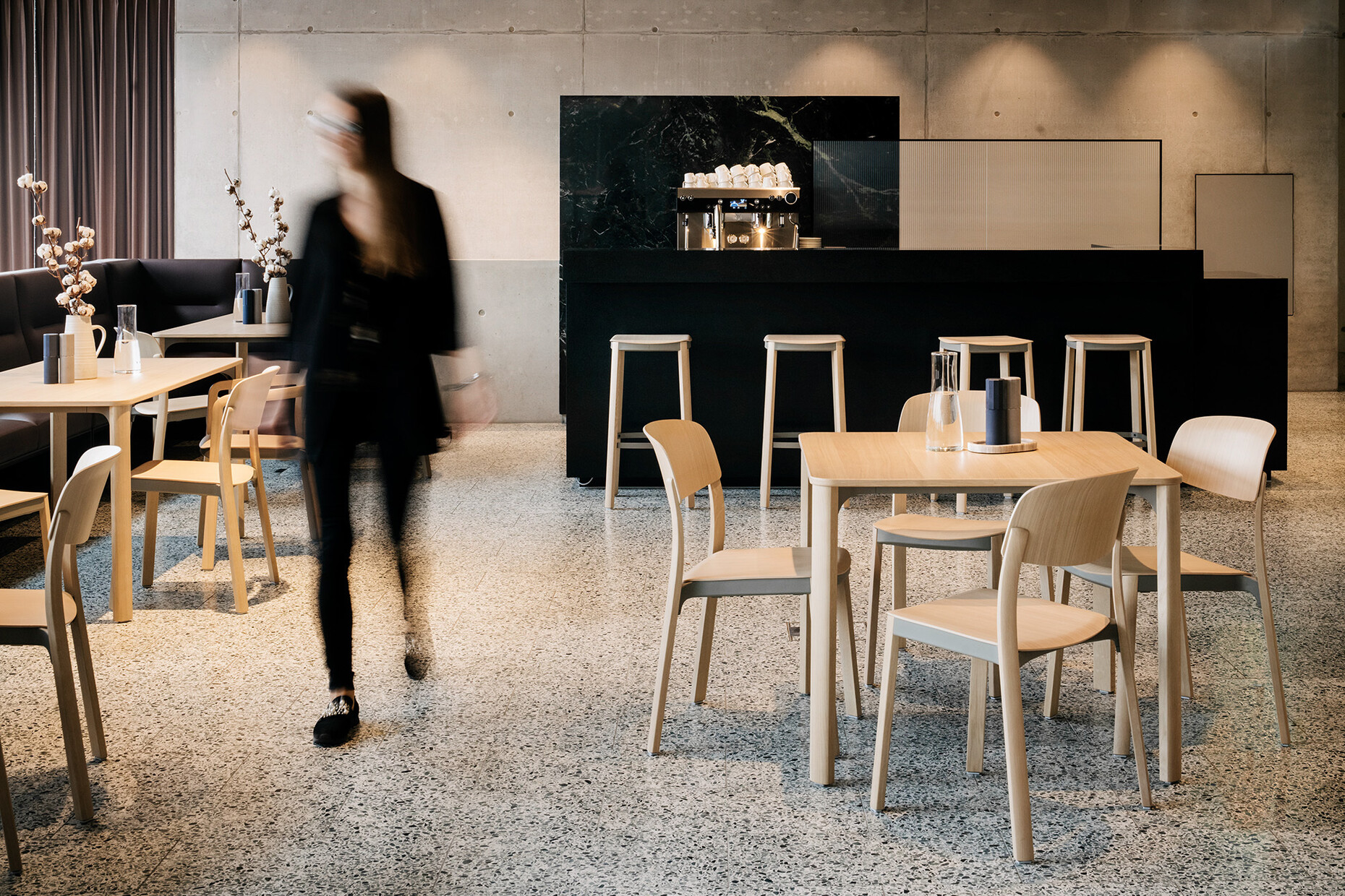 Based on the design, the "nate s" series was also created to complement "nate": a filigree tubular steel variant in a slim industrial design that confidently interprets the core idea of the collection. Instead of solid wood and recycled plastic, the chair is based on a load-bearing construction of stable round steel tubing with a thermosetting powder coating, to which the organically shaped wooden surfaces of wafer-thin molded wood are attached. There are also matching tables, benches, bar stools and stools from "nate s". Both series are particularly suitable for cafeterias and restaurants in offices, public areas or health and care facilities. The wooden furniture fits harmoniously into different rooms not only thanks to the discreet organic design, but also because of a diverse selection of fabrics and types of leather, as well as more than 900 colors with which they can be played with in a variety of ways.