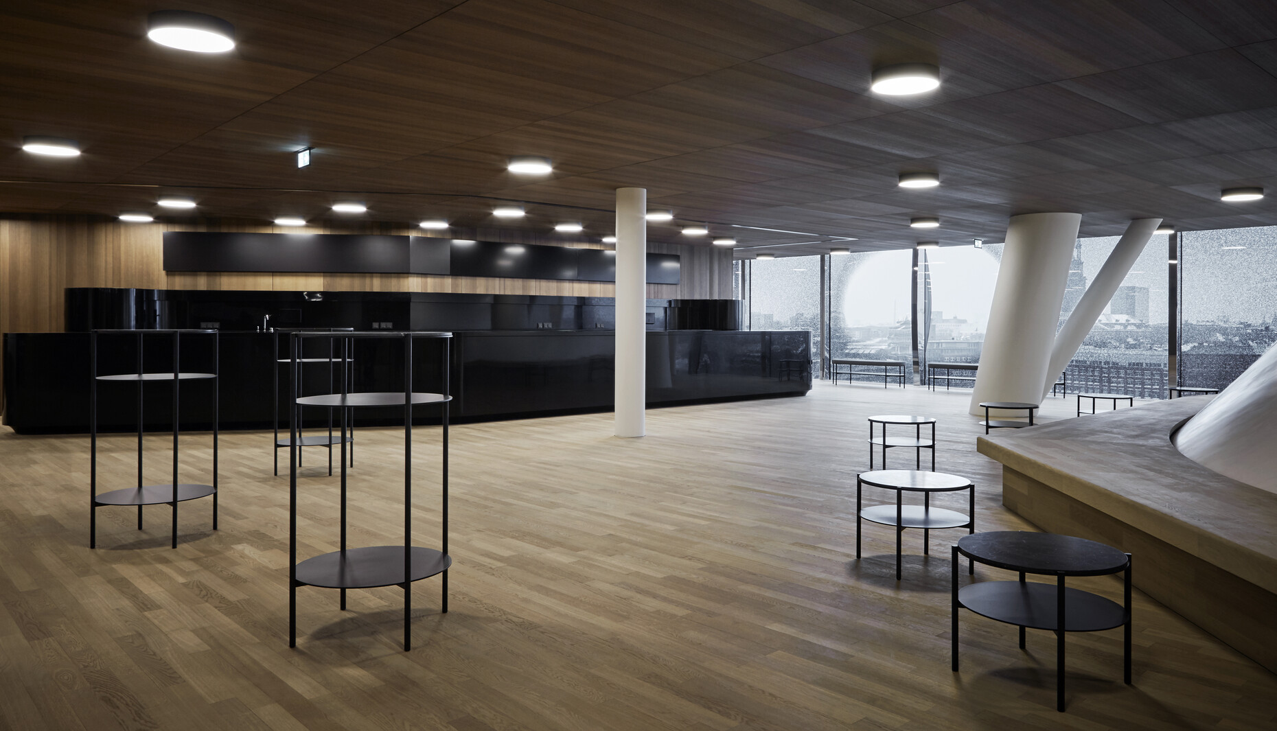 The designers and the architect spent some time searching for a suitable standing table, an upholstered bench and a side-table for the foyers of the Small and the Grand Halls. The architecture creates many visual lines as the Grand Hall’s flowing foyer space extends across four stories. The designers focused on furniture items with complementary shapes. Such products did not exist, so Besau-Marguerre and Schöning designed them. The three almost tender small items are far more robust than you might think at first sight. They do not get engulfed by the space, but are slender enough to stand along the unusually shaped windows, the lively corridors or the large spaces. Each table boasts a round marble top, the benches slender upholstery. The parts subject to the most wear and tear can be replaced. The bench is, like many of the items chosen, covered in “Basel”, a fabric created by architects Herzog & de Meuron. The furniture series will soon be mass produced by a well-known Frankfurt-based company. For the VIP lounge at the top of the Elbphilharmoniegestaltete the team chose a series of black glass and wood tables. The glass base is made of black glass and multi-layering means different degrees of transparency, from translucency to complete clarity. The table surfaces form solid black wooden tops.