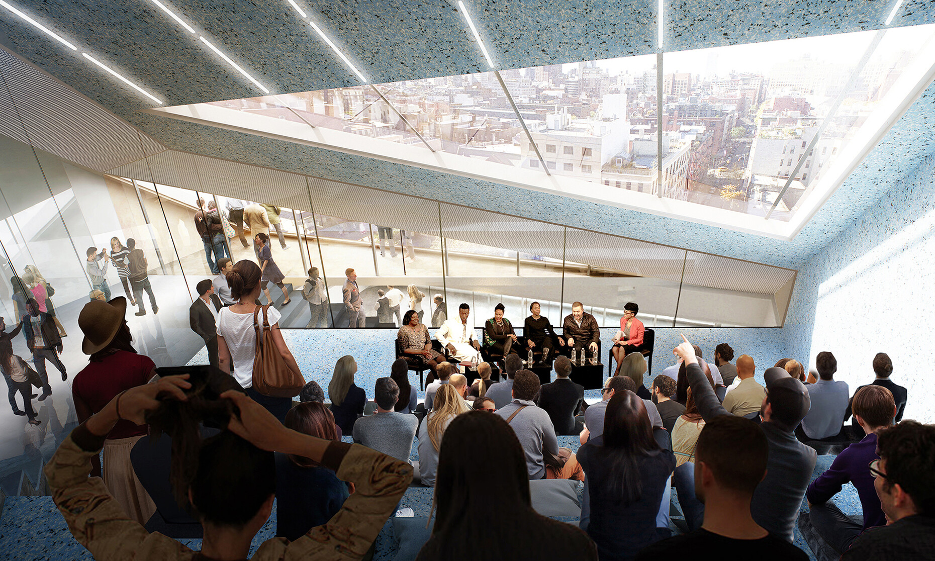 The façade of the new building consists of laminated glass with an intermediate layer of metal mesh and features architectural elements such as right-angled triangles, which appear discreetly. The silhouette thus forms an independent element and yet blends harmoniously into the whole. ‘The New Museum is an incubator for new cultural perspectives and production, and the expansion aims to embody that attitude of openness,’ says Shohei Shigematsu, partner at OMA. The new spaces will be inaugurated with the exhibition ‘New Humans: Memories of the Future’, whose interdisciplinary works explore how technological and social changes are generating new ideas about what it means to be human and creative visions for its possible future.
