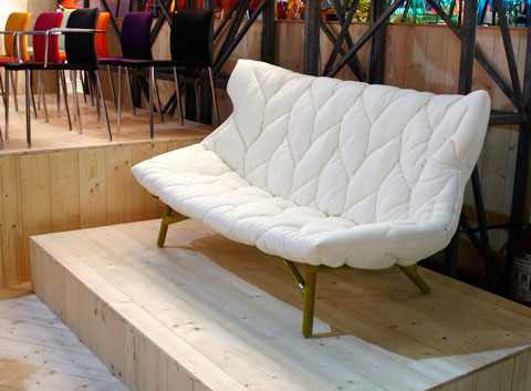 By way of example, the idea for “Biknit” came just one month before this year’s Salone. Nonetheless, Patricia Urquiola and Moroso not only opted to show the lounger at the upcoming fair, but also to assign it an especially prominent position right at the entrance to the stand. Karmelina Martina, the product developer responsible, speaks out in favor, and with a convincing smile, of presenting products during the development phase. She supports the idea of a “transparent” company. Everyone should be able to see what is going on inside the company. She hopes “Biknit” will be available to customers in around a year. Normally, the development of such products takes between several months and two years. The main reason, she argues, why a prototype occasionally does not make it on the market is the price. Alongside “Biknit”, Moroso showed many more prototypes in the front of their stand, such as the “Moon Chair” by Tokujin Yoshioka and the “Impossible Wood Chair” by Doshi Levien; the rear of the stand and the VIP area were made over to products of recent years that are now available.