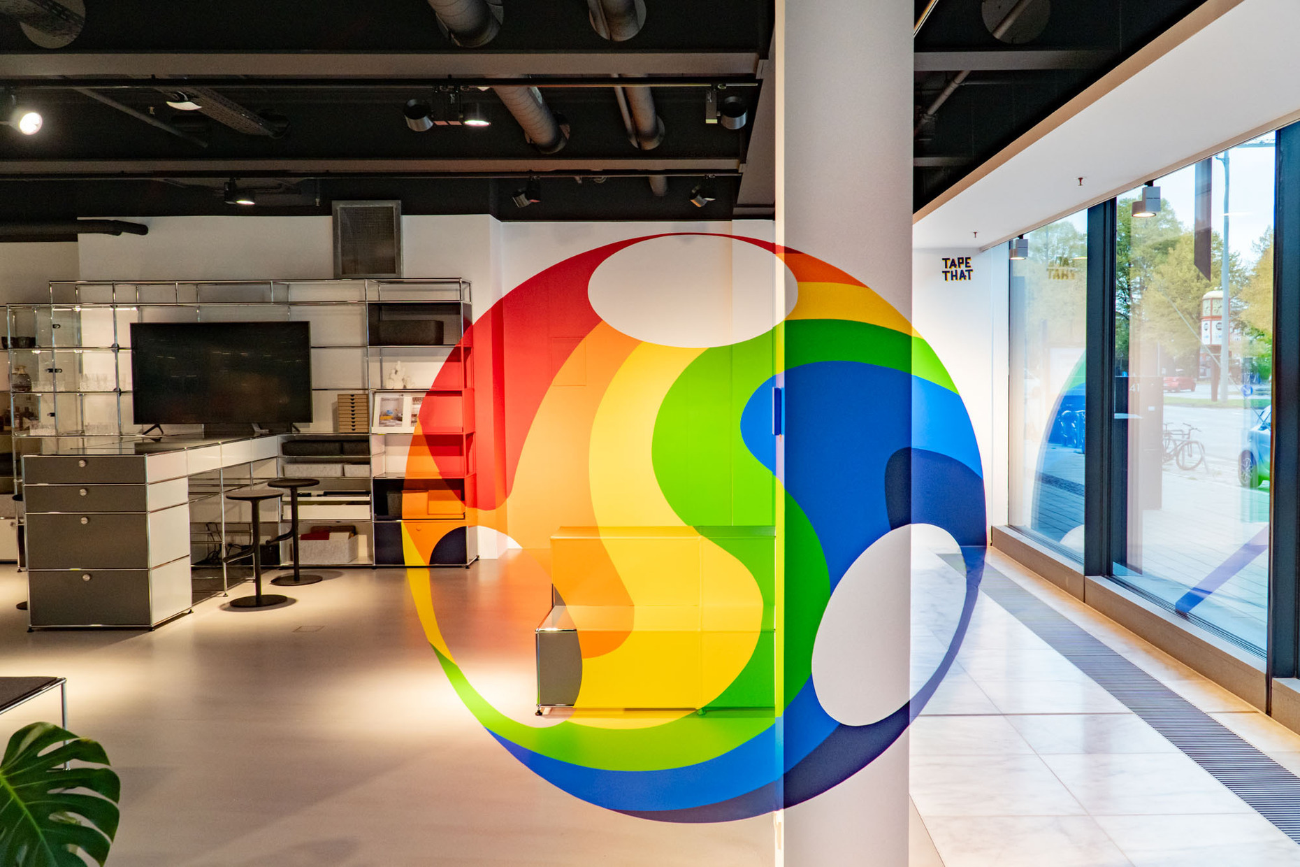 To accompany the exhibits there is an installation by Berlin-based artists’ collective TapeThat, which is well known for its artworks made of adhesive tape with which it decorates not only public spaces, but also clubs, empty buildings and galleries. The artists’ brightly-colored tape running diagonally across the Hamburg showroom’s glass façade forms a cheerful contrast to the postwar Modernism of the Finnlandhaus. In the interior, the tape artwork then merges with the furniture on show to create a ringlike composition which, depending on the angle from which it is viewed, appears as either a single entity or the sum of all its parts, thus once again taking up the idea of bringing things together. (ar)