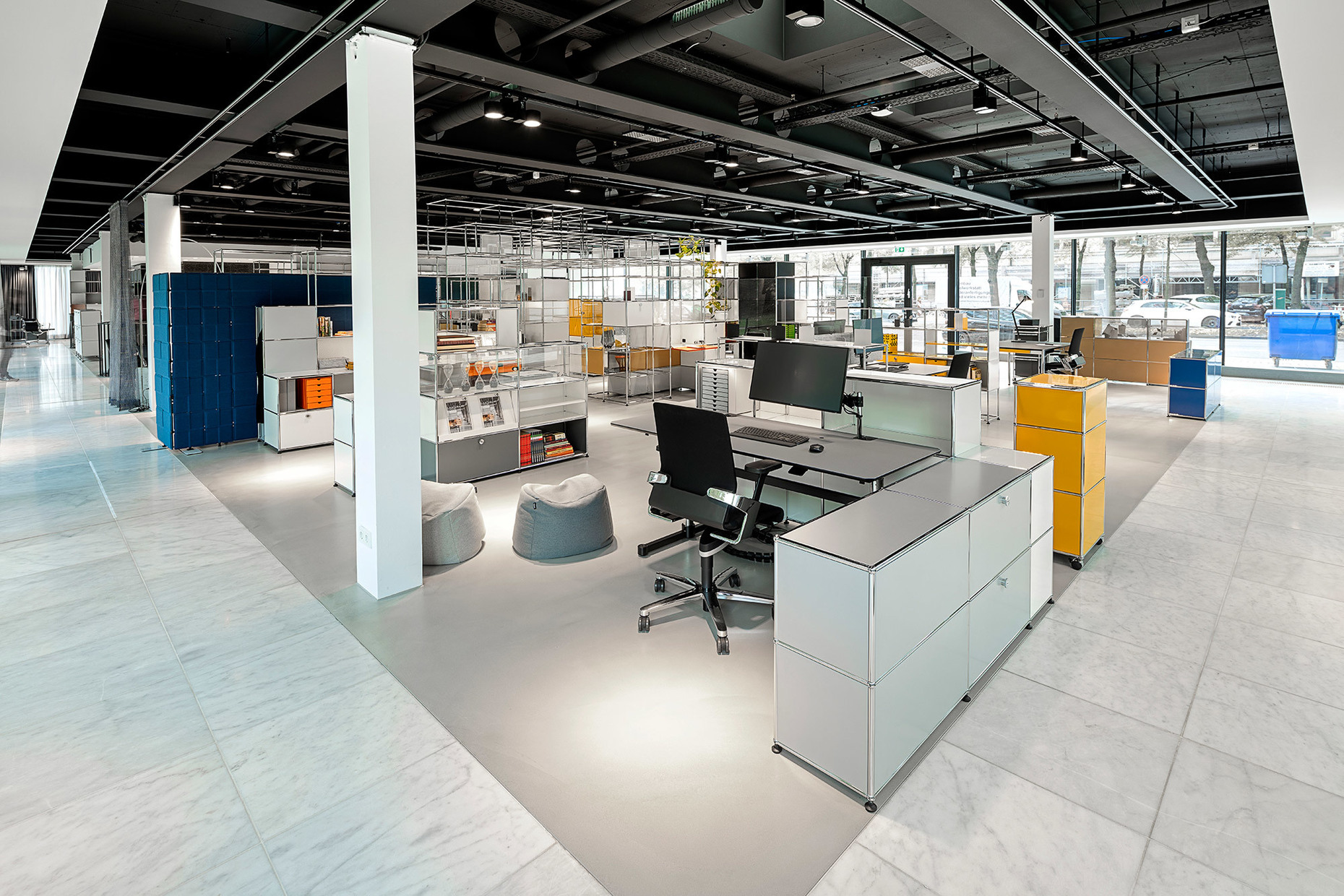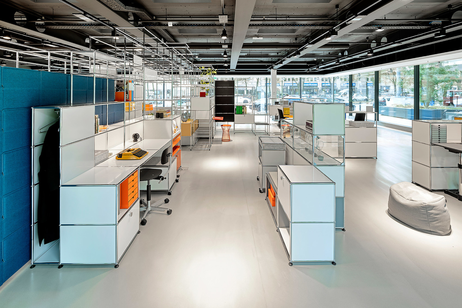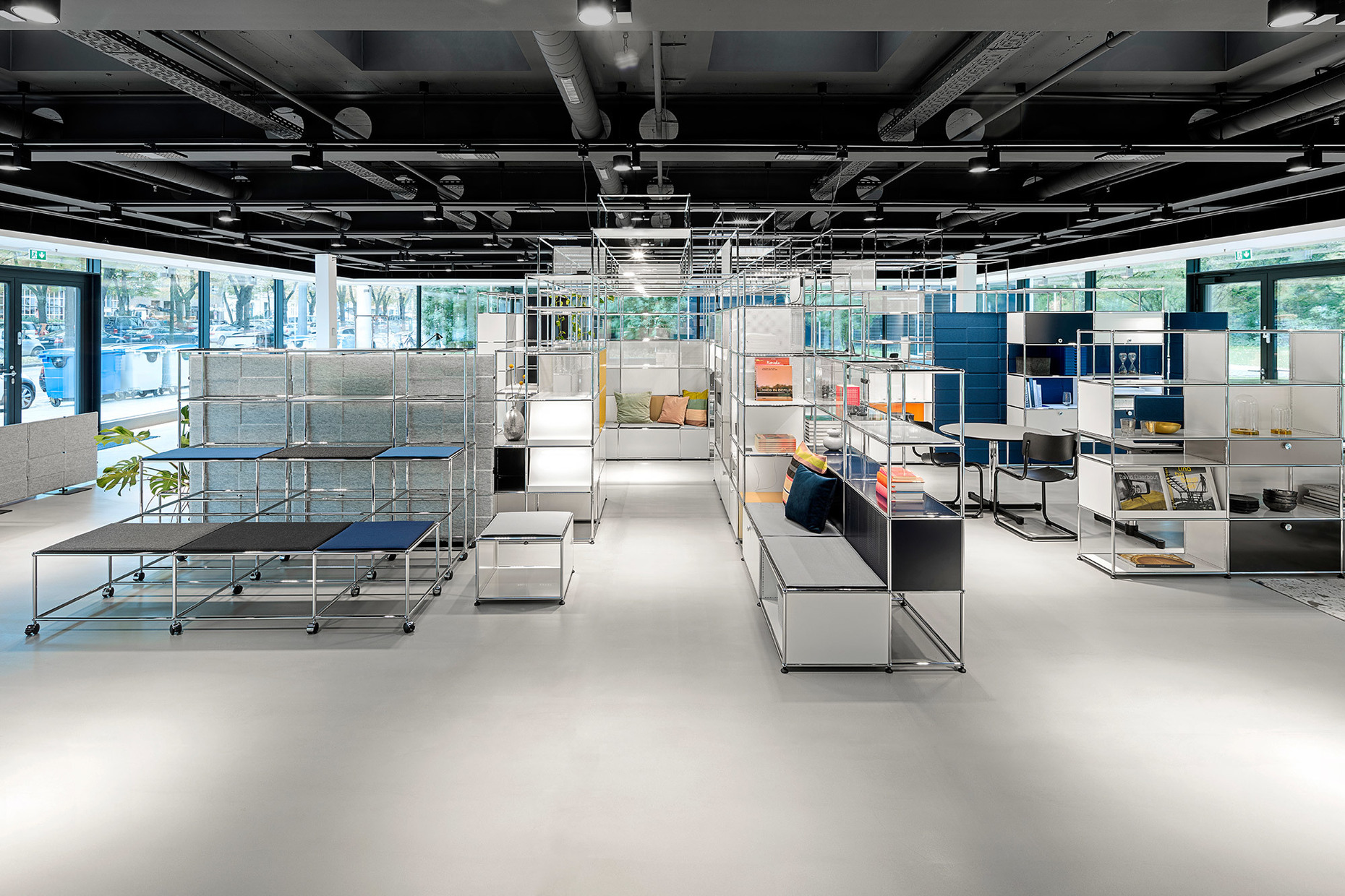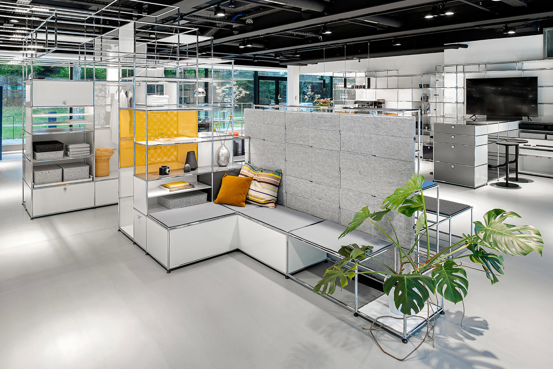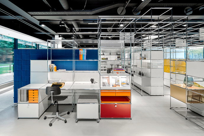 The subject is also reflected in the new showroom in Hamburg that opened at the end of October in premises in the Finnlandhaus building on Esplanade 41. The location could not have been a more suitable choice since the latter building designed by PP Hentrich-Petschnigg & Partner KG is a mere three years younger than the furniture-building system “USM Haller” designed in 1963. At Finnlandhaus across exhibition space totaling 368 m² USM is presenting, a large range of areas in which living and working merge in one spatial network. The “USM Haller-System” allows for a fluid transition between storage space, work zone and spatial niches for social interaction. Within the overall structure, the individual office shelves can be transformed in the twinkling of an eye into benches, wardrobes, reception desks, office desks or cabinets for personal effects. The adaptable system with its wide range of accessories such as the “USM Inos box set” and the “USM Haller E” with matching office furniture such as the “USM Haller Table”, the “USM Kitos” and the “USM privacy panels”, offers many forms of interaction.