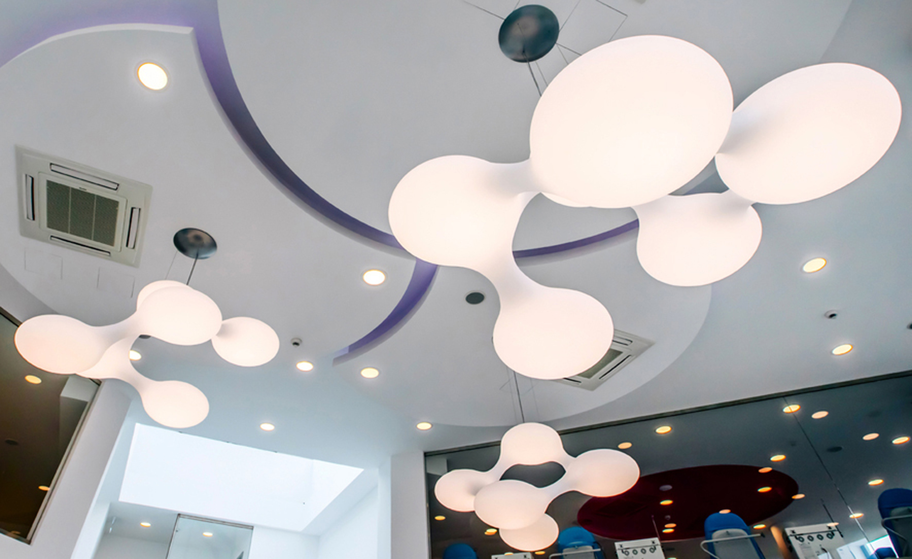 Clinical environments have very high hygiene standards, but are also supposed to convey a sense of wellbeing. This was taken to heart by the Csiszér Design office when developing the interior of the entrance hall of the blood plasma center in Székesfehévár, nr. Budapest in Hungary. The interior architects opted for next lighting’s “Cosmo” dimmable pendant luminaire – the light zestfully but unobtrusively toys with the height of the space. The organic shape of the luminaire is made up of six flat spheres that are inter-connected. The design of the luminaire, which is 160 centimeters across, is clearly brings to mind the molecular structure of platelets. Moreover, “Cosmo” looks different each time you change your vantage point. The luminaire was designed by Constantin Wortmann at Büro für Form. Using an RGB color changer, the color mood of the dazzle-free light can be adjusted individually.