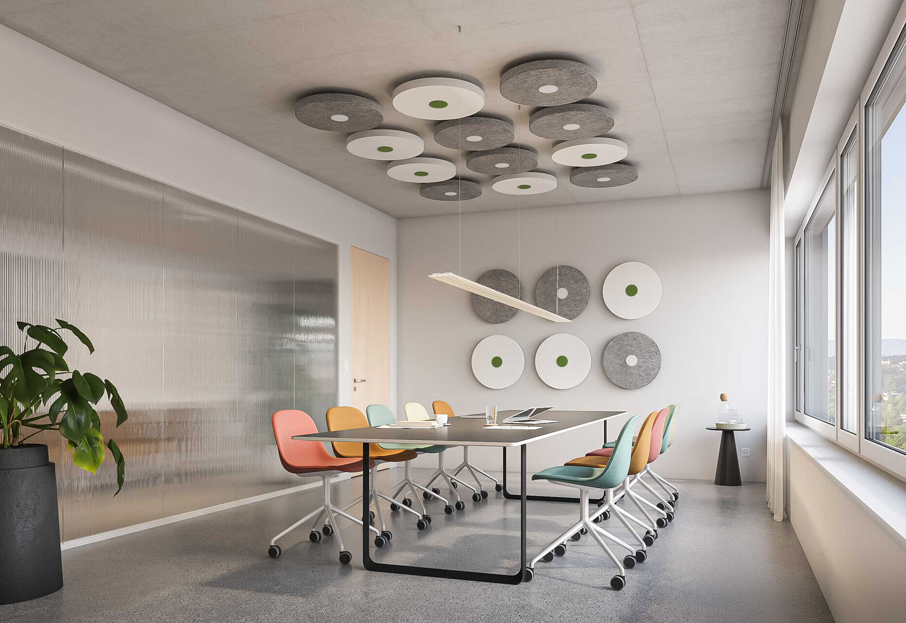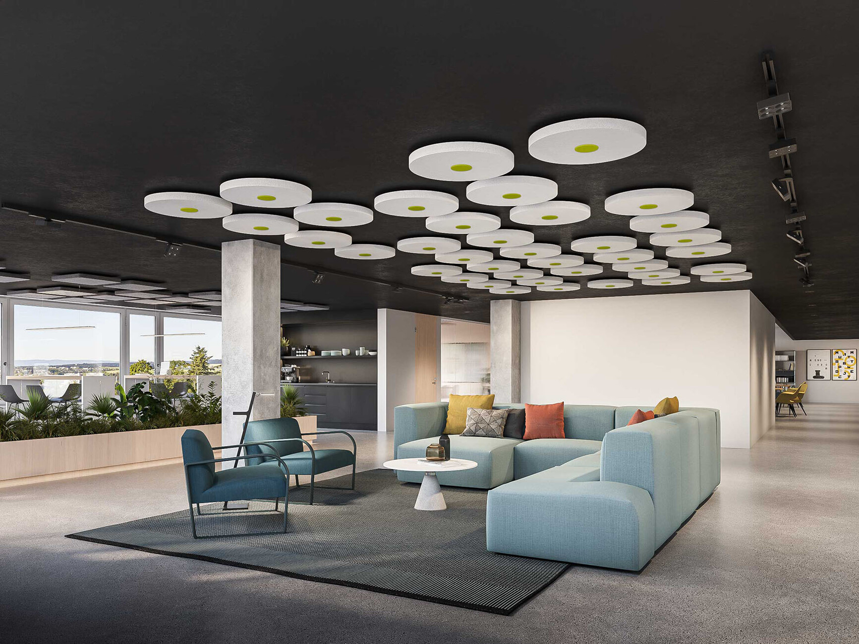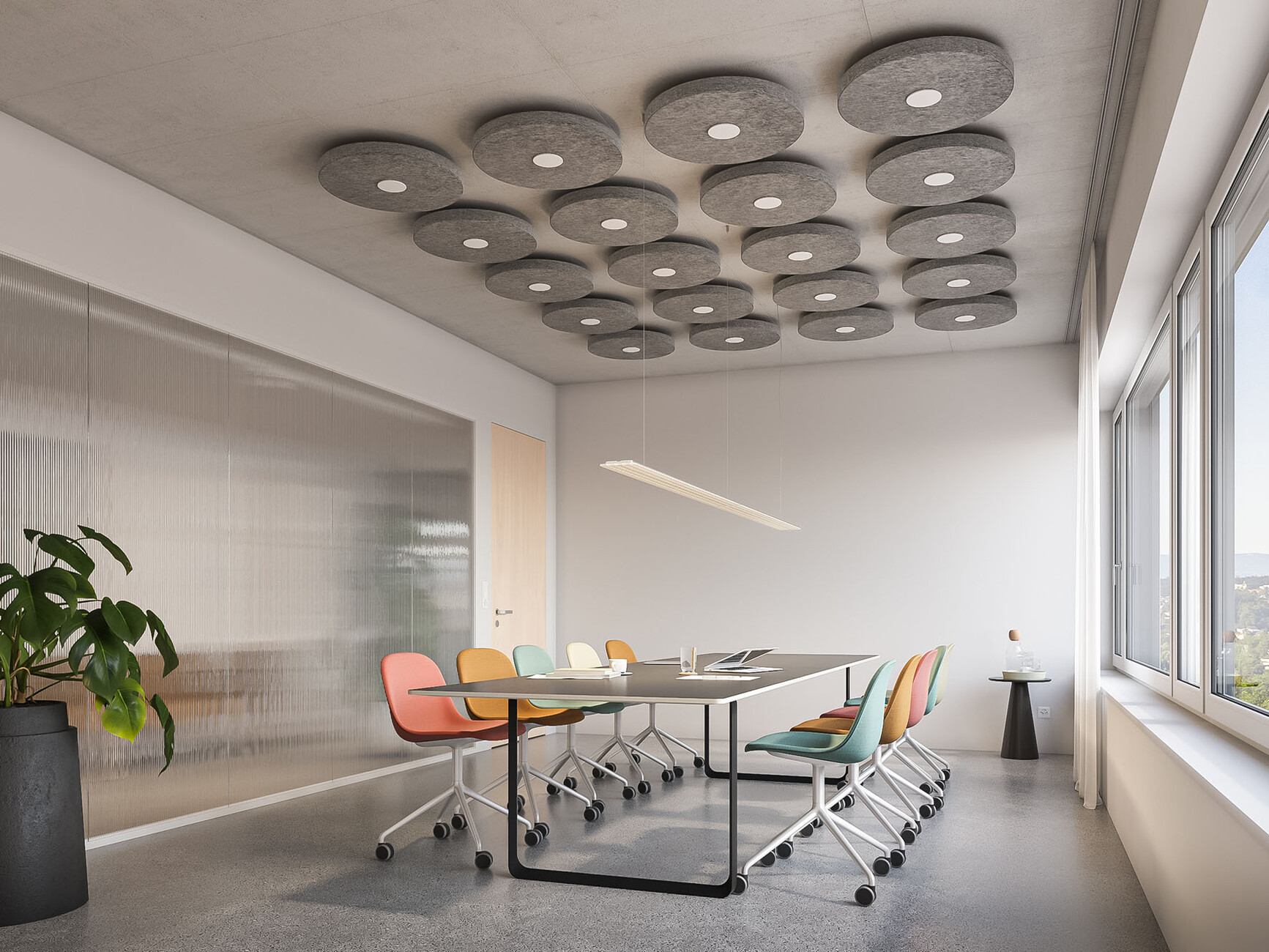 Along with the spatial arrangement, the different color variants play an important role in the design concept: The “Disc Elements”, for example, are available in white or a mottled gray, while the Dots are offered in warm, nature-inspired shades such as Vineyard, Soft Moss, Yellow Field, Far Mountain, Nightfall, and Grey Dawn, but also in Black Ink or a classic White. At the same time, “Disc’n Dots” can be color-coordinated with the “Rossoacoustic Pad System” or with light-acoustic solutions from the Nimbus Group such as the “Lighting Pad” or the “Lighting Pad Lounge”. It is also possible to paint the Dot individually, which affords interior designers additional scope. In this way, large conference rooms, meeting points, and office spaces can be transformed into pleasant sound zones that also feature a successful interior concept.