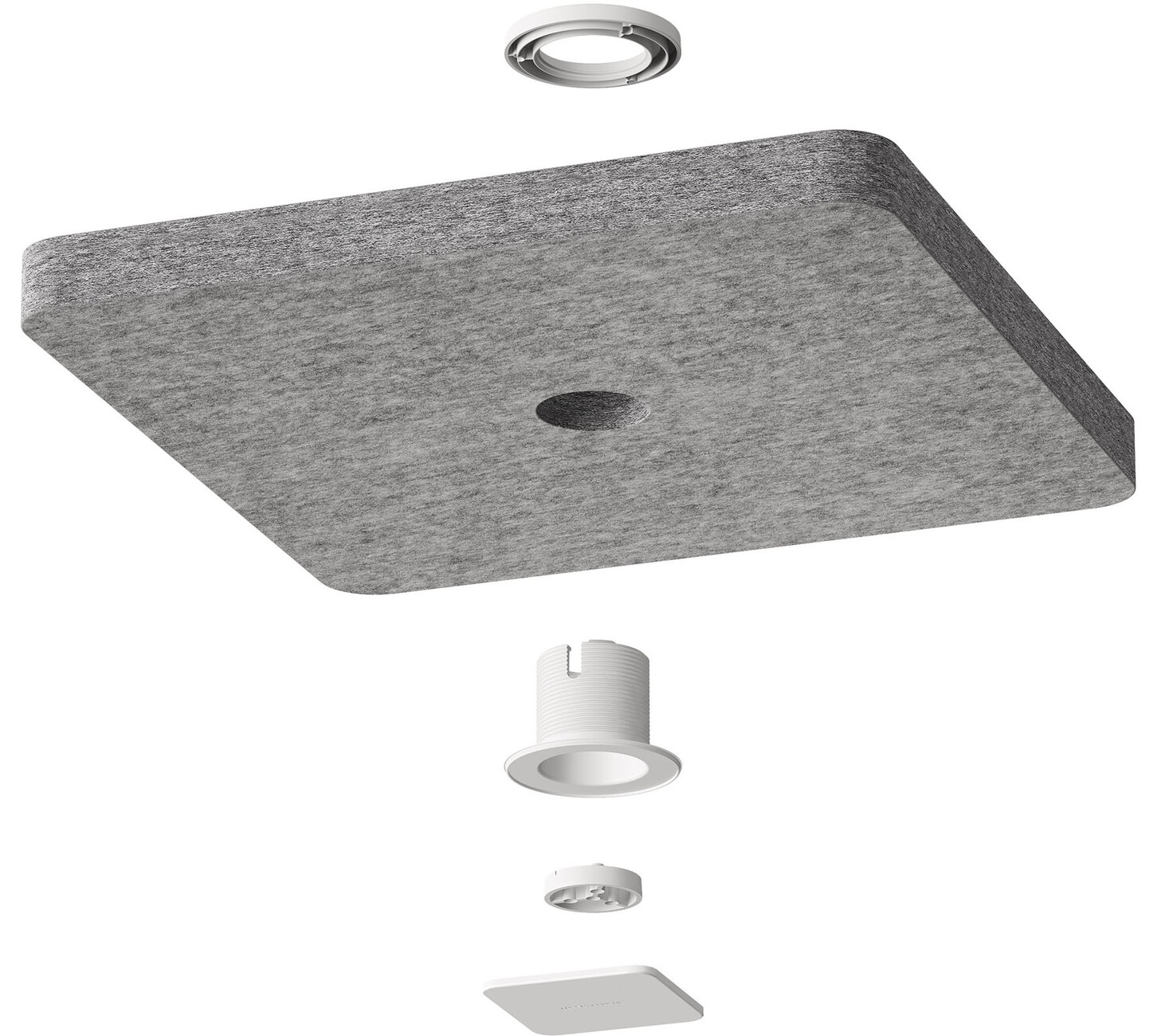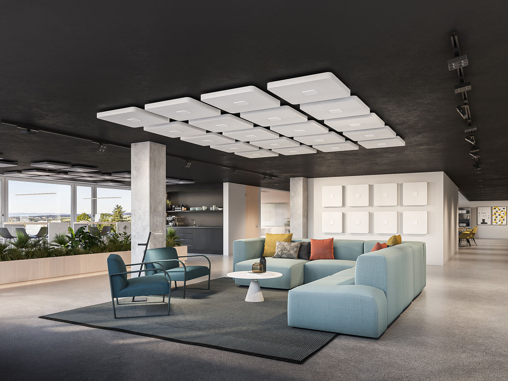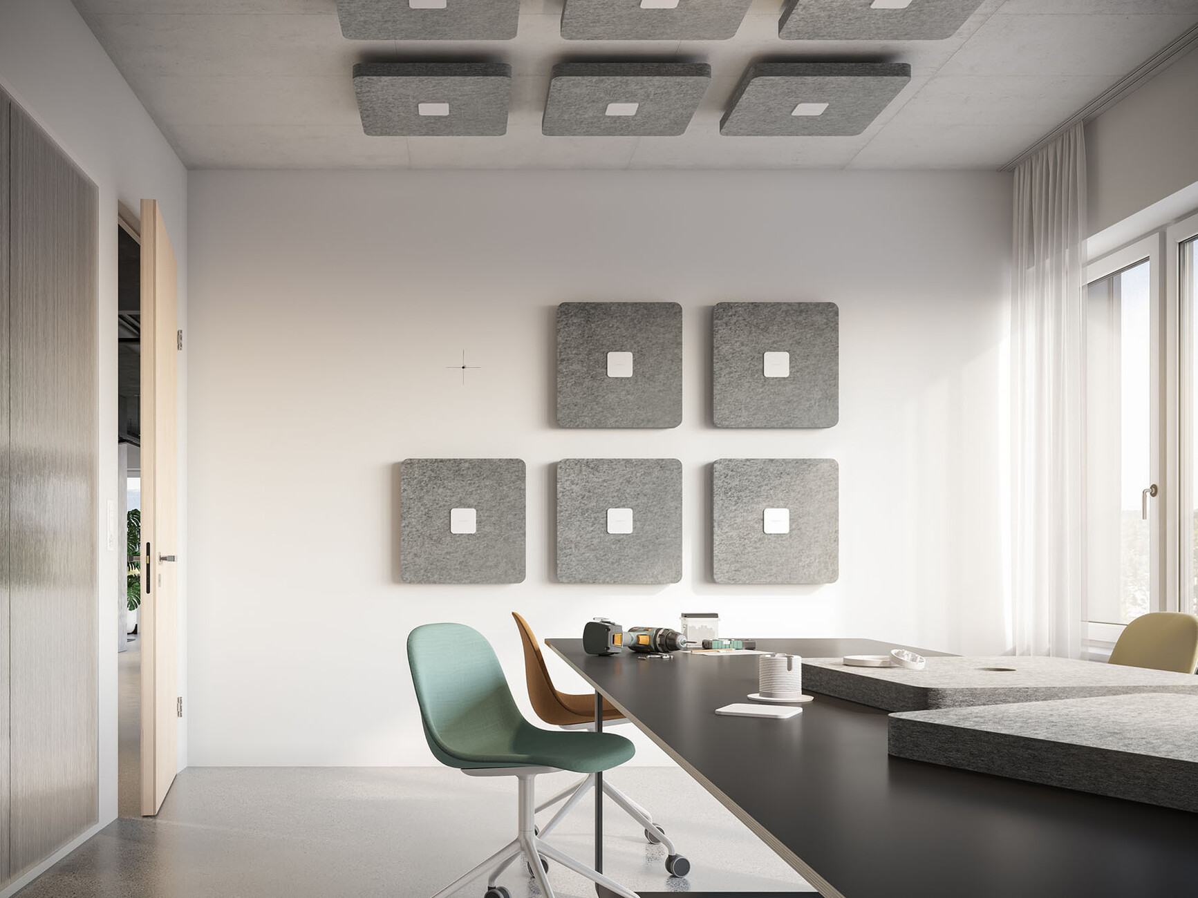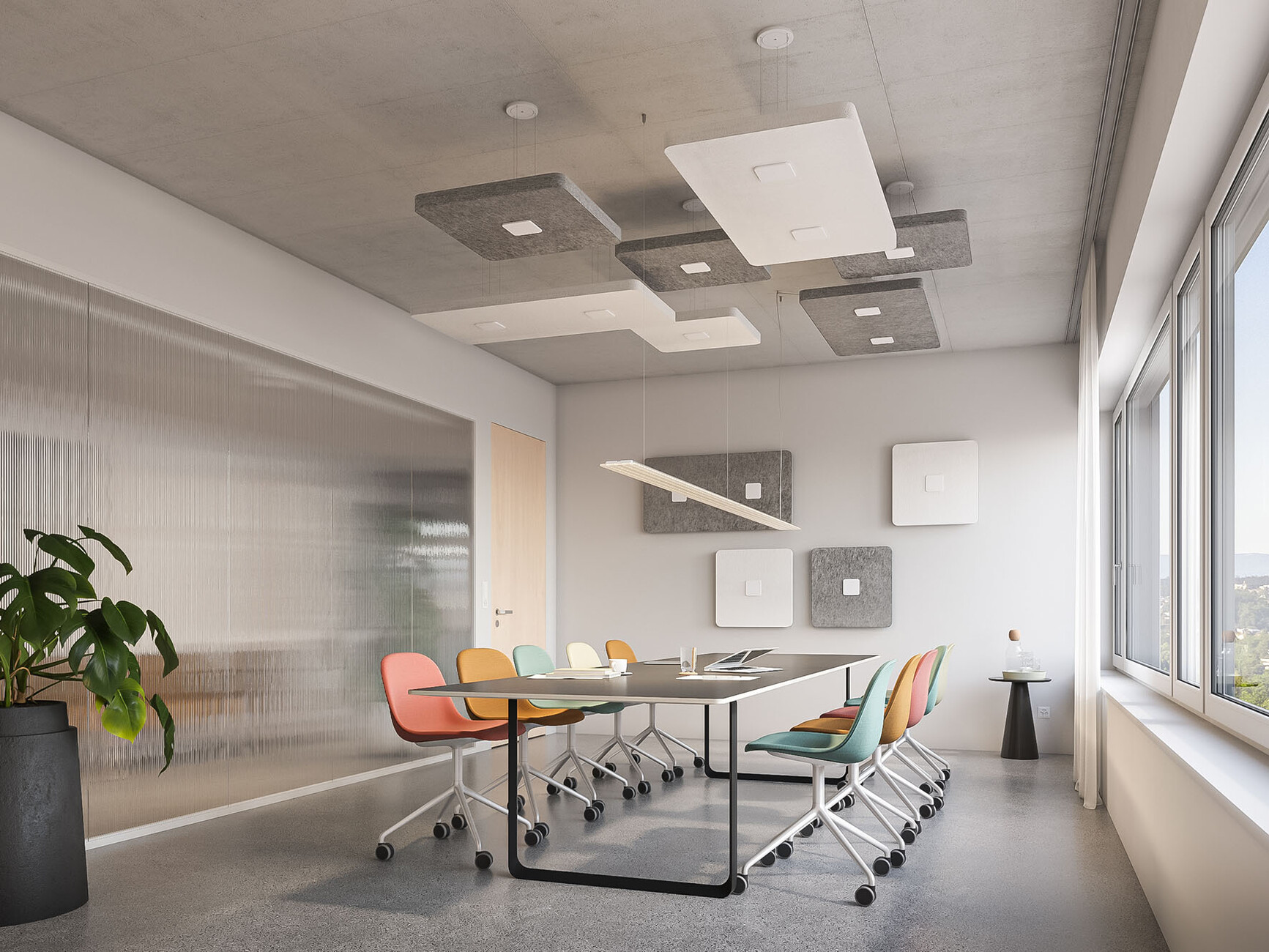 Along with the spatial arrangement, the different color variants play an important role in the design concept: The “Disc Elements”, for example, are available in white or a mottled gray, while the Dots are offered in warm, nature-inspired shades such as Vineyard, Soft Moss, Yellow Field, Far Mountain, Nightfall, and Grey Dawn, but also in Black Ink or a classic White. At the same time, “Disc’n Dots” can be color-coordinated with the “Rossoacoustic Pad System” or with light-acoustic solutions from the Nimbus Group such as the “Lighting Pad” or the “Lighting Pad Lounge”. It is also possible to paint the Dot individually, which affords interior designers additional scope. In this way, large conference rooms, meeting points, and office spaces can be transformed into pleasant sound zones that also feature a successful interior concept.