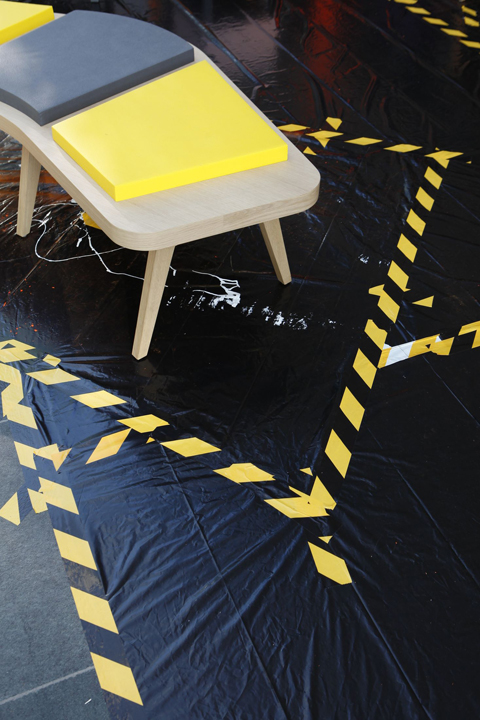 We are in the middle of a building site. Beer is moved around in wheel barrows, people serve themselves meat-loaf and grilled sausage from the building-site buffet and sit on beer crates. No ... not the topping out ceremony for a new building, but Munich's 'Architektur Sommer', where consultants in office design, the 'Bromberger Büro Gestaltung' company, have invited us to the glass atrium of "Nymphe 5". Something like 250 guests, mainly architects and planners have come to this event organised by consultants Wengmann + Rattan (known amongst other things, for the Munich Design Parcours). The overarching theme "Construction site" makes for an unusual atmosphere and a refreshing alternative to the usual champagne receptions and cocktail parties. The firms represented by the Bromberger design studio - Object Carpet, Montana, Quinze&Milan, Montis, Interstuhl, Holzmedia, Element one and Invista/Antron were enjoined to bear the theme in mind in their presentations. This has been very successful, and particularly so in the case of Quinze&Milan. Banners, which have been individually designed and manufactured in vinyl by the different companies, are spread out on wall-papering tables, and guests can cut themselves a piece off the end and have it sewn into a bag on the spot. One of the highlights is the work of textile artist Stephanie Müller who, in her fashion show, presents individual clothing items and accessories that can then be combined with one another at will, according to the principle of the construction set. Fashion and architecture merge in the show to a single discipline, messages are 'embroidered' into the construction-site fences; as always with Stephanie Müller, it is also all about the subversive appropriation of public spaces. In New York, 'embroidering' construction-site fences appears to be a particularly popular medium, the creative successor, as it were, to graffiti, as we learn from the artist, who has devoted herself to the topic in several publications.