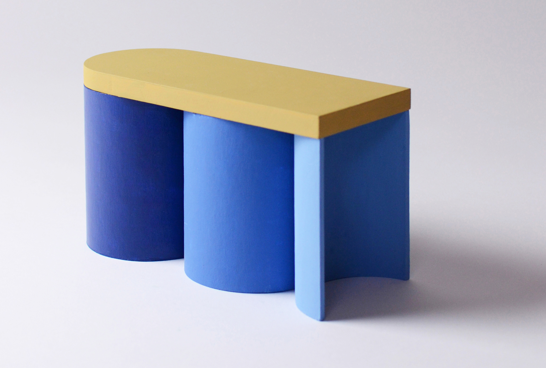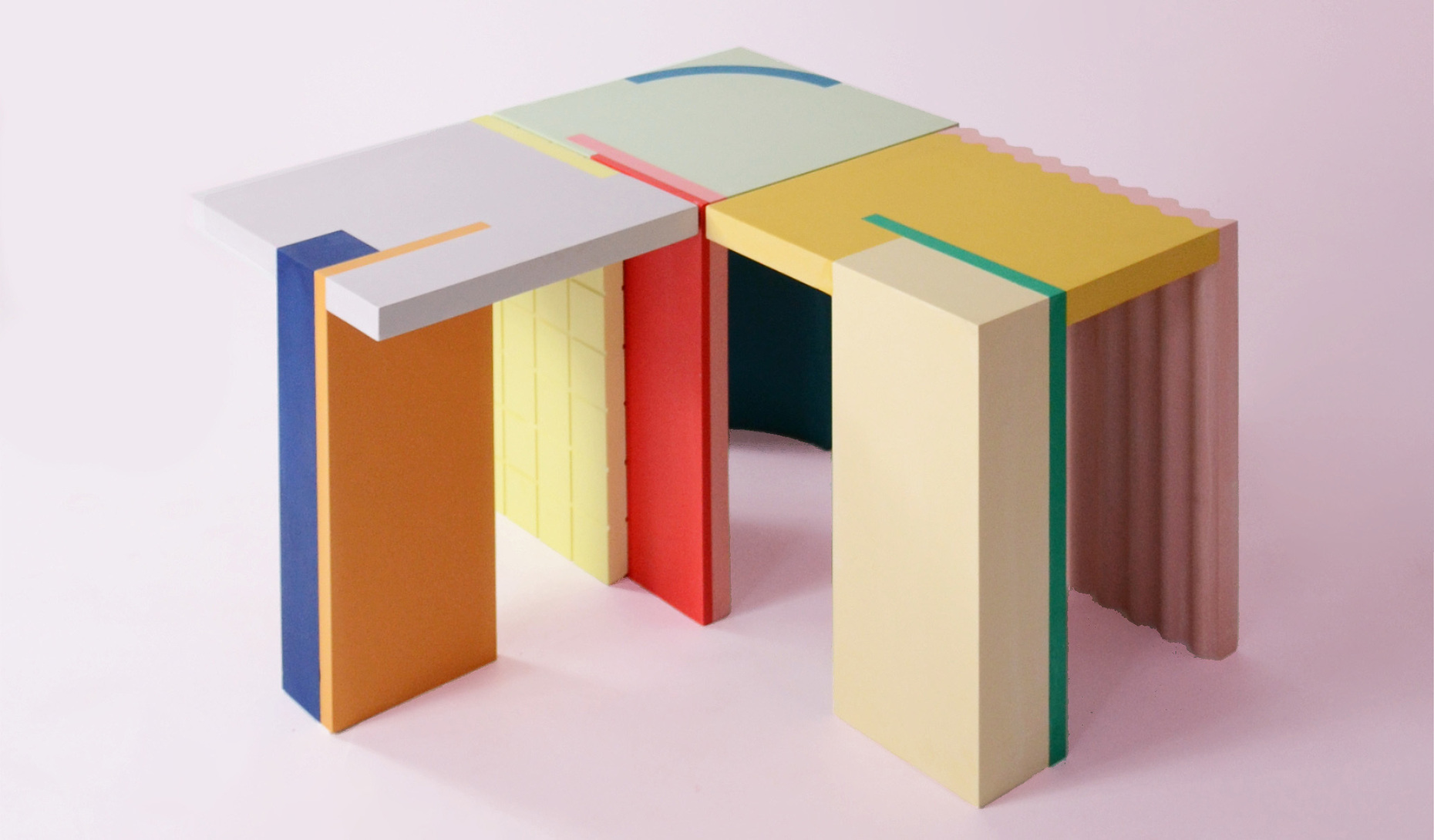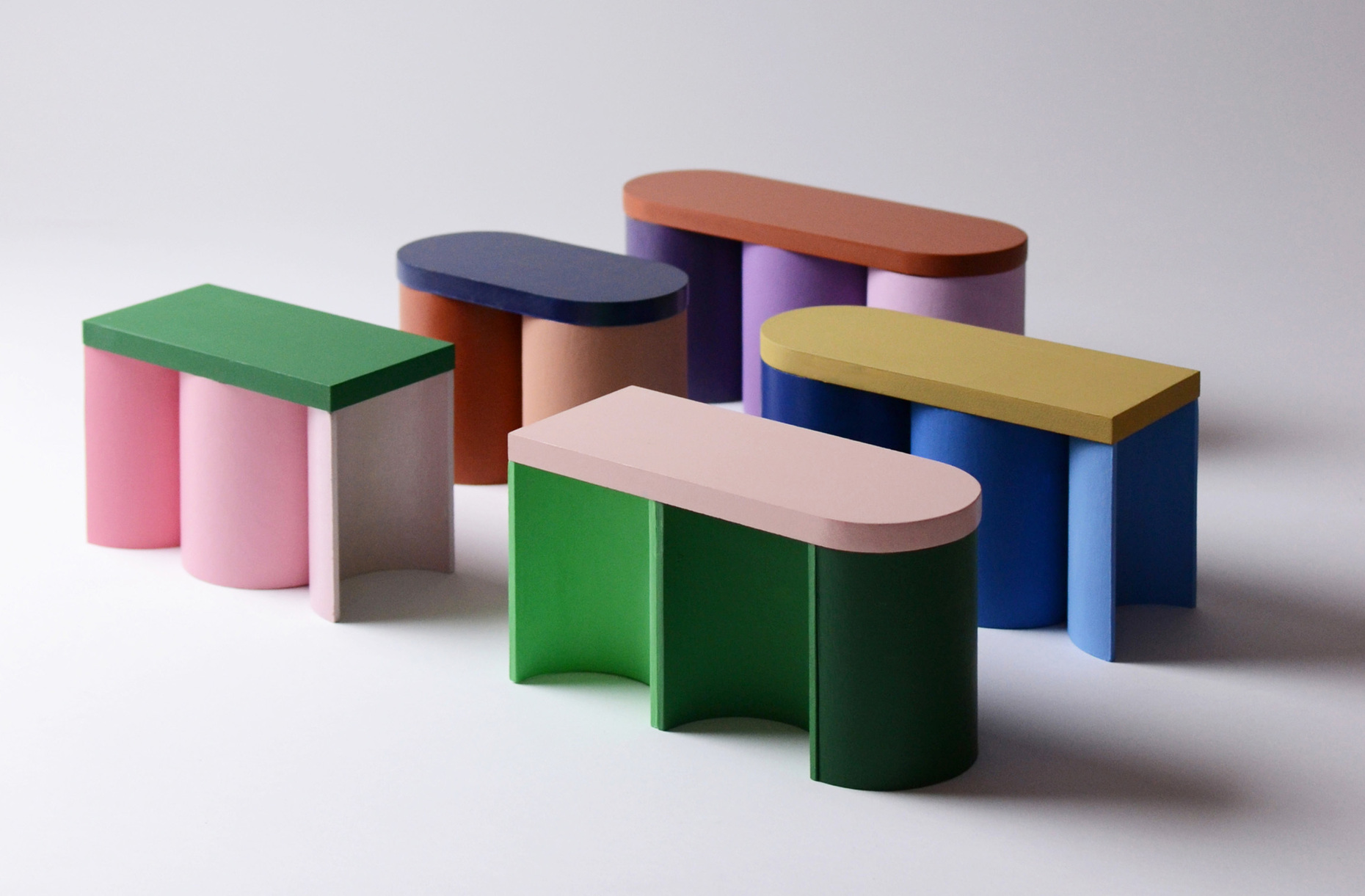 Gratings, pipes, paving stones - Kathleen Opdenacker and Jef De Brabander from the design studio Nortstudio were inspired by building materials to design a bench. "Urban Shapes" lifts material and form out of their context. The individual elements made of wood or anodised aluminium are connected to a steel grid that can be moved flexibly. The graphic effect is enhanced by the colouring: the stereometric basic shapes and grids are each single-coloured. To maintain the brilliance, no black is added to the pigments. The heterogeneous combination plays with the contrasts. The modules of the "Graphic" side tables made of acrylic also have a different structure and colour.