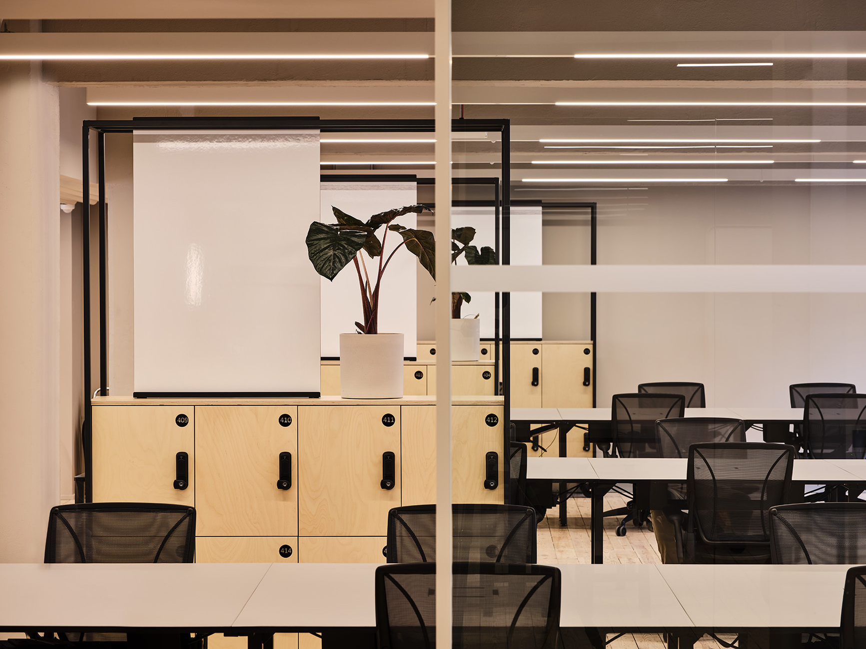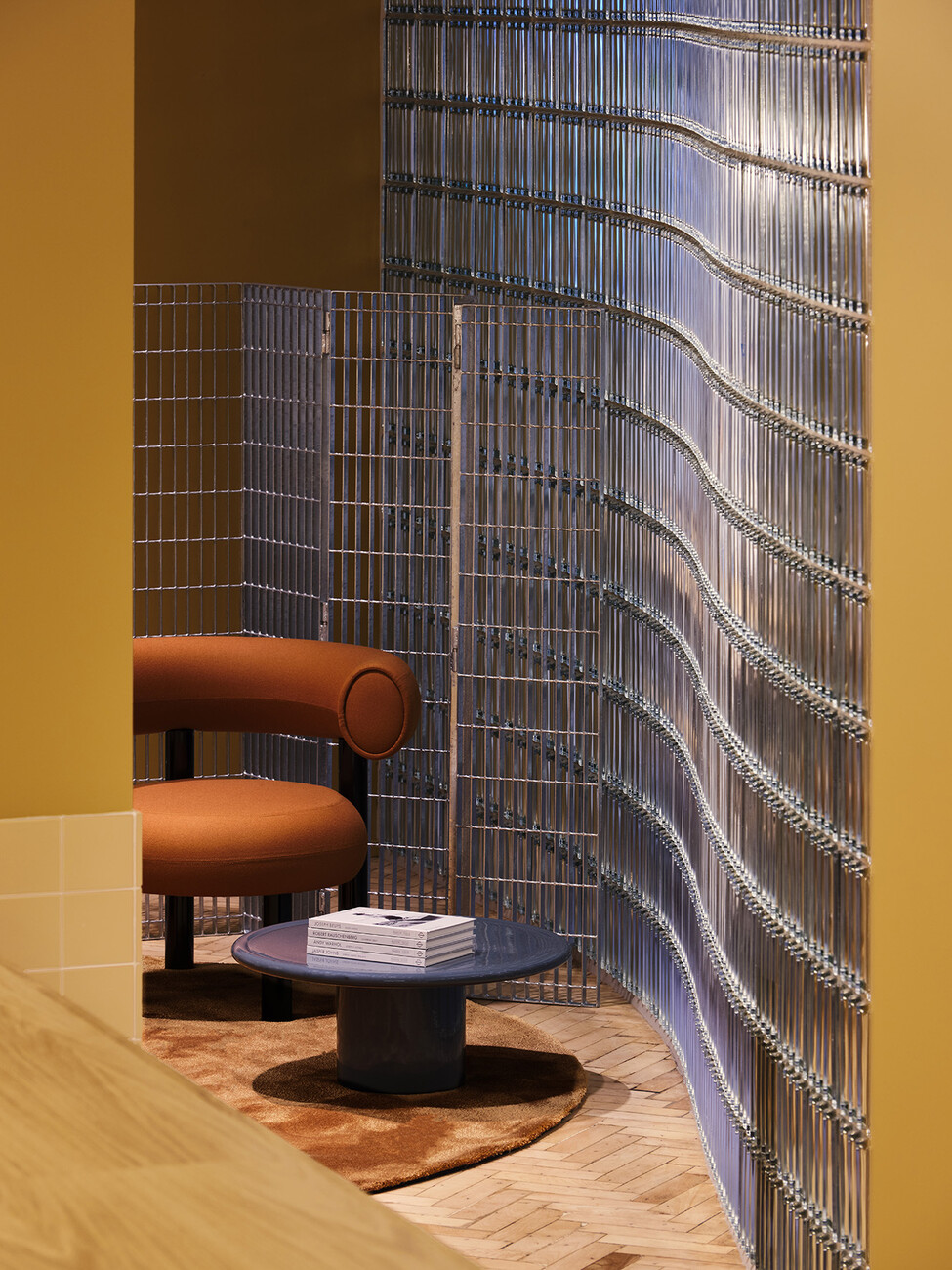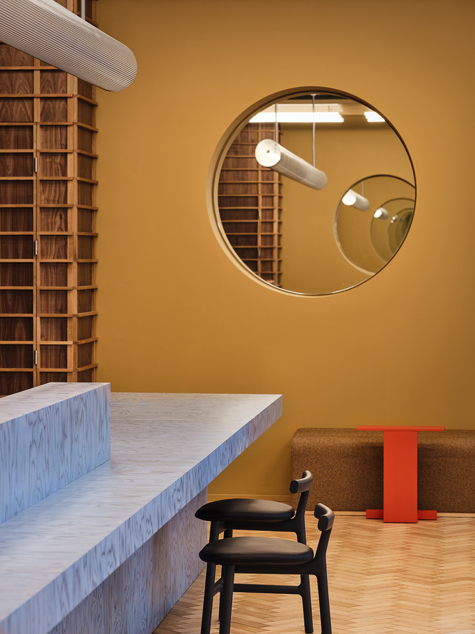 While in the case of the historic Art Deco building dating from the 1920s, Note Design Studio’s approach hinged primarily on using Nordic understatement to elevate the premises to new and radiant heights, the six-floor building on Great Titchfield Street presented the designers with new challenges. The existing structure dating from 1933 possessed a radically functional look. A strict pattern characterized the façades and the interiors. “It was our intention to break up that pattern,” is how Carlström explains the overall approach to converting the brick building, which is over 90 years old, into forward-looking premises for The Office Group with interiors that tell of a different time,” explains the architect. The old substance was redeveloped respectfully, historic details and elements refurbished. To create an organic shape in the long corridor an undulating wall made of glass bricks dyed pale blue forms a counterpart to the strict pattern. The conference rooms are located behind this. Where four staircases divide up the ground floor into three zones the hope is that the undulating glass wall will make for a new connection with these segments of space.