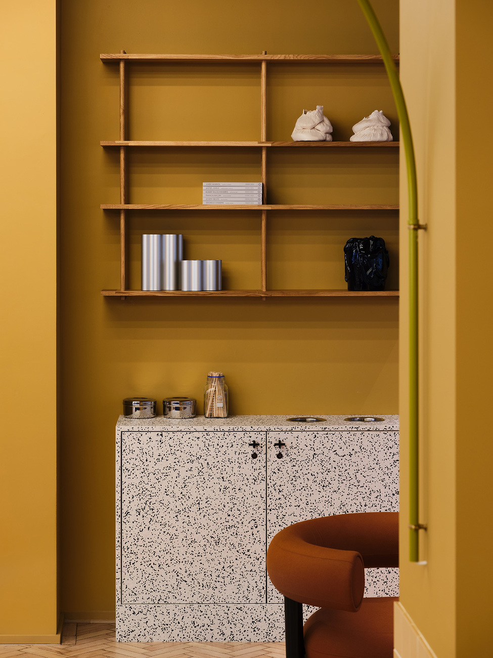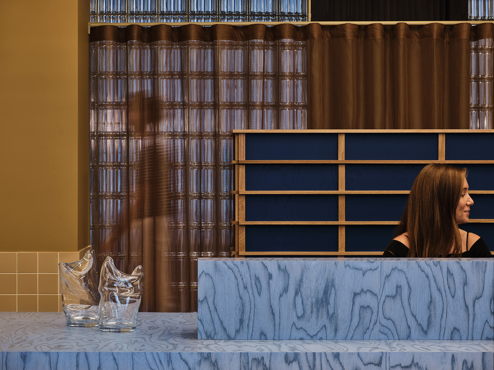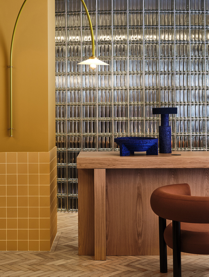 The pale blue solid wood chairs are from the collection “Curv” by Swiss designer Jörg Boner for a German brand, Stattmann Neue Möbel, the “K65” bar stool is an Artek classic by Finnish furniture designer Alvar Aalto. And the sculpturally sweeping curved wall lamp by Belgian design duo Muller van Severen was manufactured by Antwerp-based label Valerie Objects. A whole string of custom-made products such as the many fixtures and fittings complete this wild ensemble. It is more like a canvas to be painted on, is the way that Carlström describes the selection process. “Every stroke of the brush counts and makes its own impression. We proceeded in a similar manner in our choice of furnishings – extremely carefully. The fact that this bold concept actually works is demonstrated right at the reception where there is a particularly eye-catching piece – the counter boasting a powder-blue wood veneer by Alpi from the first Memphis collection, as if introducing a touch of Ettore Sottsass.