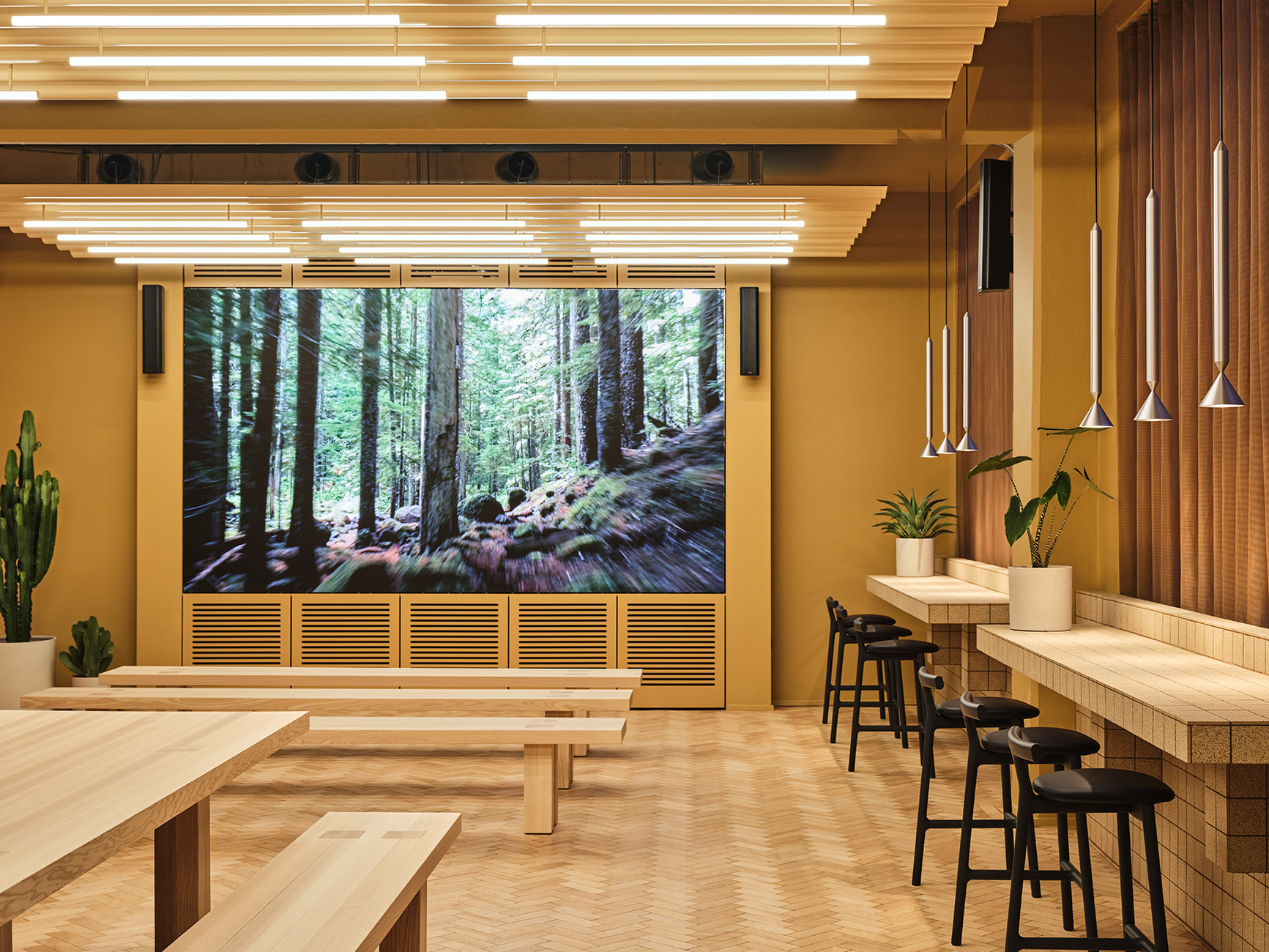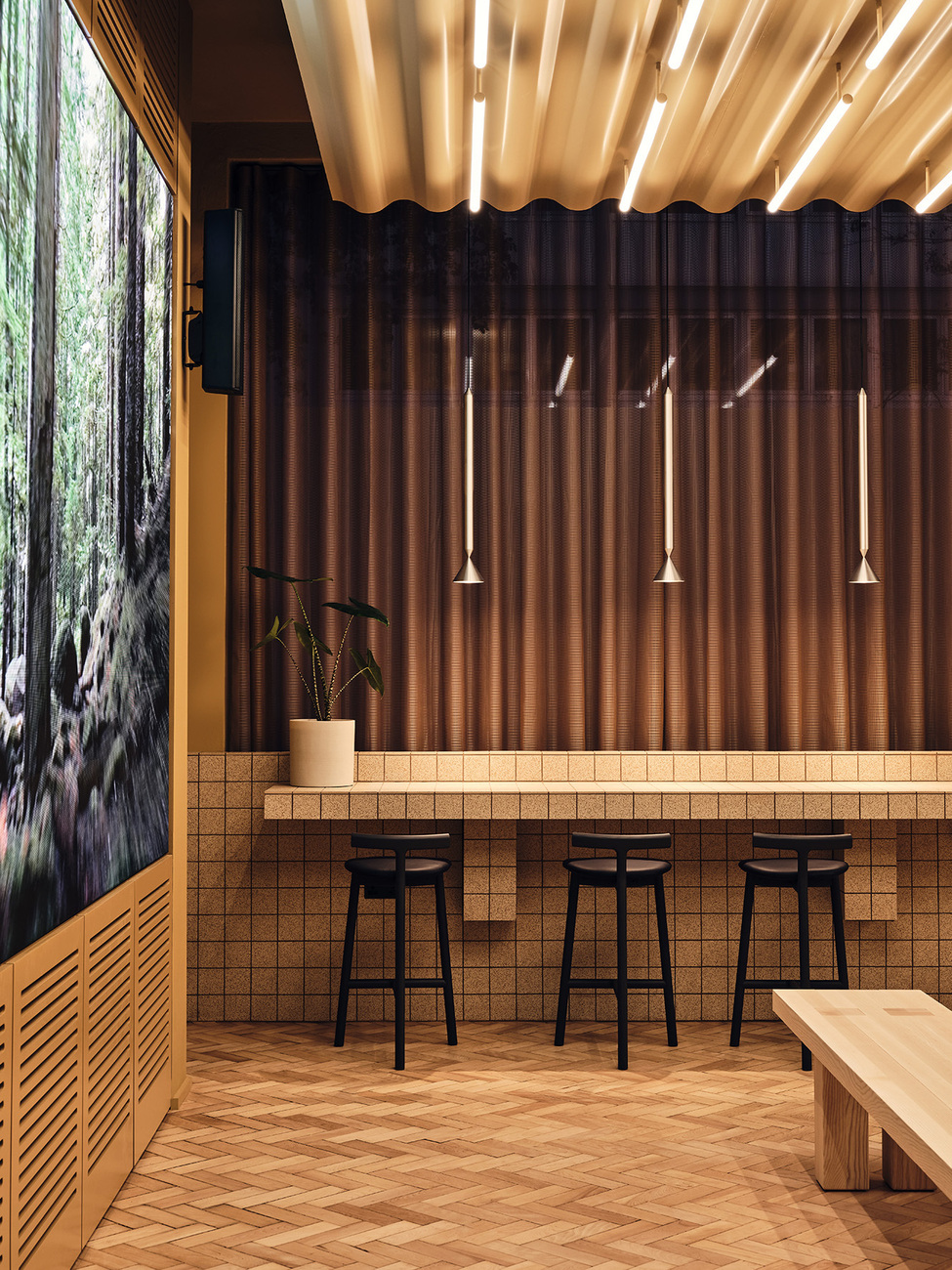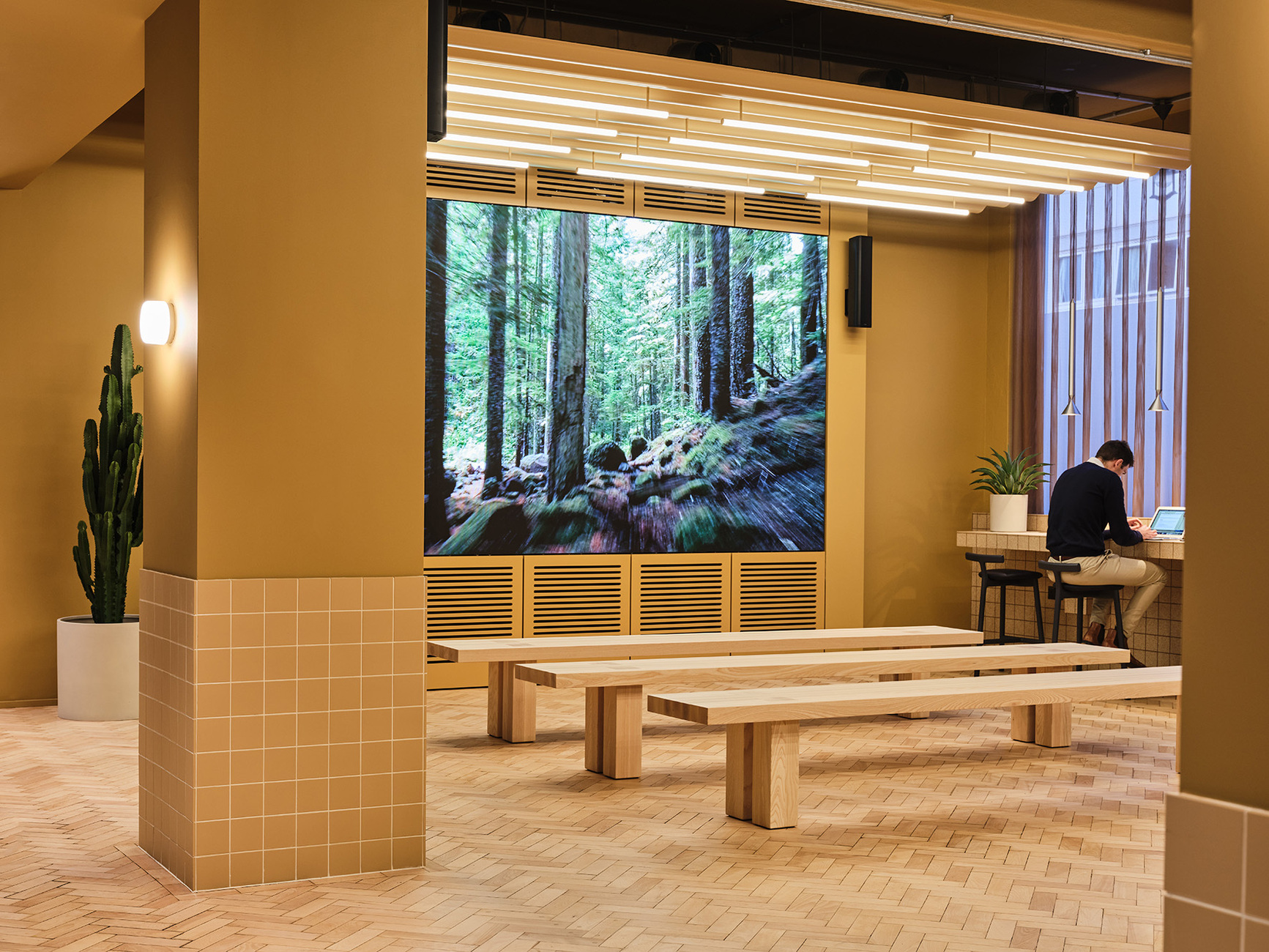 TOG founders Olly Olsen and Charlie Green once again turned to the creative team at Note Design Studio when it came to handling the concept and interior design of “Douglas House”, which opened recently. Back in 2019, the collective headed by Johannes Carlström and Cristiano Pigazzini transformed “Summit House” in Holborn into a flexible working space for the Group. In this instance, minimalism meets an apparent harmony between caramel, deep red, and shades of green of the kind that would doubtless appeal to the aesthetics of the filmmaker Wes Anderson.