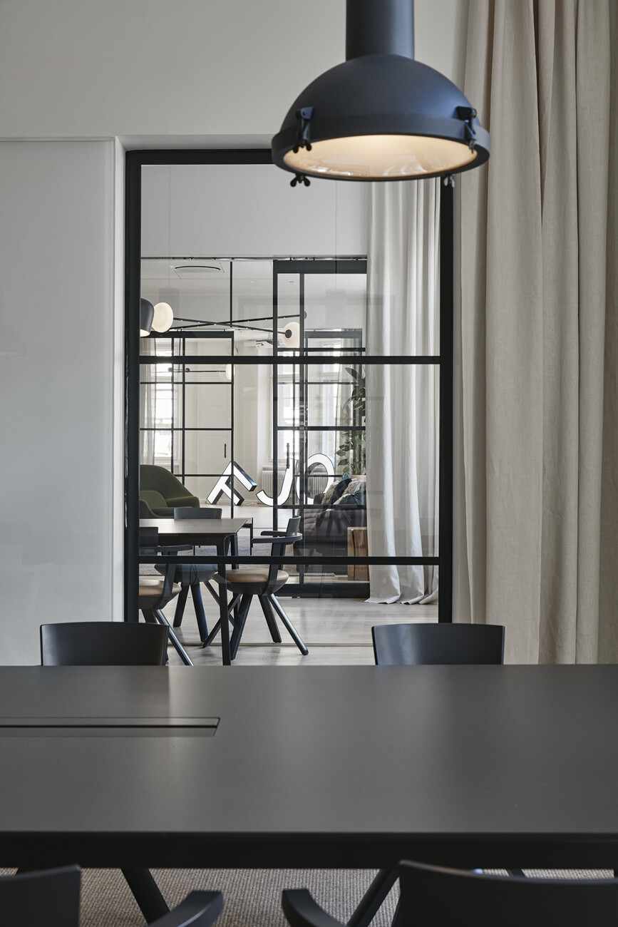 Laajisto looked to high-quality natural materials for the 1,000-square-meter office space. Sisal rugs are spread out on the impact-sound-insulated oak parquet flooring. Moreover, numerous plants improve the indoor climate. To divide up the space the interior designer used full-height glazed steel-and-glass partitions; the linen curtains can be drawn for greater privacy. The homely character of the office is underscored by the lounge areas and particularly the cozy and generous kitchens Joanna Laajisto has created for the employees.