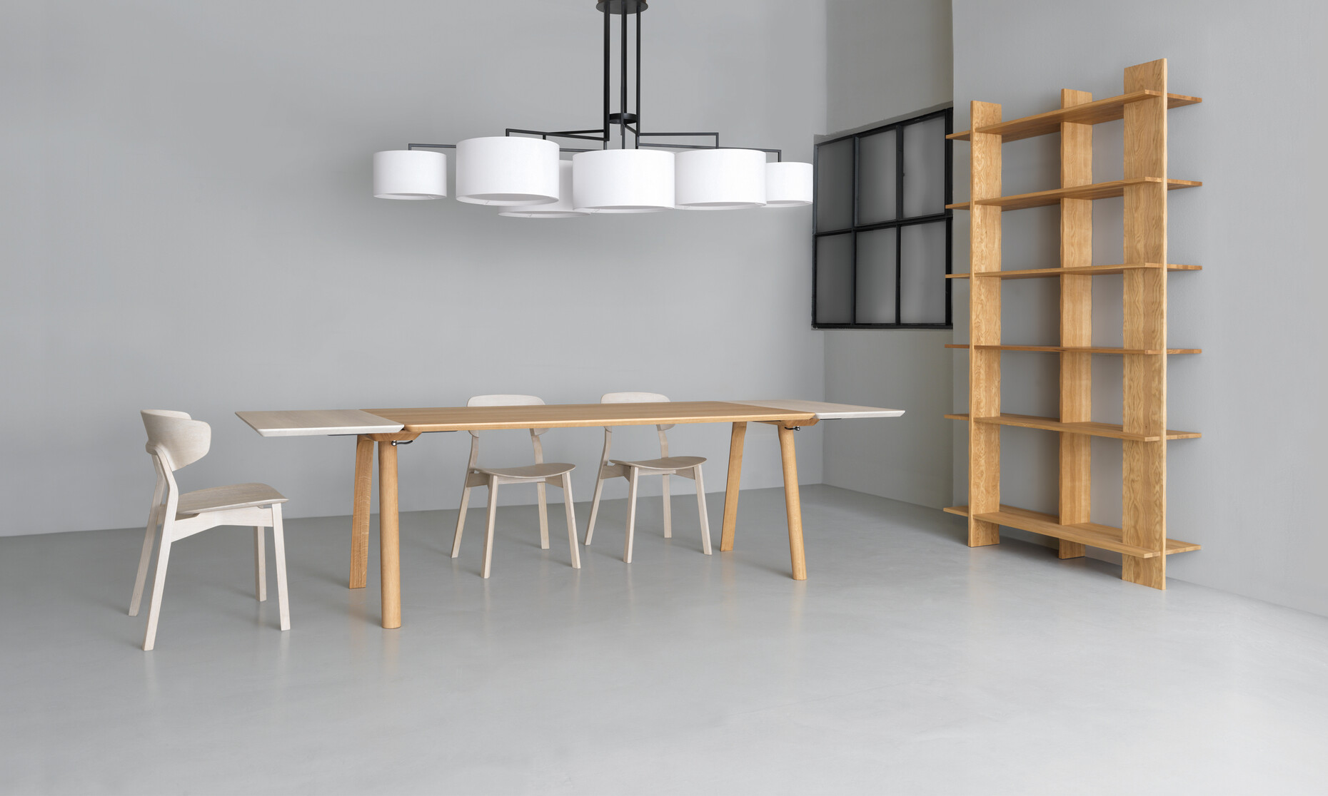Sebastian Schneider: Our first idea came from the fact that, in principle, the length of a table top is fixed – at least, when it’s made of solid wood. So we said: You can have several table-tops that abut lengthwise. And then we got the idea of placing the table leg directly under the joint, so you don’t need two sets of legs, and can add tables as needed. We were inspired by a bridge in which two concrete sections meet on a pier. We have always been interested in the principle of reduction.
