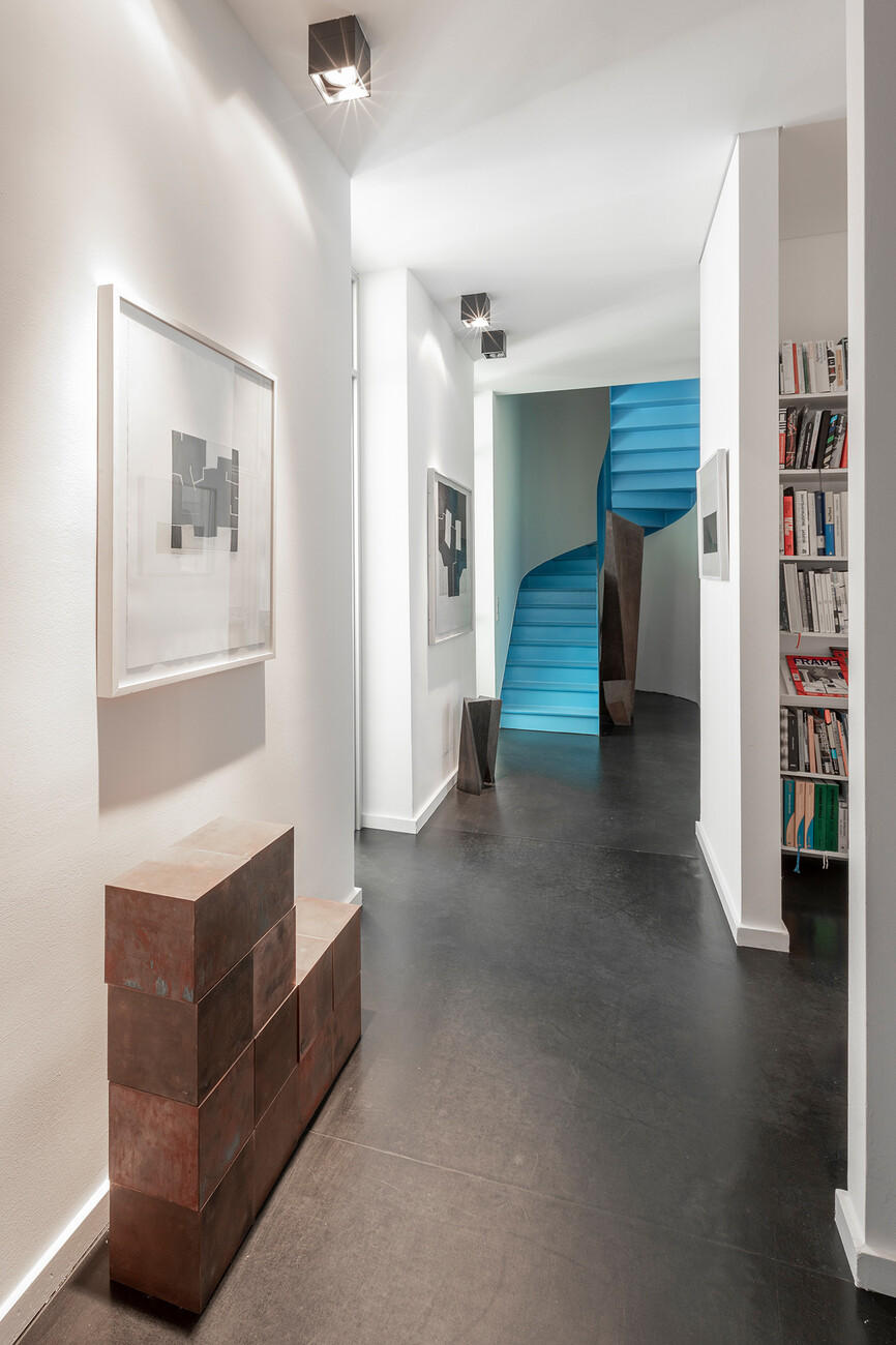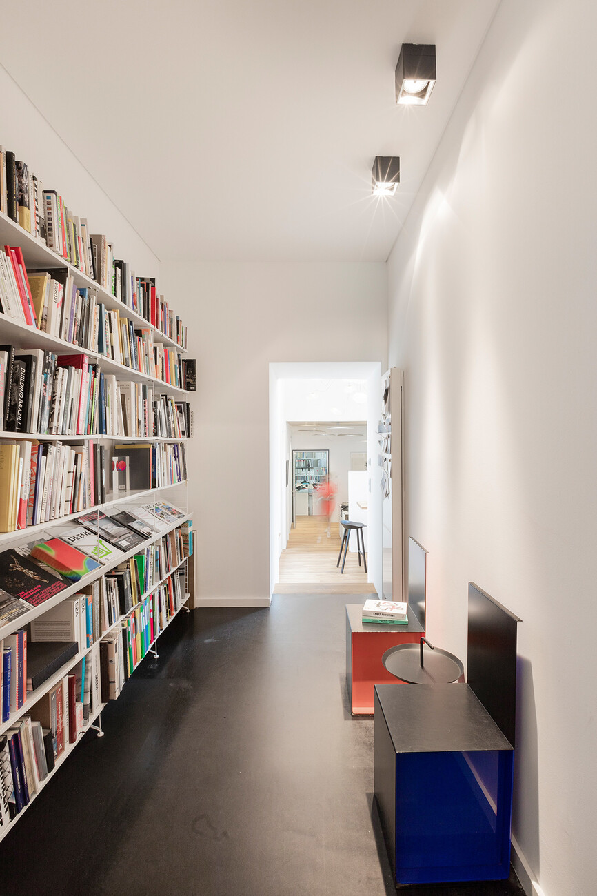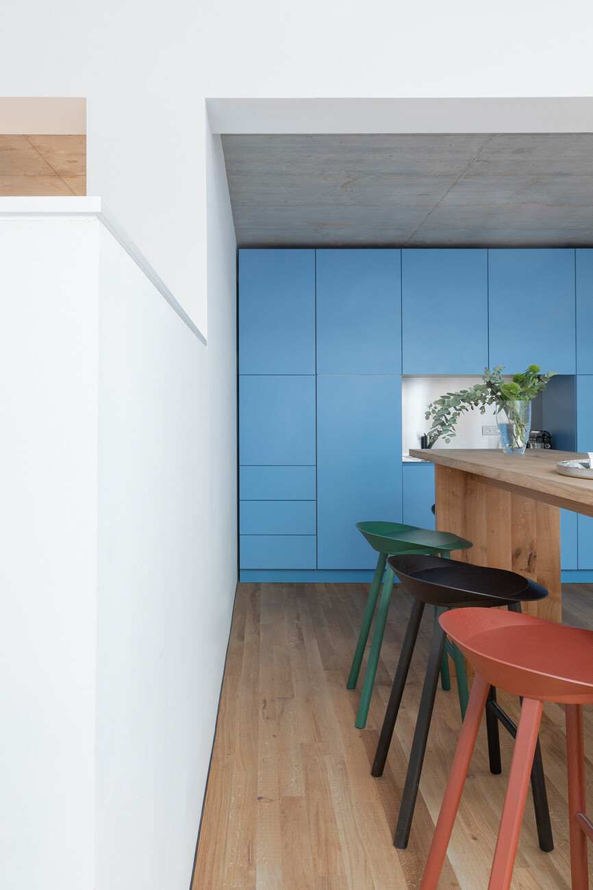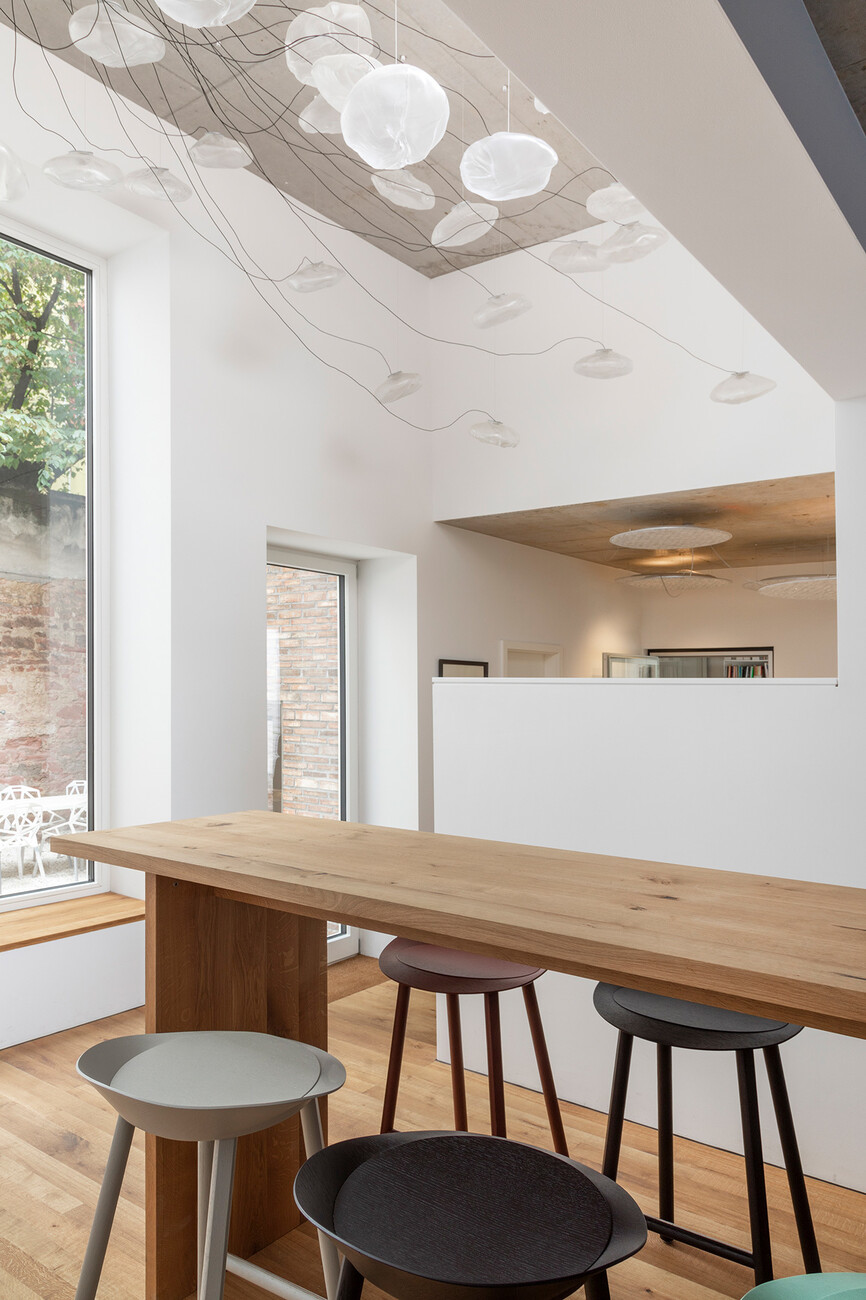 The interior spaces clearly demonstrate the meaning of the concept of “spatial experience”, which plays a key role in the work by Nicole Kerstin Berganski and Andreas Krawczyk. The one-story connecting structure, for example, which hosts not only multiple workstations but also the new lounge area, is an elongated room that is effectively broken down into different areas by two differing ceiling heights and floor levels. Through windows oriented towards three different points of the compass, the architects have achieved a huge spectrum of lighting ambiances. These design principles are continued in the two apartments on the upper floors. Here too, NKBAK manages to break up the apartments simply with differing floor and ceiling heights and almost entirely without dividing walls. Thus, despite the very limited floor space, the impression is one of breadth and spaciousness. This is enhanced by the private outside areas belonging to each of the two apartments. They are more than just mundane balconies; rather, they create a veritable private outdoor refuge for residents.