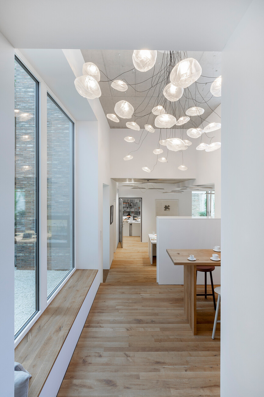 For this challenging commission, Robert Volhard approached Frankfurt-based architecture firm NKBAK. Nicole Kerstin Berganski and Andreas Krawczyk, the founders of NKBAK, are not only two of the most interesting young architects in Germany but have also collaborated with Stylepark on multiple exhibition projects already. Nevertheless, these works were always of a temporary nature. “We had already worked with Nicole and Andreas on an award-winning stand design for Schneider Electric at the Light + Building fair, and on an extraordinarily beautiful exhibition at the Audi Urban Future Award,” says Volhard, explaining his choice, “so I was then very keen to work with the pair on a building.” NKBAK represented the ideal contact for many of the client’s requirements. “I had the idea of creating a building inspired by modern Japanese architecture. Nicole and Andreas, who had both spent several years working for SANAA, fleshed out this architectural notion,” says Robert Volhard, outlining the common ground on which the partners based the project. Working with different ceiling and floor levels is also characteristic of the projects by NKBAK, Volhard enthuses: “What was also important for me was that the new courtyards would bring plenty of light and air into the rooms and also make them pleasant places to spend time. As a team, we would frequently use the former courtyard for shared meals or barbecues, so I wanted to ensure that was still possible. I also wanted there to be plenty of lines of vision into and through the rooms to give a sense of space even within this limited area.”