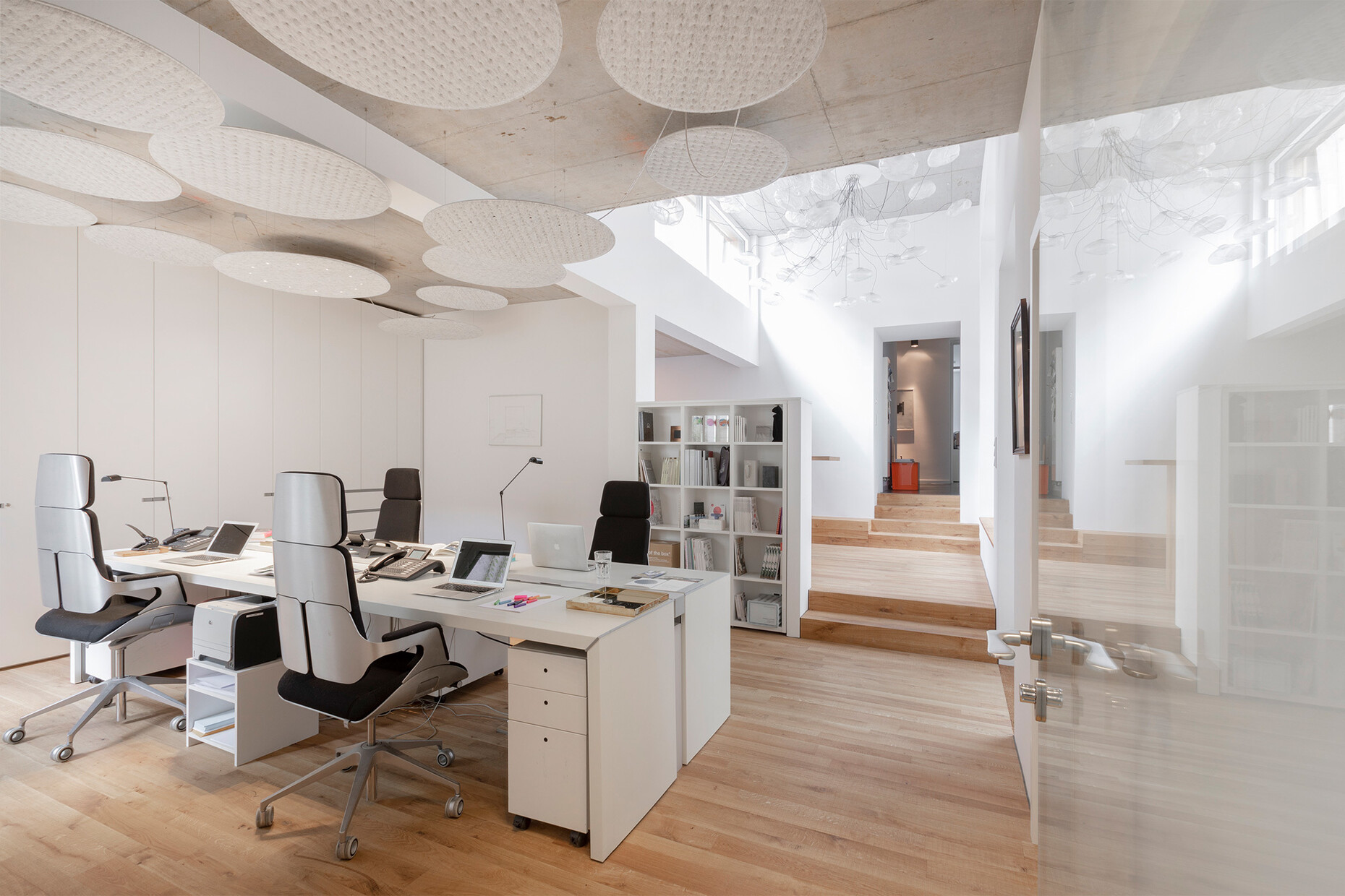 As for the external structure, in the interior it is less the spectacular gestures and more the keen sense of nuance that defines the new building. Here too, closer inspection reveals the obsession with quality among all those involved. Hence, for example, the rough-cut oak planks were manufactured and installed by an Austrian joinery, which boasts Pritzker prizewinner and detail fanatic Peter Zumthor among its clients alongside NKBAK. In the lighting and the furniture too, both client and architects chose carefully: Under the high ceiling in the common lounge area, 32 lighting elements from the “73” series by Bocci have been installed, and the extravagant “38” lights in the small courtyard also came from Bocci. Meanwhile, light and concentration at the workstations are ensured by the combined lighting and acoustic elements “Lighting Pad R” from Nimbus, while the “Annex Ceiling” lights in the two apartments came from Serien Lighting. The cupboard elements in the office were supplied by Interlübke, and the classic designs from String were installed as a shelving system. The table and bar stools for the lounge area came from e15. “The new office spaces are not just a visual delight – they foster internal communication and team spirit while supporting focused and inspired work.”, enthuses Franziska Michaelis, Board Member of Stylepark.