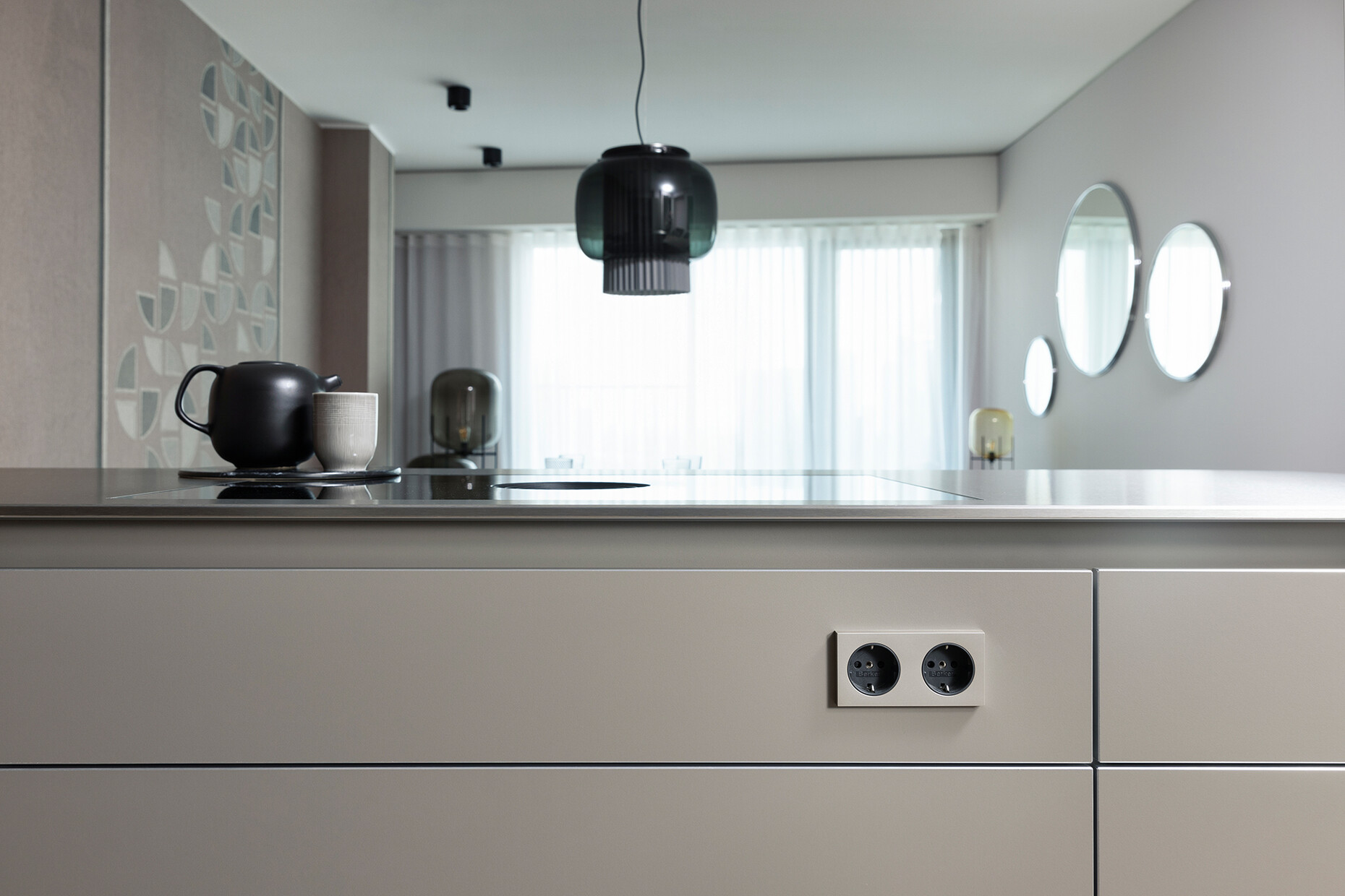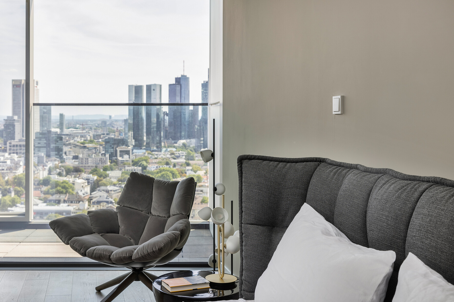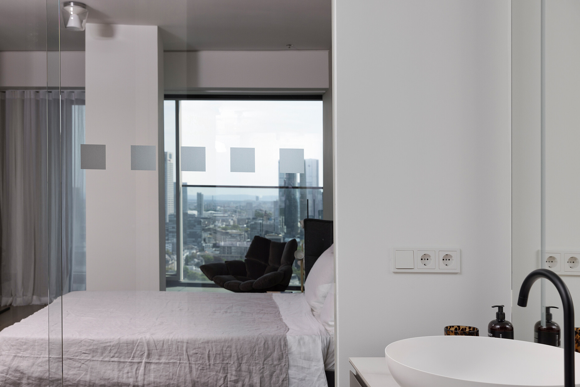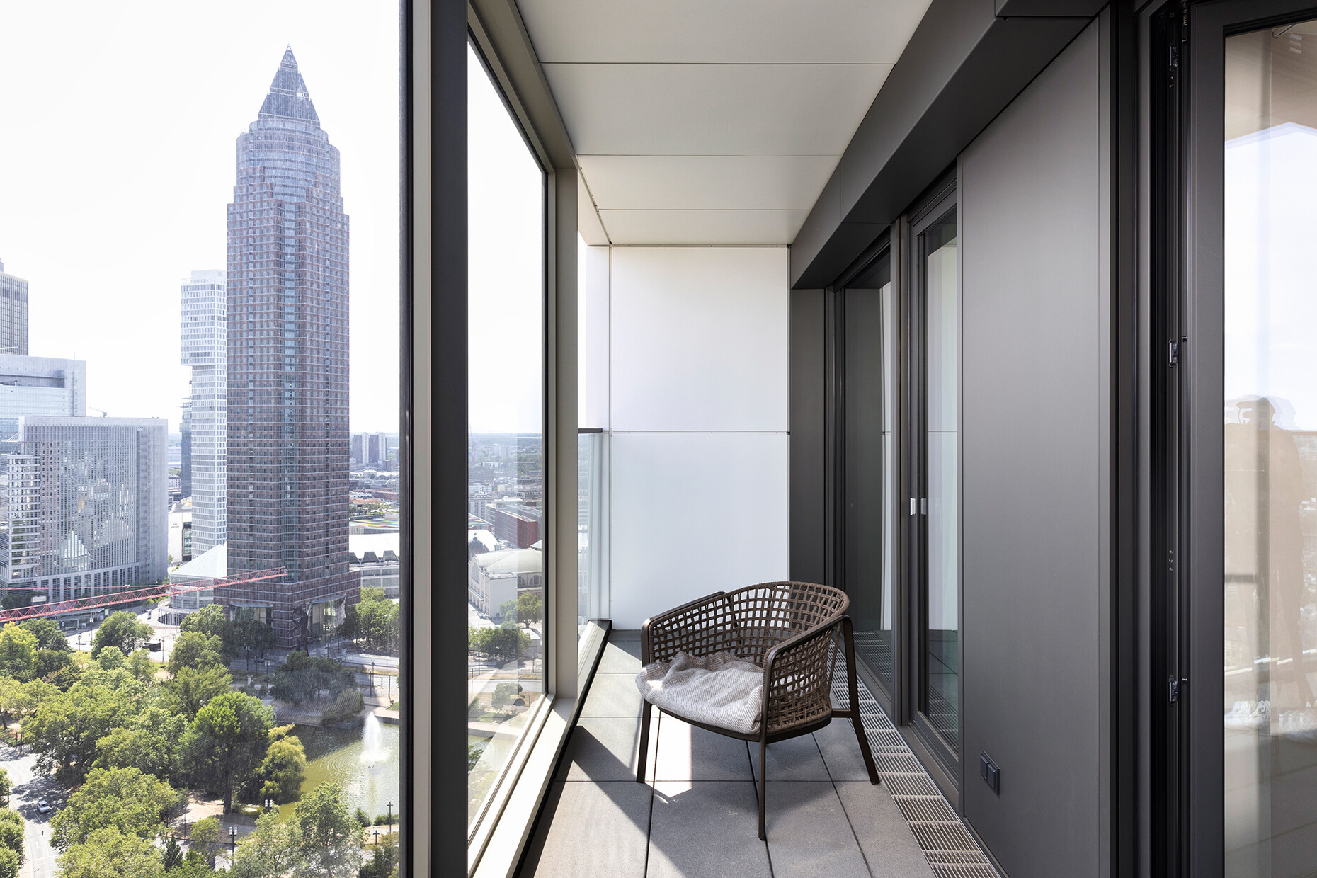 The high quality of the apartments at "One Forty West" can be seen, among other things, in a model apartment created by designer Sebastian Herkner. "It reminds me of a comfortable nest above the metropolis," Herkner says of his design. "My fictional resident is someone who may still live somewhere else but works in Frankfurt, who orders something from the concierge on the way up after work and then ends the day with a glass of wine on his or her balcony." The intention to create apartments with real style extends to the switches, for which the designer chose the "Berker Q.3" switch range from Berker. With their clear contours and flat switching angles, they not only blend into the overall ambience perfectly, but offer a pleasurable feel as well. And as they have the necessary seals, they are IP-44-capable, which makes them the right choice for splash-proof applications both outdoors and in damp rooms. Finally, a metering system from Hager measures consumption per floor in the individual residential units. As a modular technology system equipped with intelligent meters, the system ensures the apartments in "One Forty West" not only have a pleasant ambience, but also a consistent energy supply that ensures they stay this way.