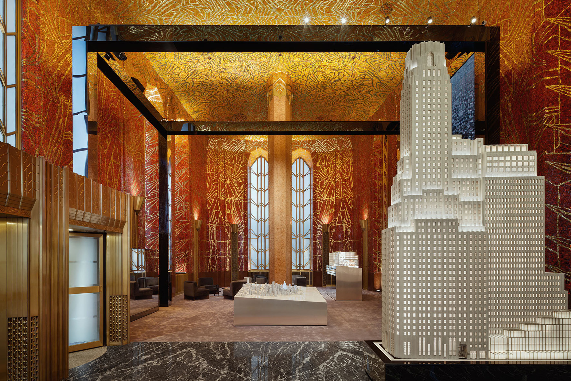 The architectural historian says, "There are two types of skyscrapers here. One is the slender Superslim towers or the Wedding Cake type with its various set-backs, which came after the 1916 Zoning Resolution." The resolution was a direct response to the slouched Equitable Building, which obscured neighboring streets. One Wall Street also features those setbacks, which taper the building upward. Ralph T. Walker - about whom Frank Lloyd Wright once said, "The only other honest architect of America" - had built the structure for a major bank called the Irving Trust Company. He used limestone instead of brick for the facade design that remains so characteristic today, although more expensive and less typical of the period. 50 floors were occupied by the Tower, completed in 1931, which at 199 meters was the tallest building in the city at the time. In the 1960s, Walker added a stylistically appropriate 28-story annex to the south side of the tower, so that today the complex spans an entire block. On the first floor, R.T. Walker surprised bank customers with a veritable orgy of color: The now-restored, ten-meter-high Red Room in the skyscraper's entrance area is considered the pearl of Manhattan and is lined all around with a mosaic in red and gold created by New York mural artist Hildreth Meière. And perhaps this tower, together with its mosaic entrance, would no longer exist today if the building had not been listed as a historic monument.