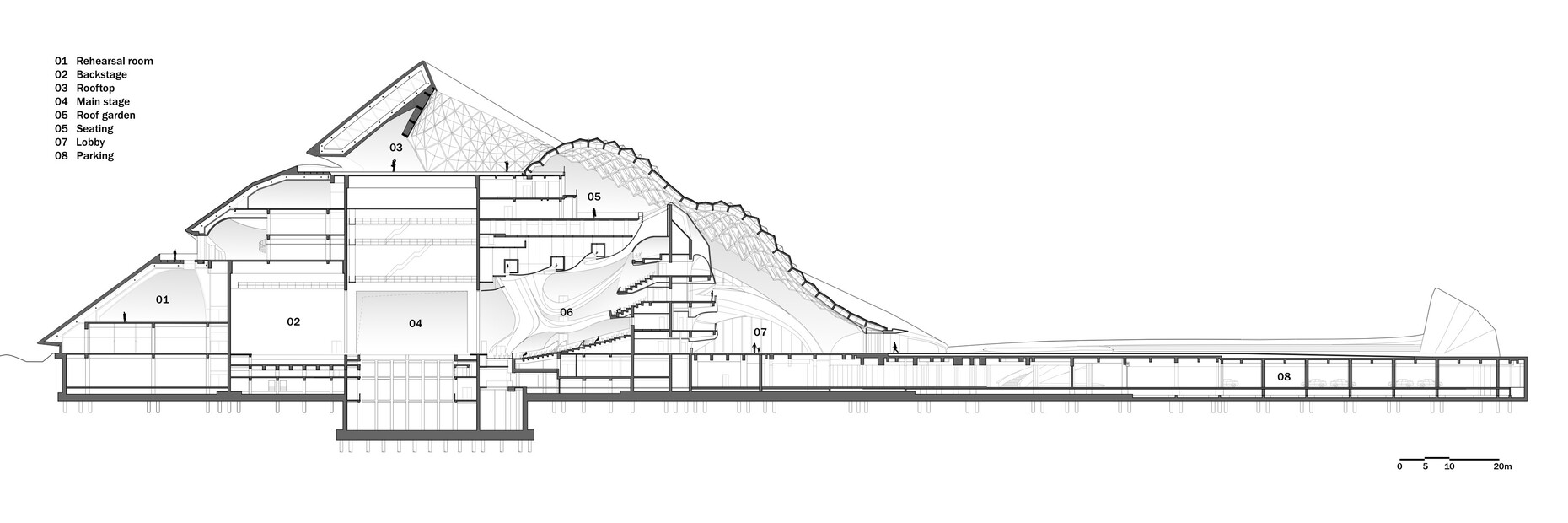 Alongside the main opera building with its two concert halls and a total of 2,000 seats there is a small office building and, slightly to one side, another structure housing a hotel, restaurant, and a small exhibition space. All three buildings are arranged around an artificial lake, with the architecture and countryside melding. Indeed, where the soft angle of the main building touches the ground a public space arises that in turn culminates in a bridge that leads across the artificial lake. On the shore on the other side the élan of the building seems to give birth to the hotel. With or without snow, it is hard to distinguish the building from the park.
