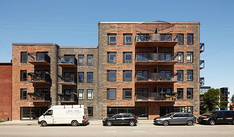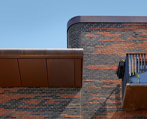 Located on the corner of Jydeholmen and Indertoften in the Copenhagen suburb of Vanløse, Hebsgaards Have senior citizens’ home is constructed with handmade red and black bricks. These come from the renowned Danish brickworks Petersen Tegl, one of the few factories in the world to fire its bricks using coal. The process gives rise to an interplay of dark and light hues on the brick surface, which animates the architecture.