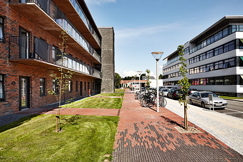 The paths surrounding the senior citizens’ home feature the same bricks as the building façade, which thus appears to extend out to them. The integrated pattern guides pedestrians along the building to the street corner.