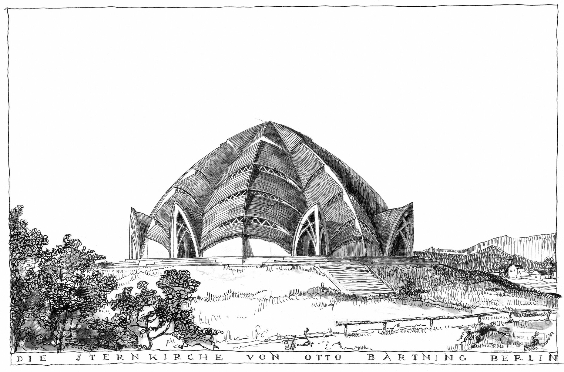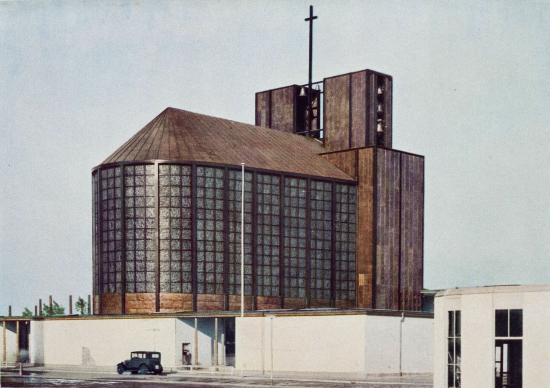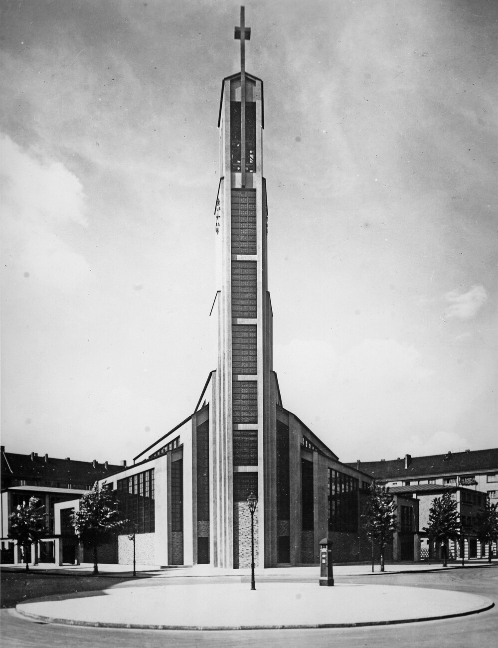 He was exempted from military service and during the war years wrote his fundamental treatise “Vom neuen Kirchenbau”; after the end of the war he applied these theoretical principles on church architecture in the most famous of his church designs. In 1922, influenced in part by the Expressionism of the “Glass Chain”, he built a model for his spectacular “Sternkirche”, which was never built, following it up between 1928 and 1934 with three prototypical church buildings: the “Stahlkirche” for the Pressa exhibition in Cologne, a circular church (the Church of the Resurrection in Essen) and a fan-shaped church (the Gustav-Adolf Church in Berlin). Together the four designs captured his programmatic considerations on the use of new materials and his development of new church ground plans; they strongly influenced many of Protestant and Reform Church buildings to come. Alongside these pioneering designs he also produced various proposals for the Protestant Church. In particular after the end of his period as director in Weimar he was able to focus fully on this work, and by 1945 had realized churches and parish buildings in Karlsruhe and Görlitz, in Lisbon (Portugal), Heerlen (Netherlands), Barcelona (Spain) and Beirut (Lebanon). With his reputation as a moderate Modernist and church architect he was able to continue running his office in the capital city of what was now the Third Reich until 1942. It was only then, after his Berlin studio had fallen prey to an Allied bombing raid and his son Peter had died in combat, that the family moved to Neckarsteinach near Heidelberg, where Bartning spent the last years of the war working on the revitalization and conversion of the Church of the Holy Spirit.