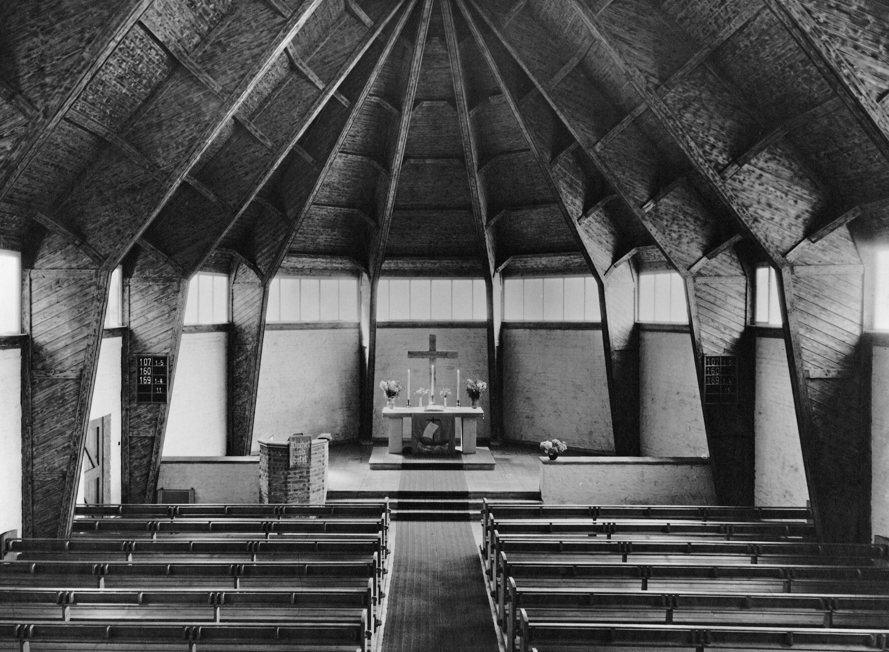 It remains unclear why he stayed in Germany and he and his family found some modus vivendi with the Nazis. He seems never to have joined the Nazi Party, he withdrew from various associations when the Nazis took them over, but remained in others. There is no record of his having supported people persecuted by the Nazis or forced into exile. He turned down a pre-War invitation to Argentina, and with terse wording after the war he described how he had “wanted to survive things here, resisting in silence”. At any rate, he made sure his good network survived the war, and was soon made President of Bund Deutscher Architekten, Deputy Chairman of the Werkbund, was a founding member of the Architecture section at the Akademie der Künste and in 1954 appointed Urban Planning Adviser to West Berlin and, in 1957, Director of the Interbau. It is astonishing how Otto Bartning preserved a sterling reputation irrespective of all the upheaval going on around him, and maintained a standing as a moderately progressive and also evidently very diplomatic strategist, one who certainly did not lean too far out of the window for his convictions. After the war he embarked on the last stage of his work as a church architect: for the Emergency Churches Program launched by the Protestant Church he developed four types of easy-to-build church structures that parishes could largely build themselves. Most of the parts of the interior, such as the gallery, the seating, the windows and doors could be prefabricated using a module grid system. By 1953, over 100 churches were built to Bartning’s plans in all four of Germany’s occupation zones.