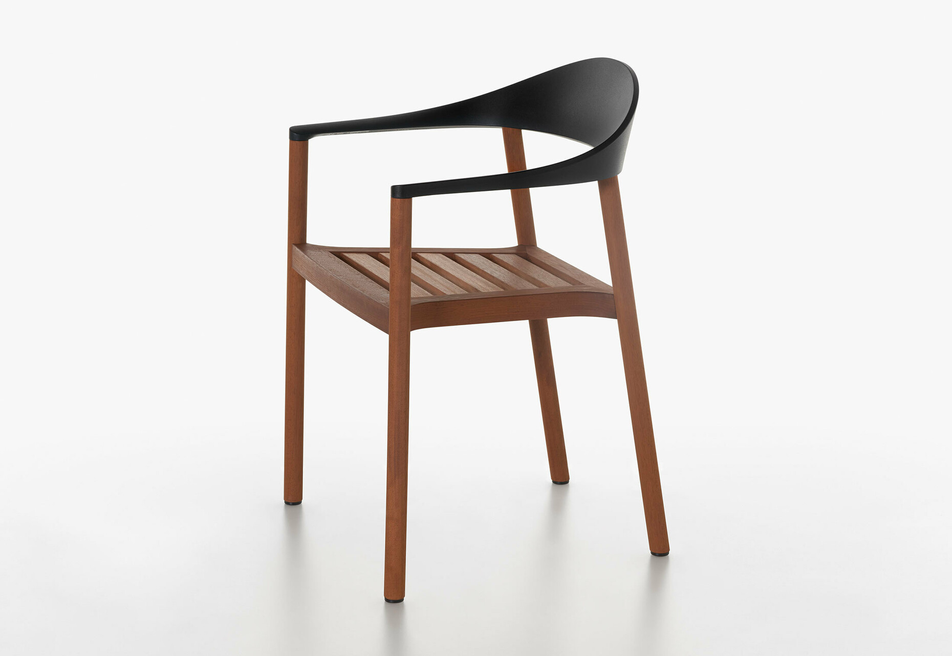 Naturally, chairs that are at home in both the indoor and outdoor world are likely to be popular in outdoor spaces: Eugeni Quitllet loves things of a synthesizing nature and has created a chair that is a real eyecatcher in the form of “Soul Outdoor” for Pedrali – tubular aluminum is combined with teak slats to form a whole that pleases the senses, a product that unites artisanship and technology. “Elio” by Yabu Pushelberg for Tribù creates a cocoon effect. There is something both natural and low-key about the hand-woven seat combined with a teak frame. In “Monza Outdoor” for Plank, Konstantin Grcic produced a striking, clear design in which iroko wood and polypropylene enter into a symbiosis. The color range of brown and black tones underscores the chair’s elegant, timeless quality.